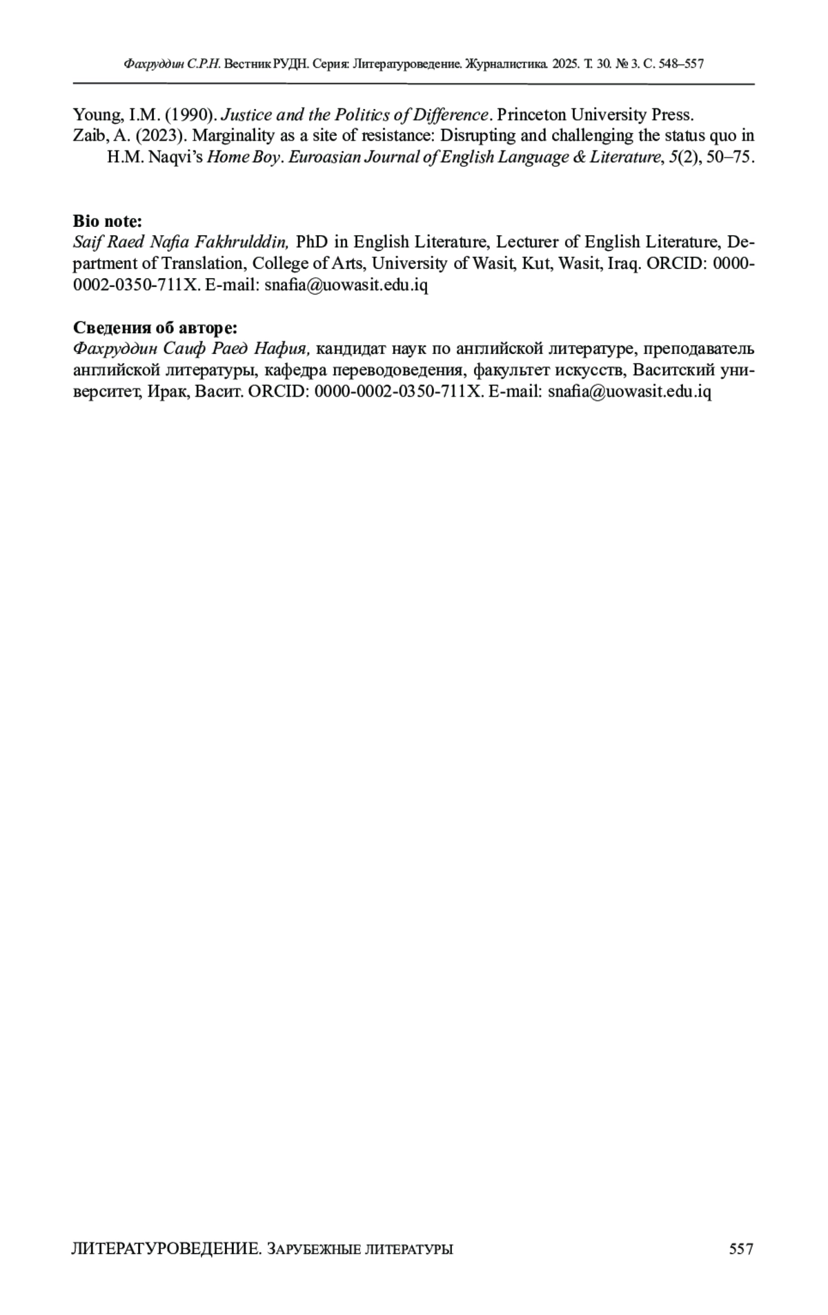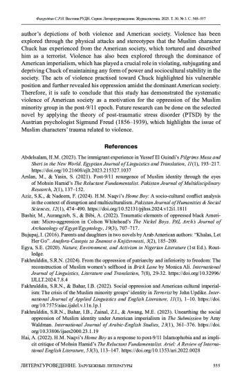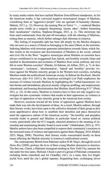 15. Khalid, A., Rehman, F.U., Saddique, Z., Ruqaiya, U., & Ilyas, M.Z. (2023). Relinking structural violence: Social discrimination in Mohsin Hamid’s The Reluctant Fundamentalist. Journal of Survey in Fisheries Sciences, 10(2S), 3250-3263.