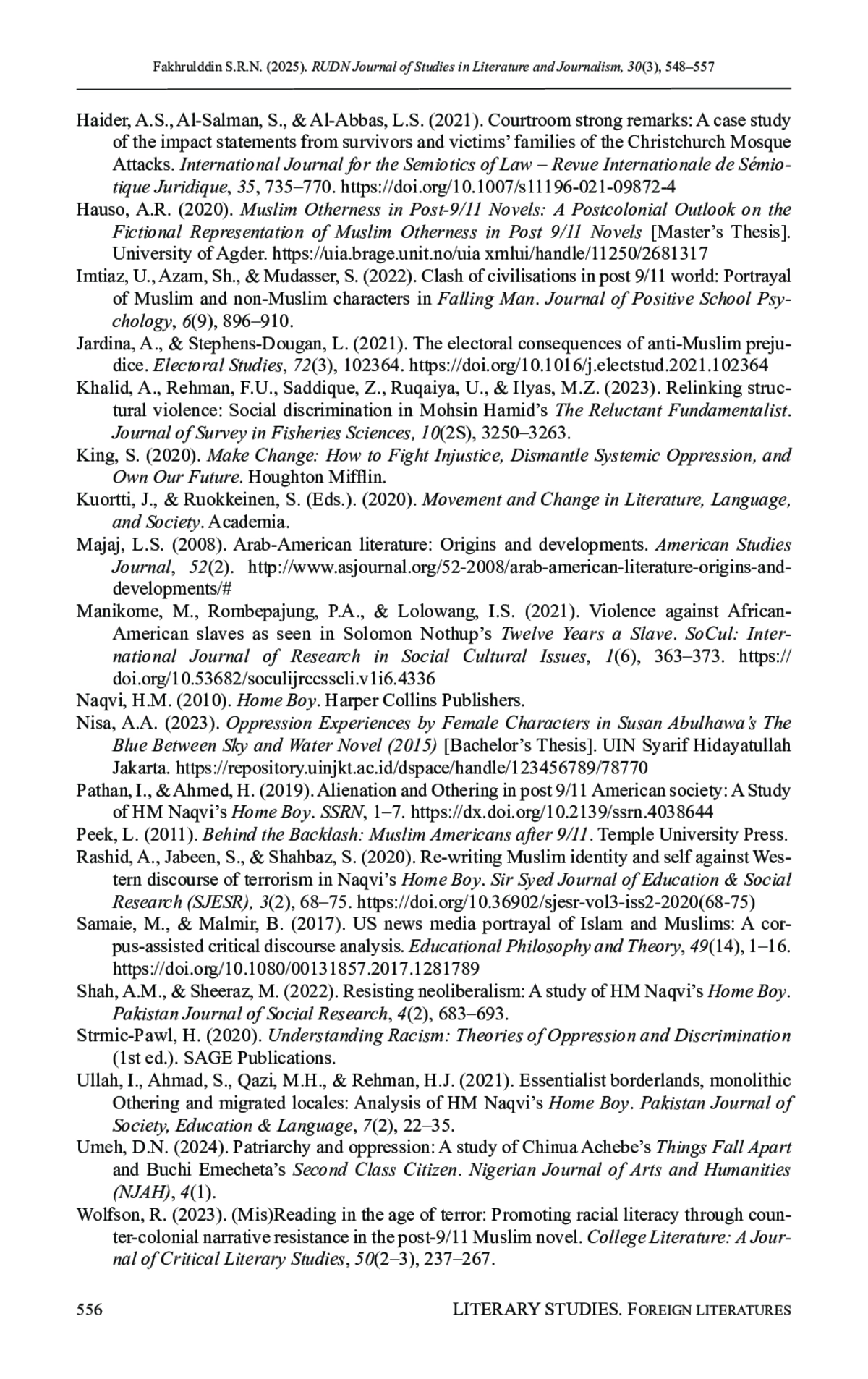 12. Hauso, A.R. (2020). Muslim Otherness in Post-9/11 novels: A postcolonial outlook on the fictional representation of Muslim Otherness in post 9/11 novels [Master’s Thesis]. University of Agder. https://uia.brage.unit.no/uiaxmlui/handle/11250/2681317.