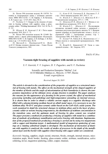Статья посвящена рассмотрению особенностей получения вакуумноплотных спаев сапфира с металлами. Выявлено влияние на механическую прочность профилированного сапфира количества блоков и угла разориентации их границ, обоснована температурная зависимость предельного напряжения разрушения труб, проанализированы причины появления огранки у выращенного кристалла, влияние механической обработки (шлифовки и полировки) и высокотемпературного отжига на внутренние напряжения. Показано, что для получения надежного токоввода в сапфировую разрядную трубку, наполненную плазмообразующей средой на основе паров щелочного металла необходимо использовать сплав ниобия НбЦу и стеклокерамический припой на основе системы окислов CaO–Al2O3. Подробно исследованы структурные изменения в сплавах ниобия и в слое стеклокерамического припоя при различных температурах пайки, распределение концентрации ниобия в переходной зоне, выявлен оптимальный режим пайки стеклоцементом. Рассмотрен новый способ получения спая сапфира с металлом комбинацией методов предварительной металлизации и активной пайки. Реализация предложенного способа получения спая осуществляется посредством использования двух магнетронов с медной и титановой мишенями. Разработана математическая модель магнетронного напыления покрытий на вращающийся цилиндрический образец. Проанализирован механизм взаимодействия титана с сапфиром, рассмотрены результаты исследований процессов в глубине слоя металлизации и на границе с сапфиром при пайке медным припоем.