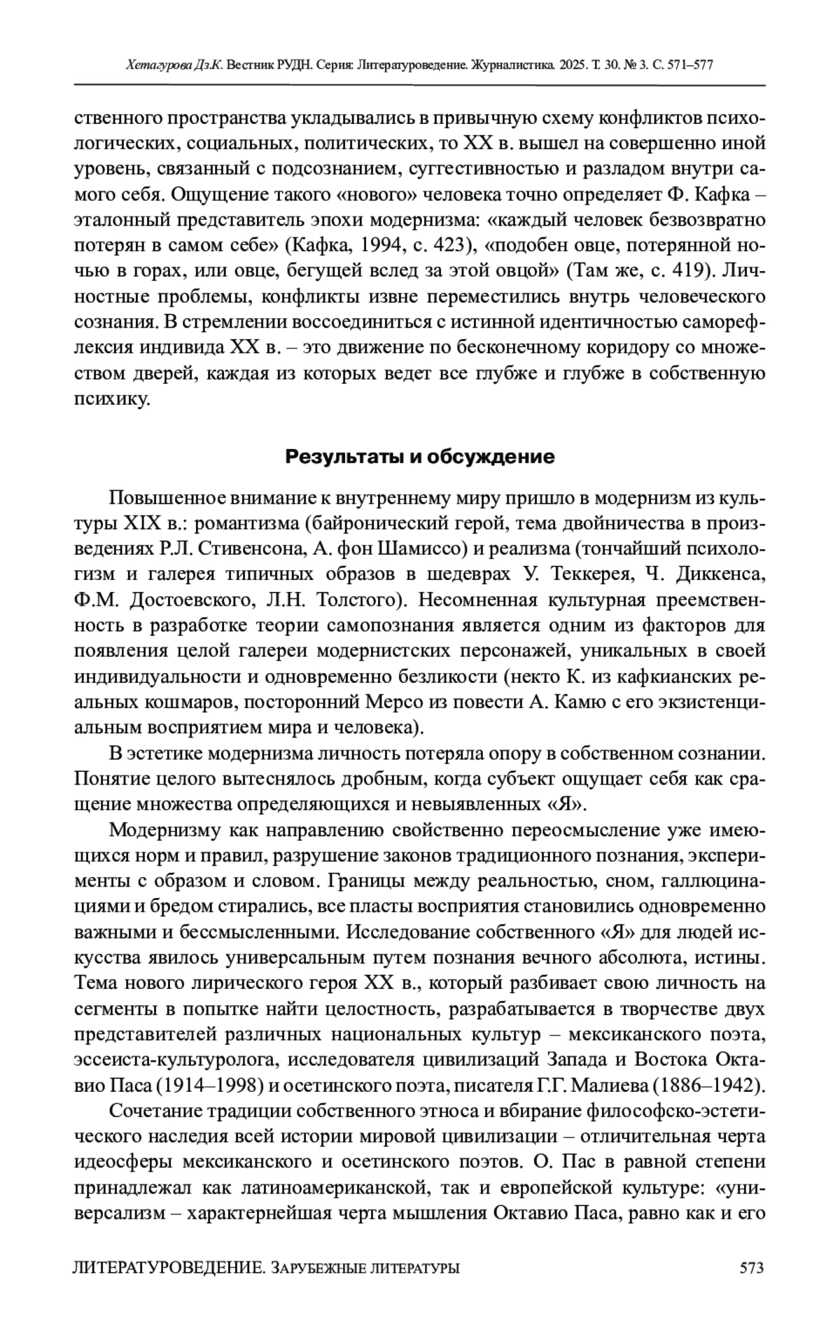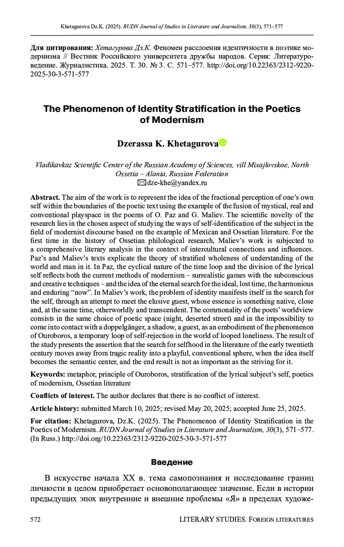 Цель - репрезентация идеи дробности восприятия собственного «я» в границах поэтического текста на примере сращения мистического, реального и условно игрового пространства в стихотворениях О. Паса и Г. Малиева. Научная новизна заключается в выбранном аспекте изучения путей самоидентификации субъекта в поле модернисткого дискурса на примере мексиканской и осетинской литературы. Впервые в истории осетинских филологических изысканий произведение Малиева подвергается комплексному литературоведческому анализу в контексте межкультурных связей и влияний. В текстах Паса и Малиева эксплицируется теория о расслоении цельности понимания мира и человека в нем. У Паса цикличность временной петли и разделение лирического «я» отражает как актуальные приемы модернизма - сюрреалистические игры с подсознанием и творческими техниками, так и идею извечного поиска идеального, потерянного времени, гармоничного и непреходящего «сейчас». У Малиева проблема идентичности проявляется в поиске себя, через попытку встречи с ускользающим гостем, суть которого в чем-то родном, близком и, одновременно, потустороннем и трансцендентном. Общность мировосприятия поэтов состоит в одинаковом выборе поэтического пространства (ночная, безлюдная улица) и в невозможности соприкоснуться с двойником, тенью, гостем как воплощением феномена уробороса, временной петли самоотторжения в мире закольцованного одиночества. В результате исследования представлено утверждение, что поиск самости в литературе начала ХХ в. уходит из трагической реальности в игровую, условную сферу, когда сама идея становится семантическим центром, а конечный результат не столь важен, как стремление к нему.