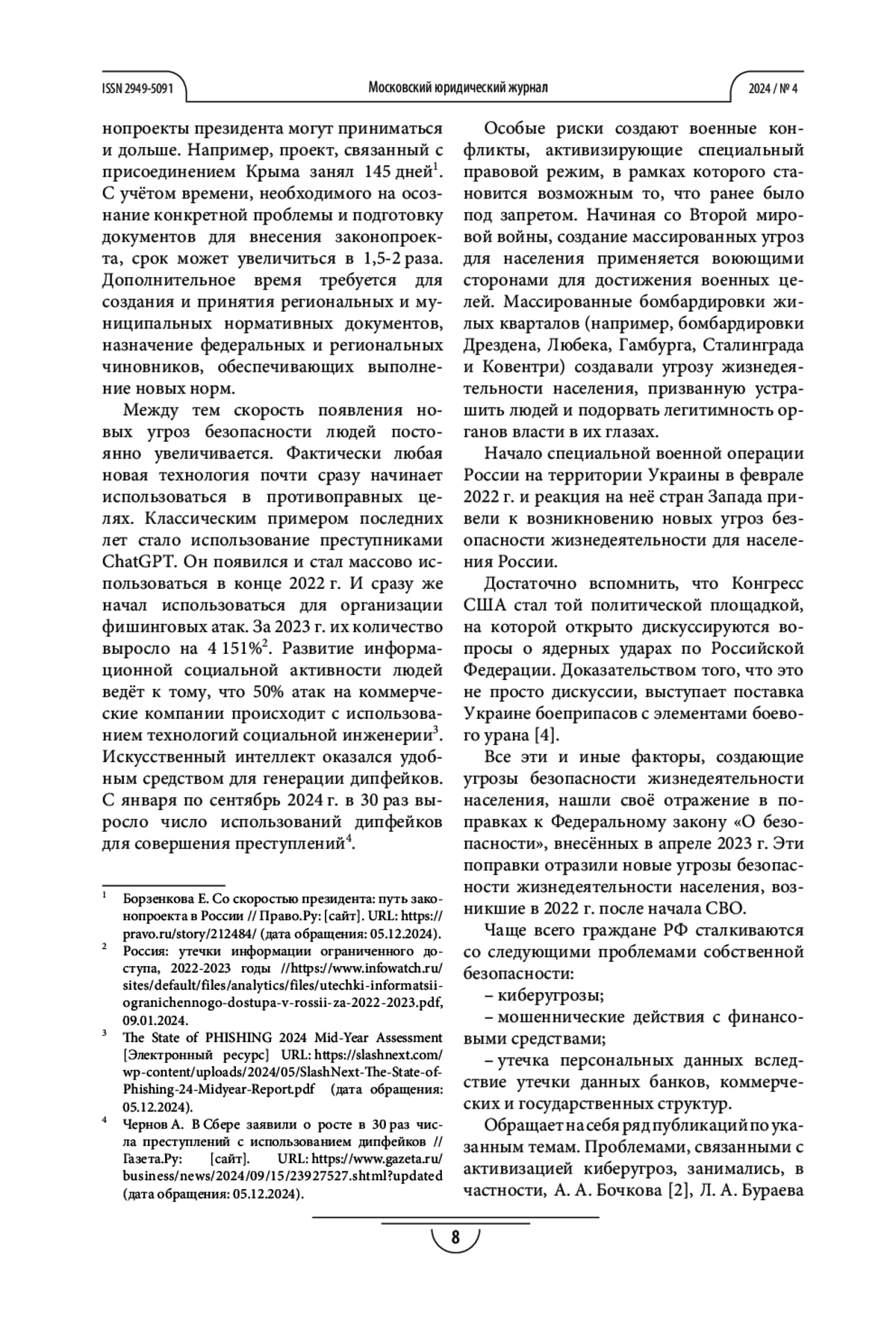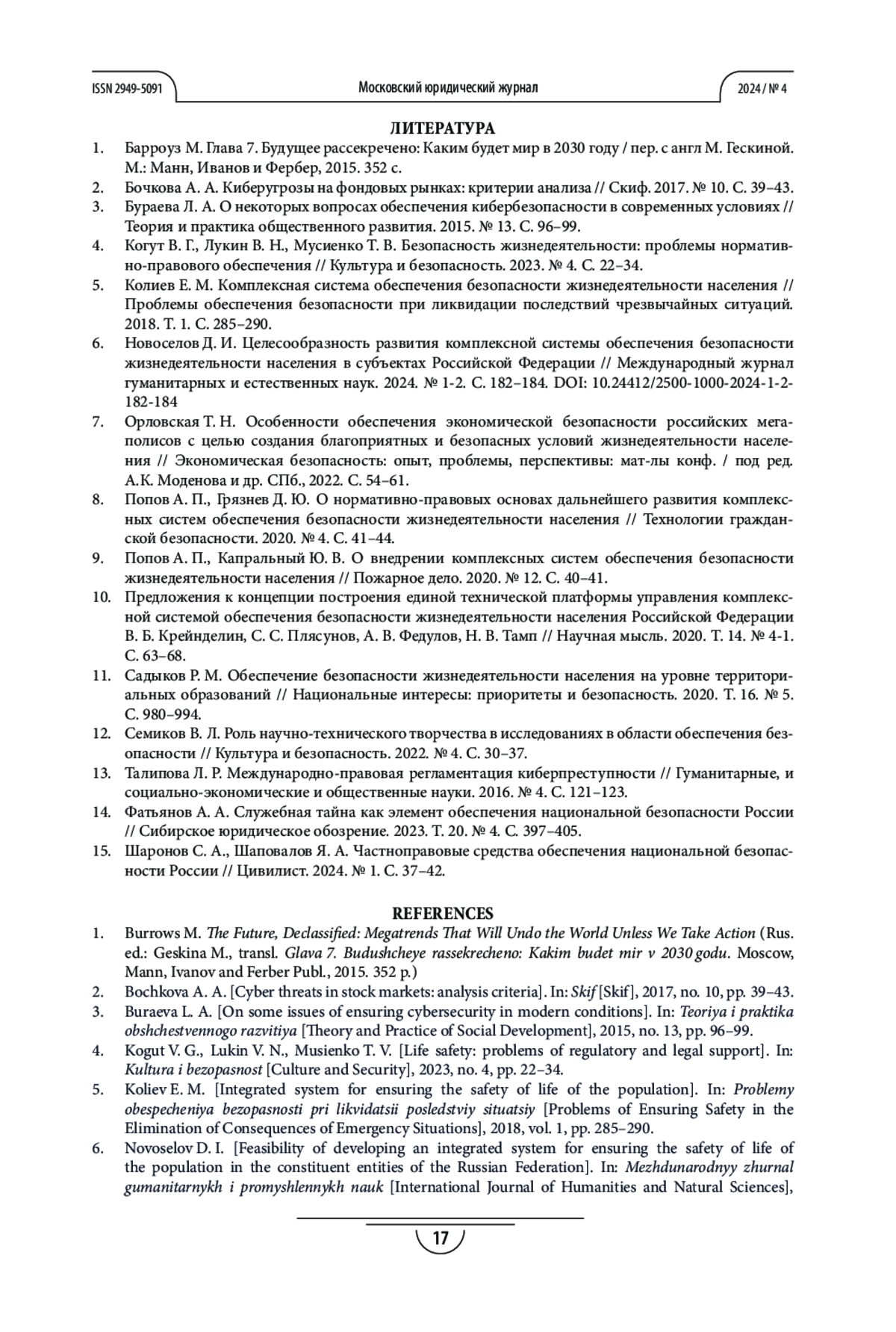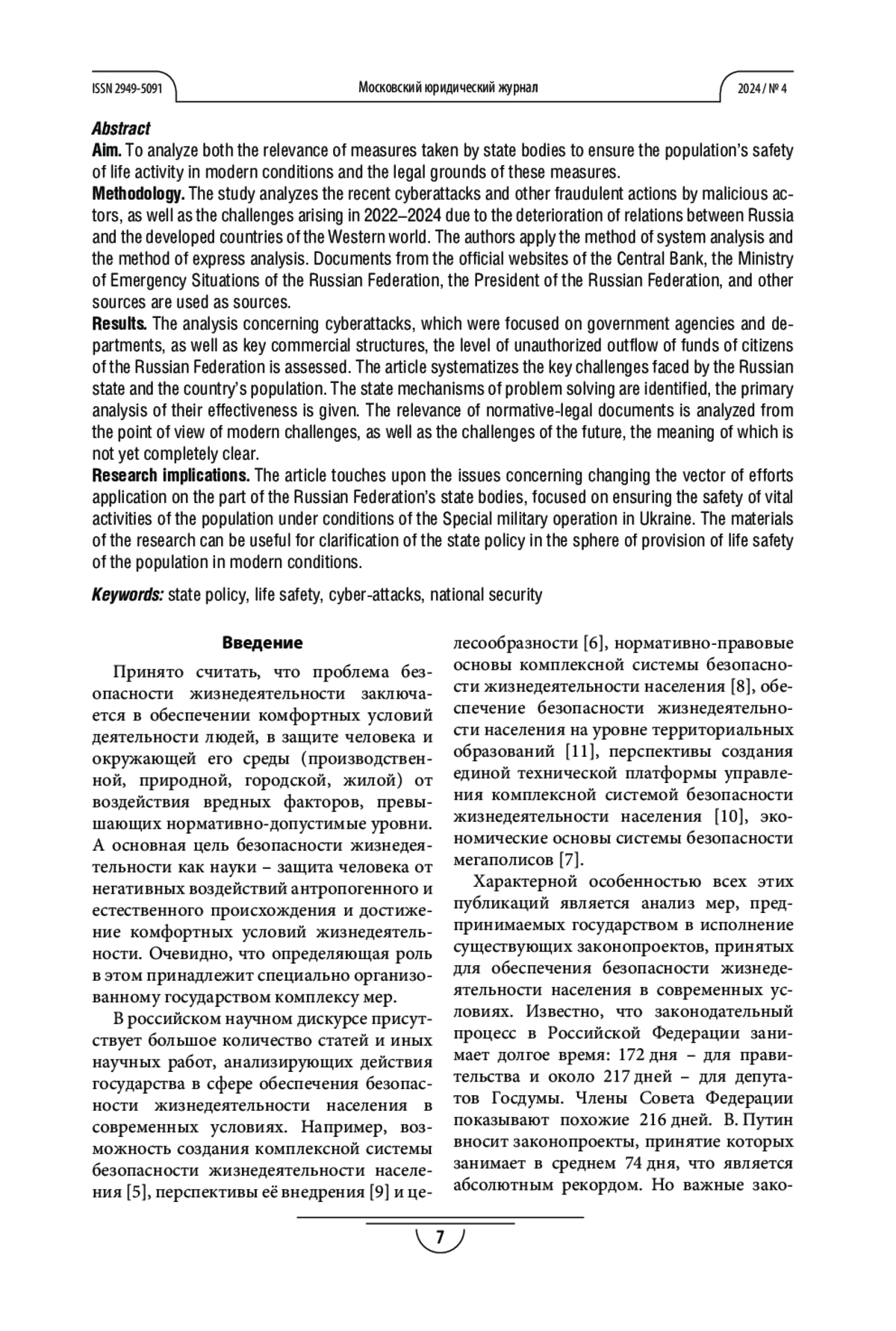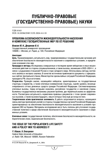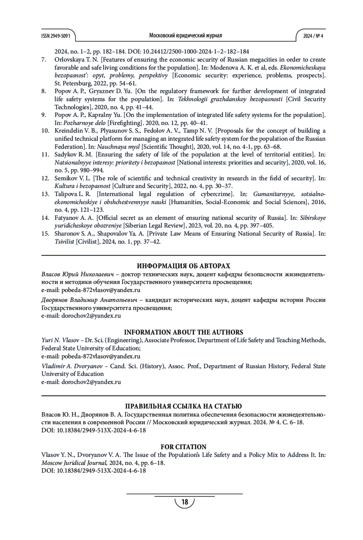 ВЛАСОВ Ю. Н., ДВОРЯНОВ В. А. ГОСУДАРСТВЕННАЯ ПОЛИТИКА ОБЕСПЕЧЕНИЯ БЕЗОПАСНОСТИ ЖИЗНЕДЕЯТЕЛЬНОСТИ НАСЕЛЕНИЯ В СОВРЕМЕННОЙ РОССИИ // МОСКОВСКИЙ ЮРИДИЧЕСКИЙ ЖУРНАЛ. 2024. 2024 / №4