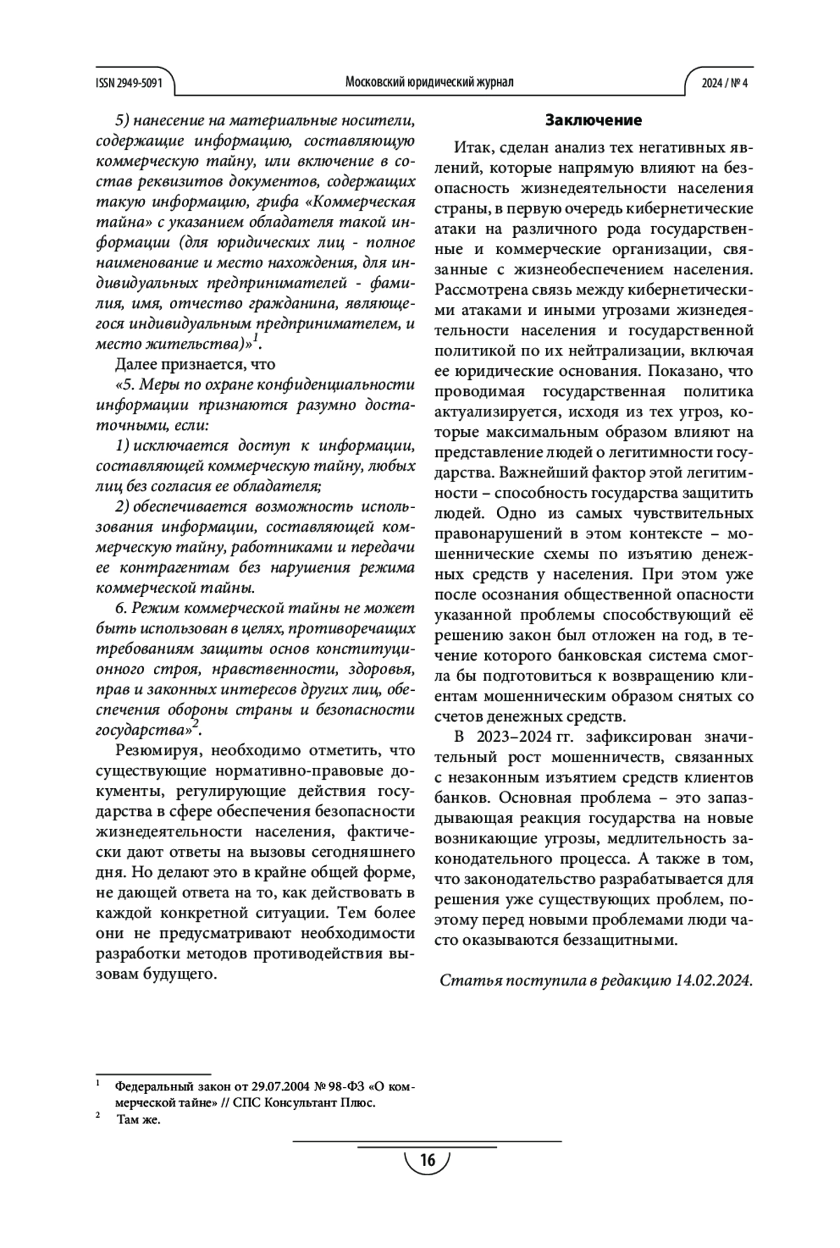 Статья: Государственная политика обеспечения безопасности жизнедеятельности населения в современной России (2024)