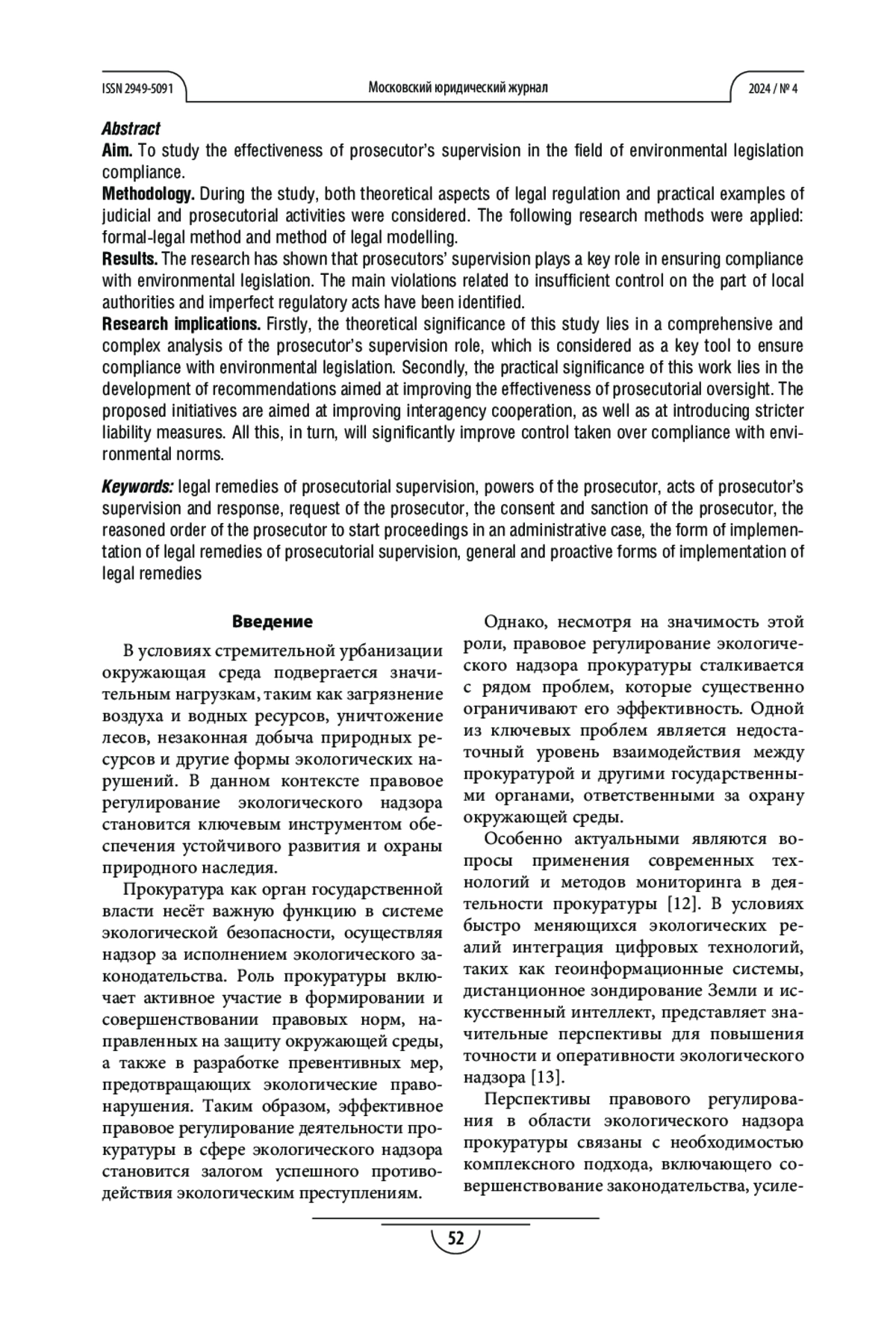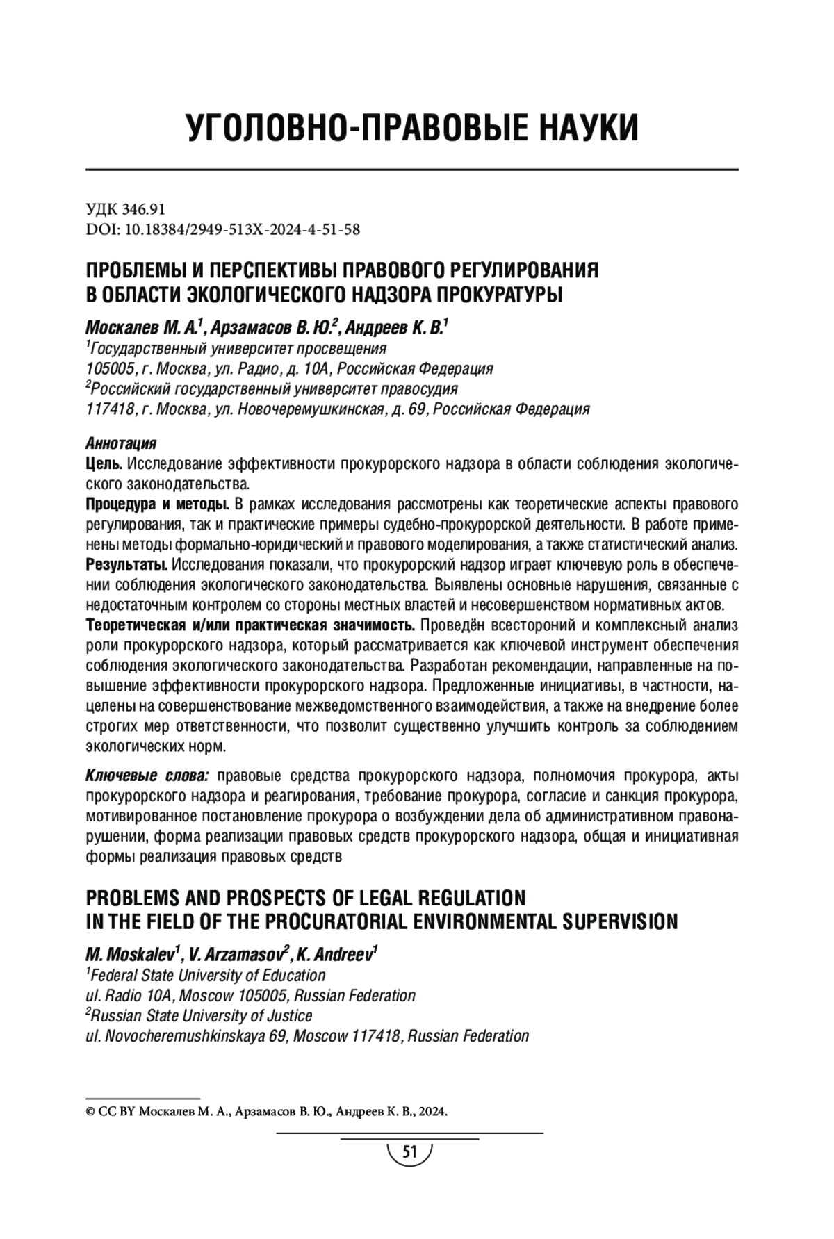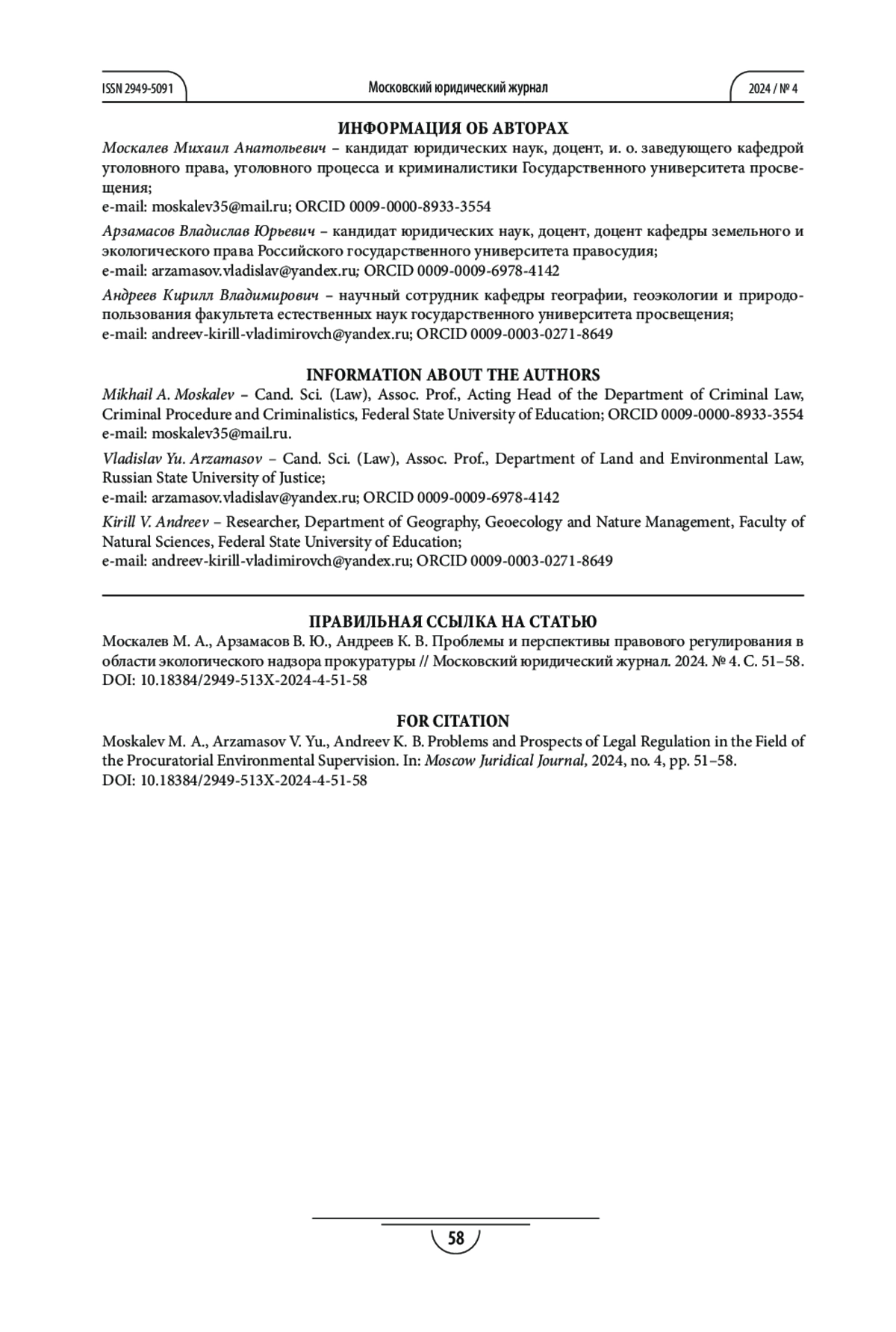 1. Андреев К. В. Роль прокурорского надзора в обеспечении экологической безопасности: вызовы и достижения // Российский научный вестник. 2024. № 1. С. 35-37.