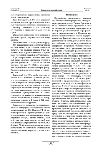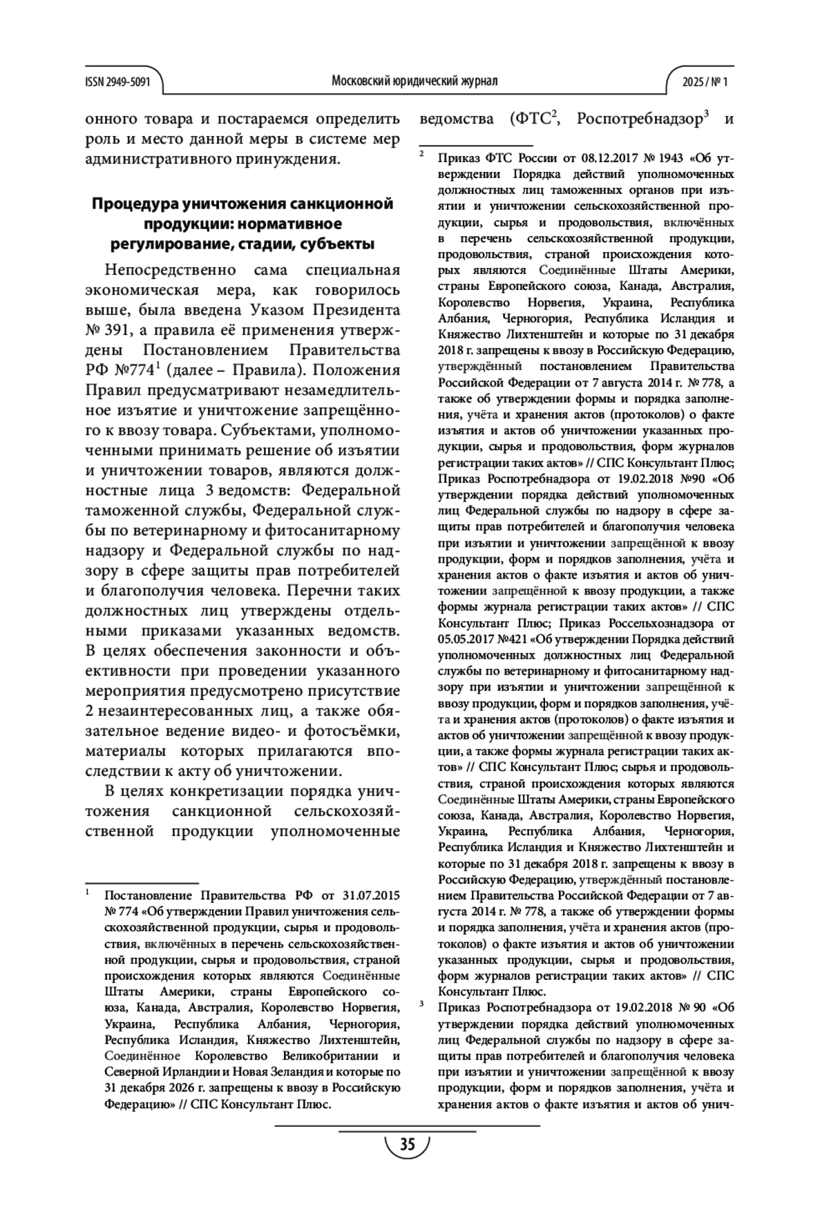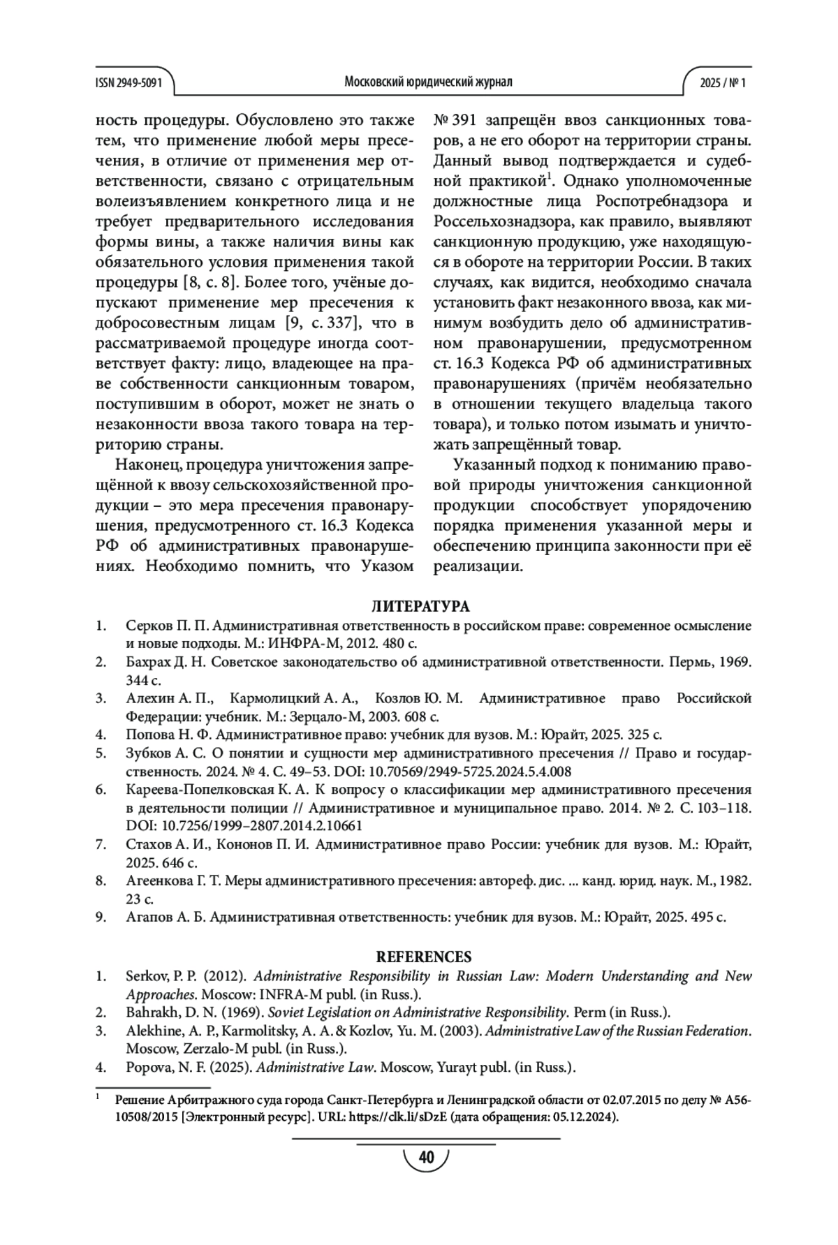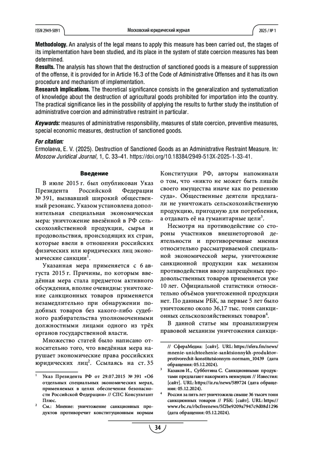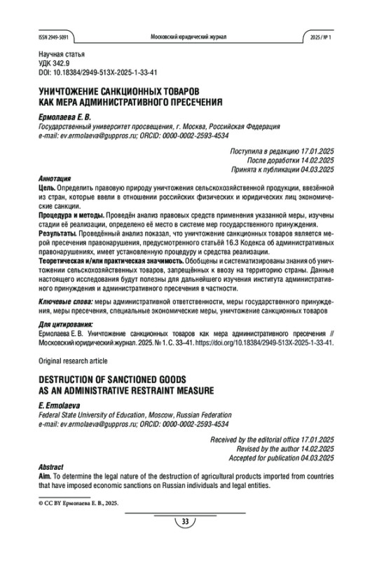 ЕРМОЛАЕВА Е. В. УНИЧТОЖЕНИЕ САНКЦИОННЫХ ТОВАРОВ КАК МЕРА АДМИНИСТРАТИВНОГО ПРЕСЕЧЕНИЯ // МОСКОВСКИЙ ЮРИДИЧЕСКИЙ ЖУРНАЛ. 2025. 2025 / №1