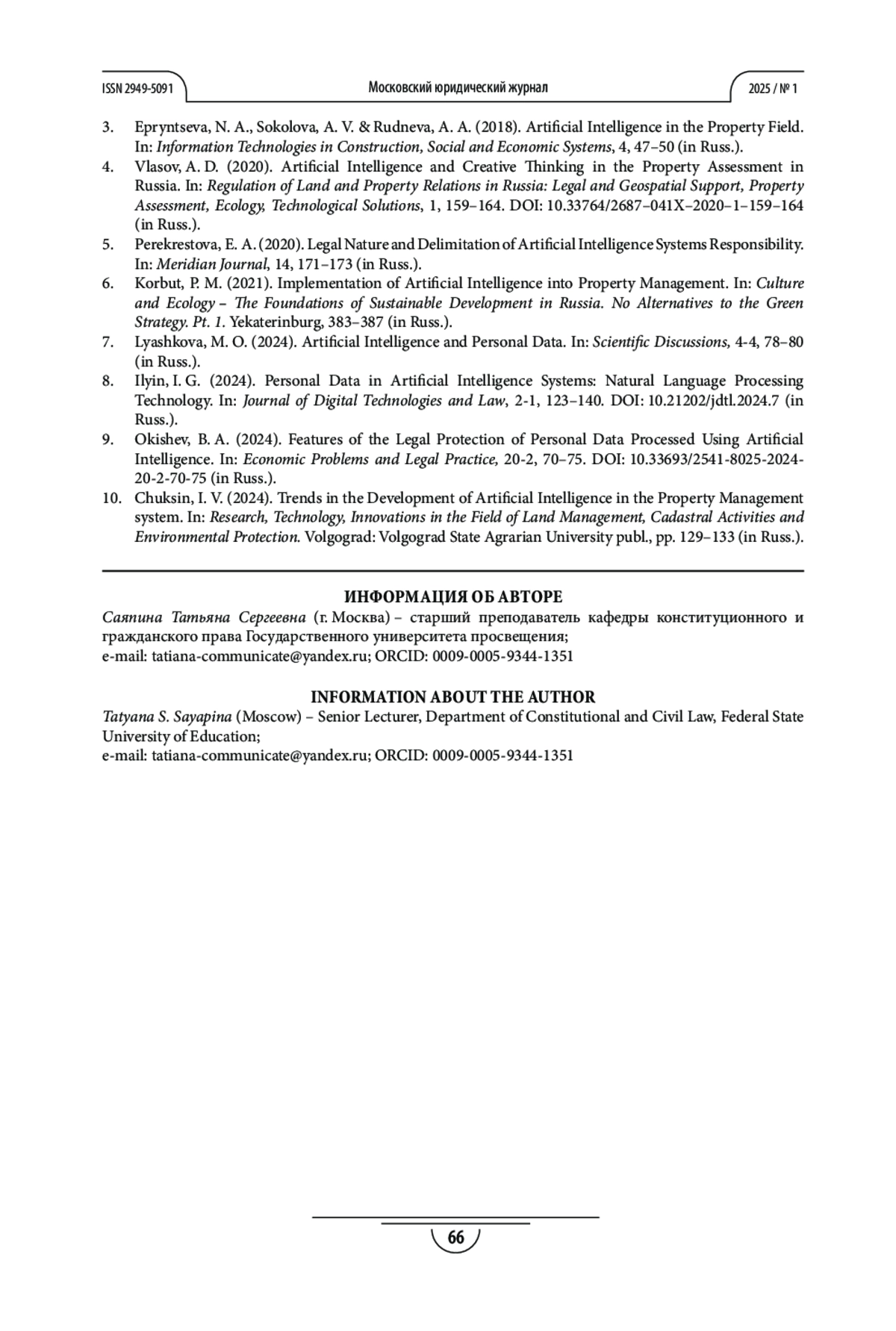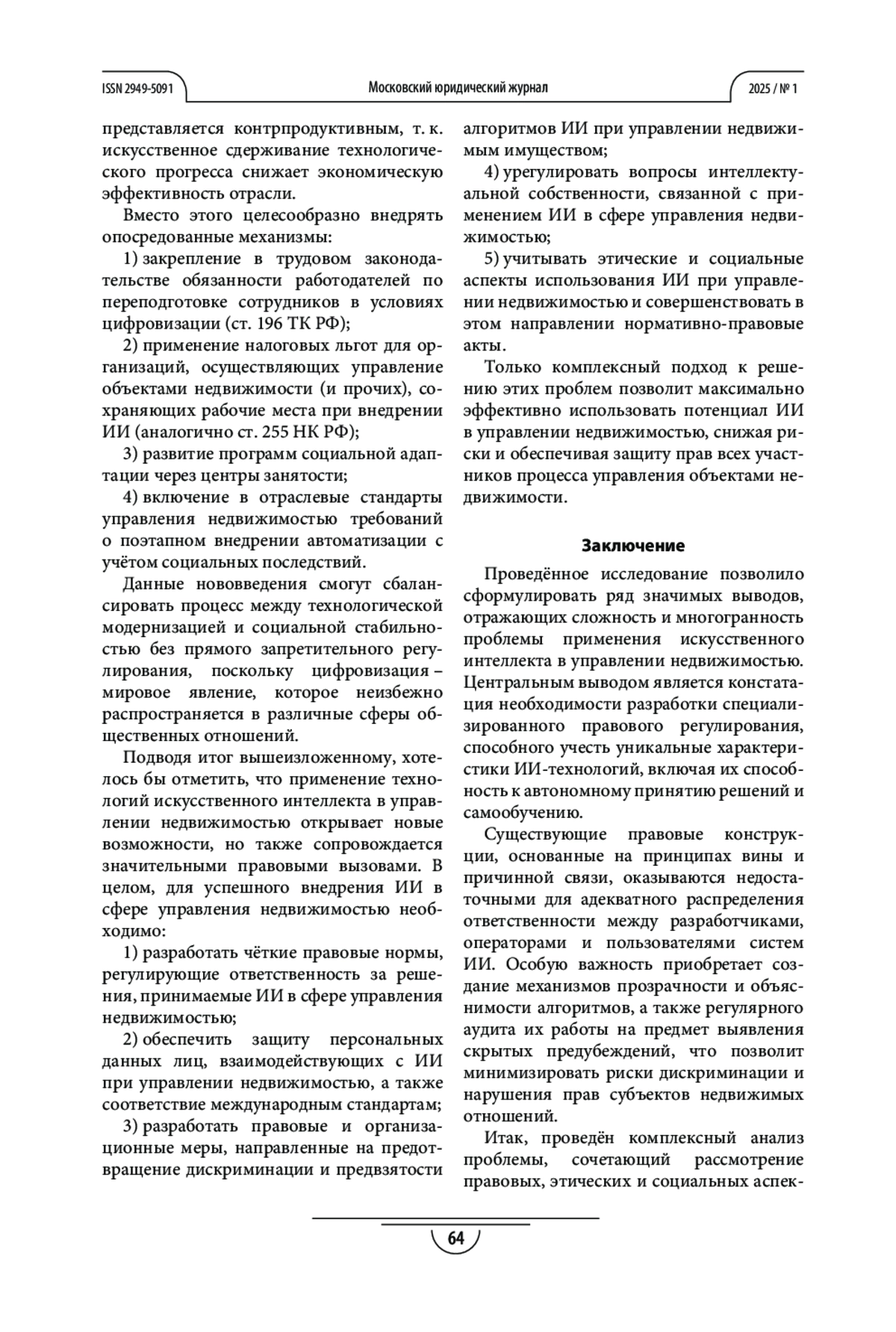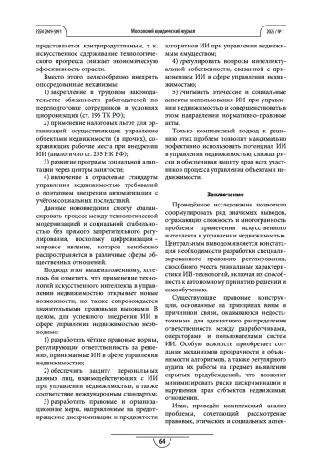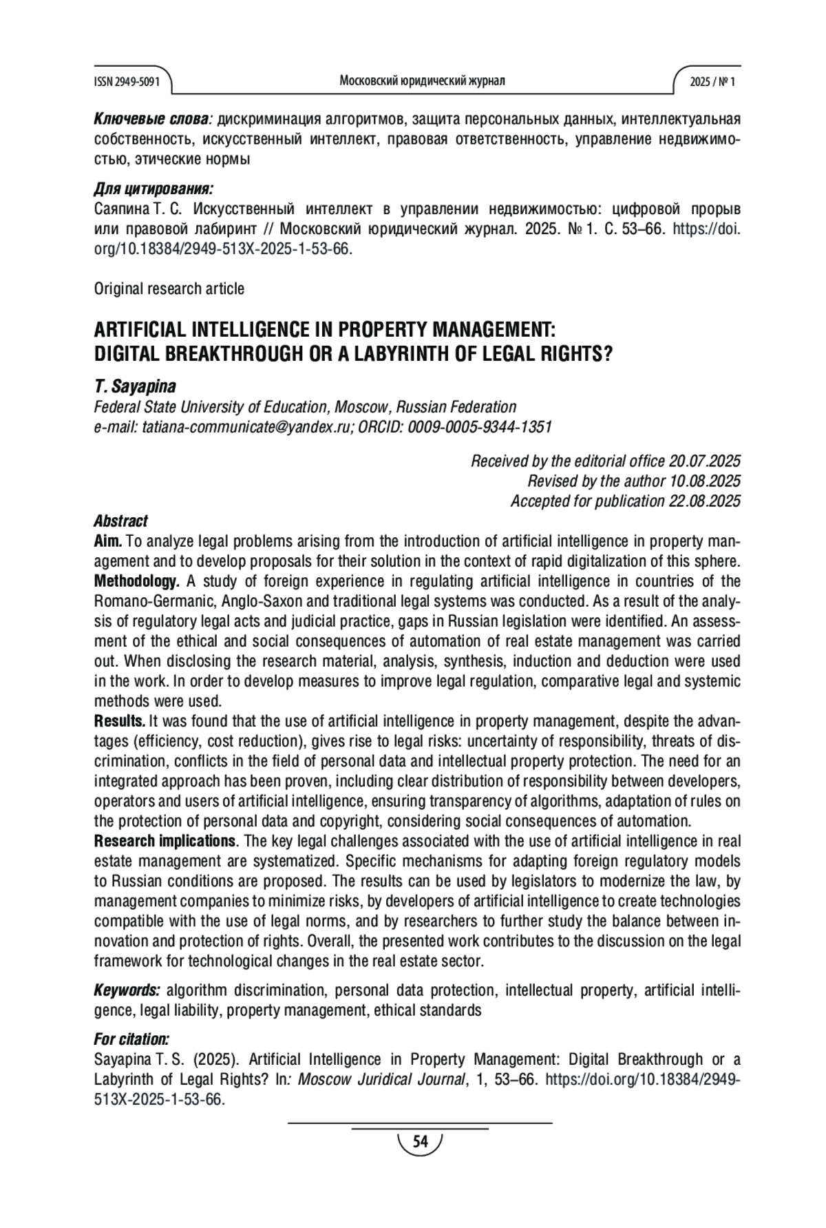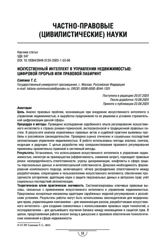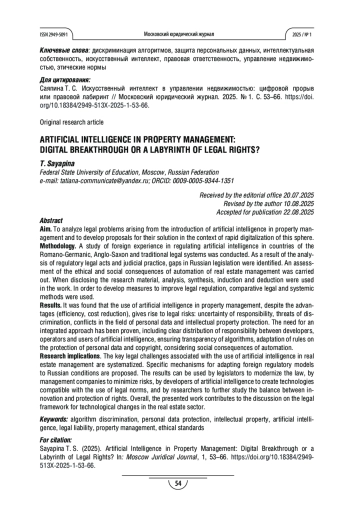 Результаты. Установлено, что использование искусственного интеллекта в управлении недвижимостью, несмотря на преимущества (эффективность, снижение затрат), порождает правовые риски: неопределённость ответственности, угрозы дискриминации, конфликты в сфере защиты персональных данных и интеллектуальной собственности. Доказана необходимость формирования комплексного подхода, включающего: чёткое распределение ответственности между разработчиками, операторами и пользователями искусственного интеллекта; обеспечение прозрачности алгоритмов; адаптацию норм о защите персональных данных и авторских прав; учёт социальных последствий автоматизации.