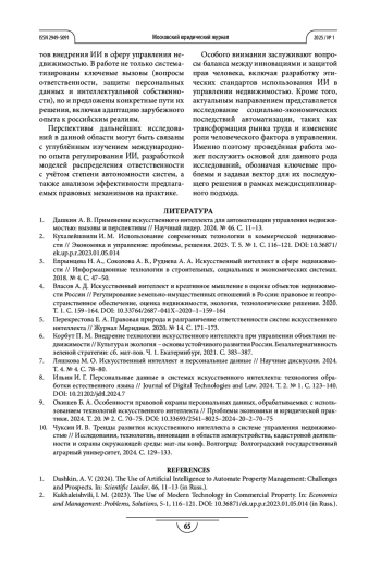 1. Дашкин А. В. Применение искусственного интеллекта для автоматизации управления недвижимостью: вызовы и перспективы // Научный лидер. 2024. № 46. С. 11-13.