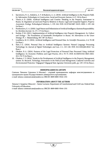 3. Епрынцева Н. А., Соколова А. В., Руднева А. А. Искусственный интеллект в сфере недвижимости // Информационные технологии в строительных, социальных и экономических системах. 2018. № 4. С. 47-50.