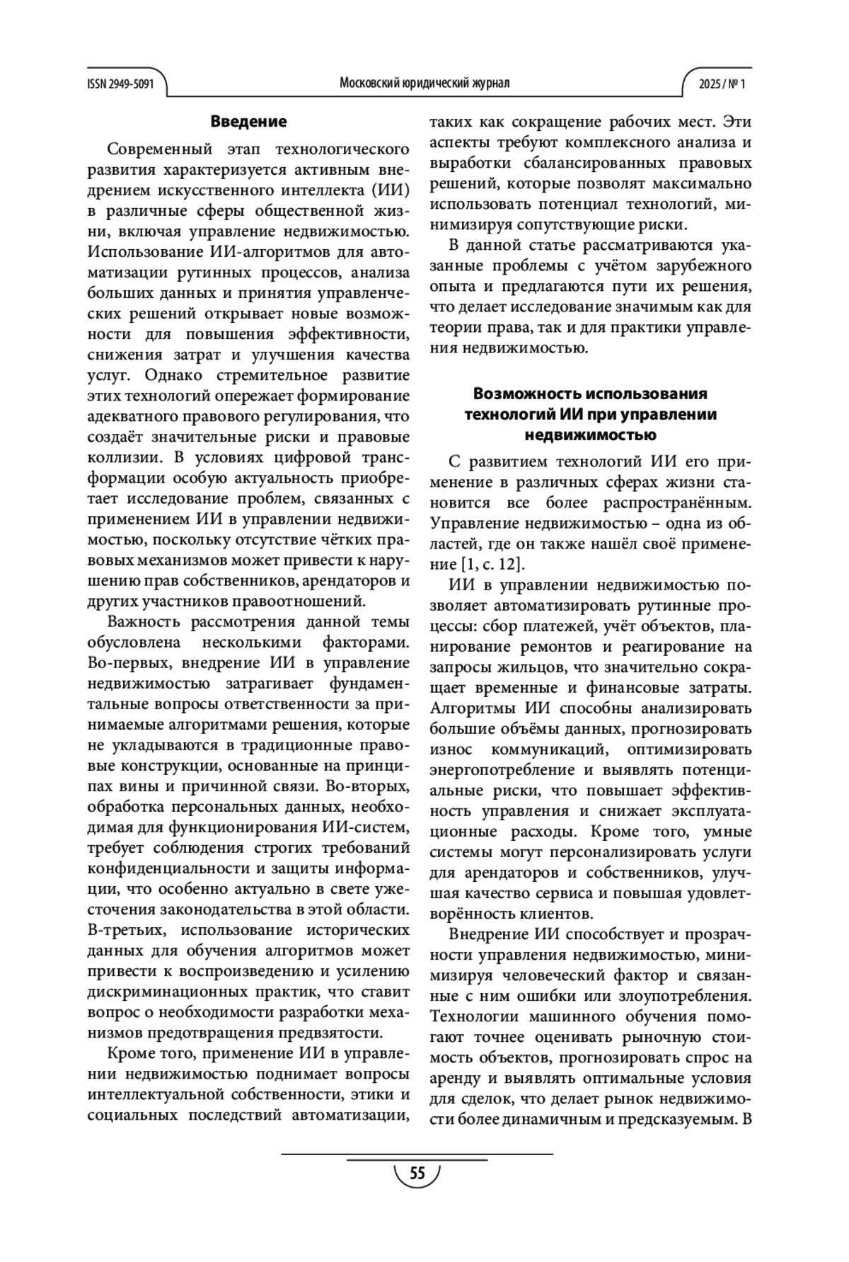 Цель. Анализ правовых проблем, возникающих при внедрении искусственного интеллекта в управление недвижимостью, и выработка предложений по их решению в условиях стремительной цифровизации данной сферы.