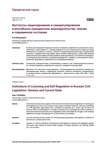 В статье рассматриваются отдельные аспекты становления современного российского законодательства о лицензировании и саморегулировании (в части осуществления отдельных видов деятельности на основании лицензии, членства в саморегулируемой организации, свидетельства о допуске к определенному виду работ), нормы которого представлены в целом ряде отраслей права (хотя внимание автора сконцентрировано, преимущественно, на положениях гражданского законодательства). Отмечены некоторые противоречия и пробелы в анализируемом законодательстве, представлены предложения по его совершенствованию.