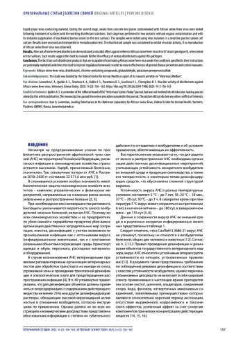 Ключевые фразы: вирус африканской чумы свиней, дезсредства, дезинфектанты, хлорсодержащие препараты, глутаровый альдегид, пероксомоносульфат калия