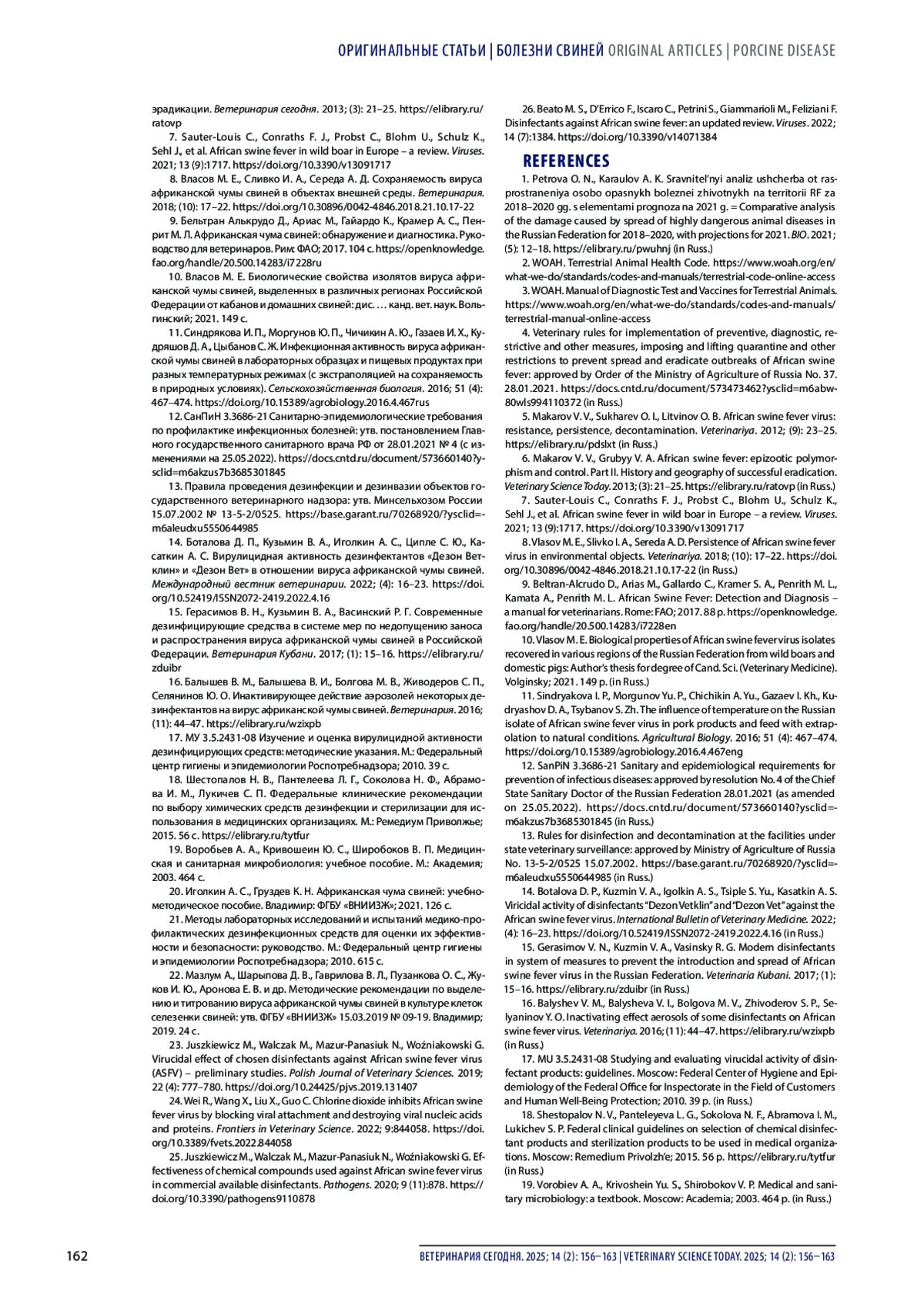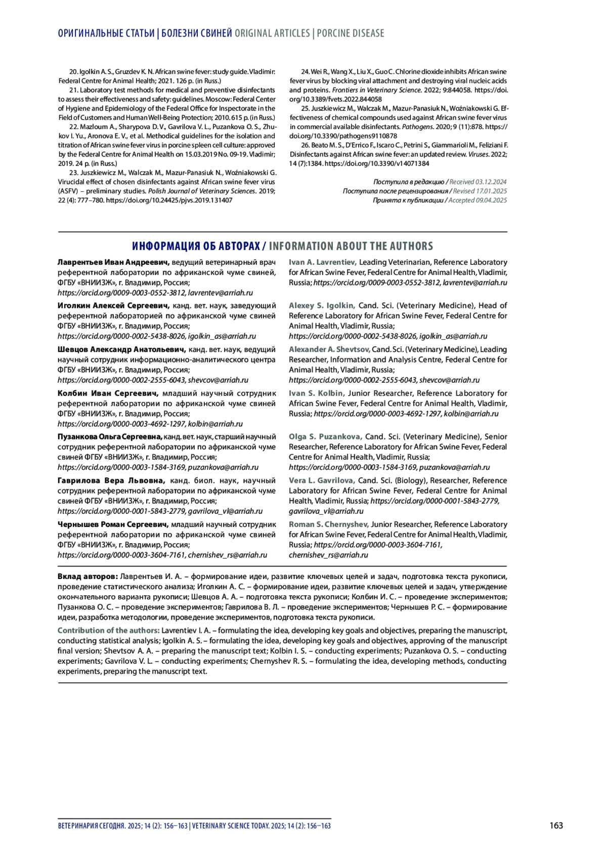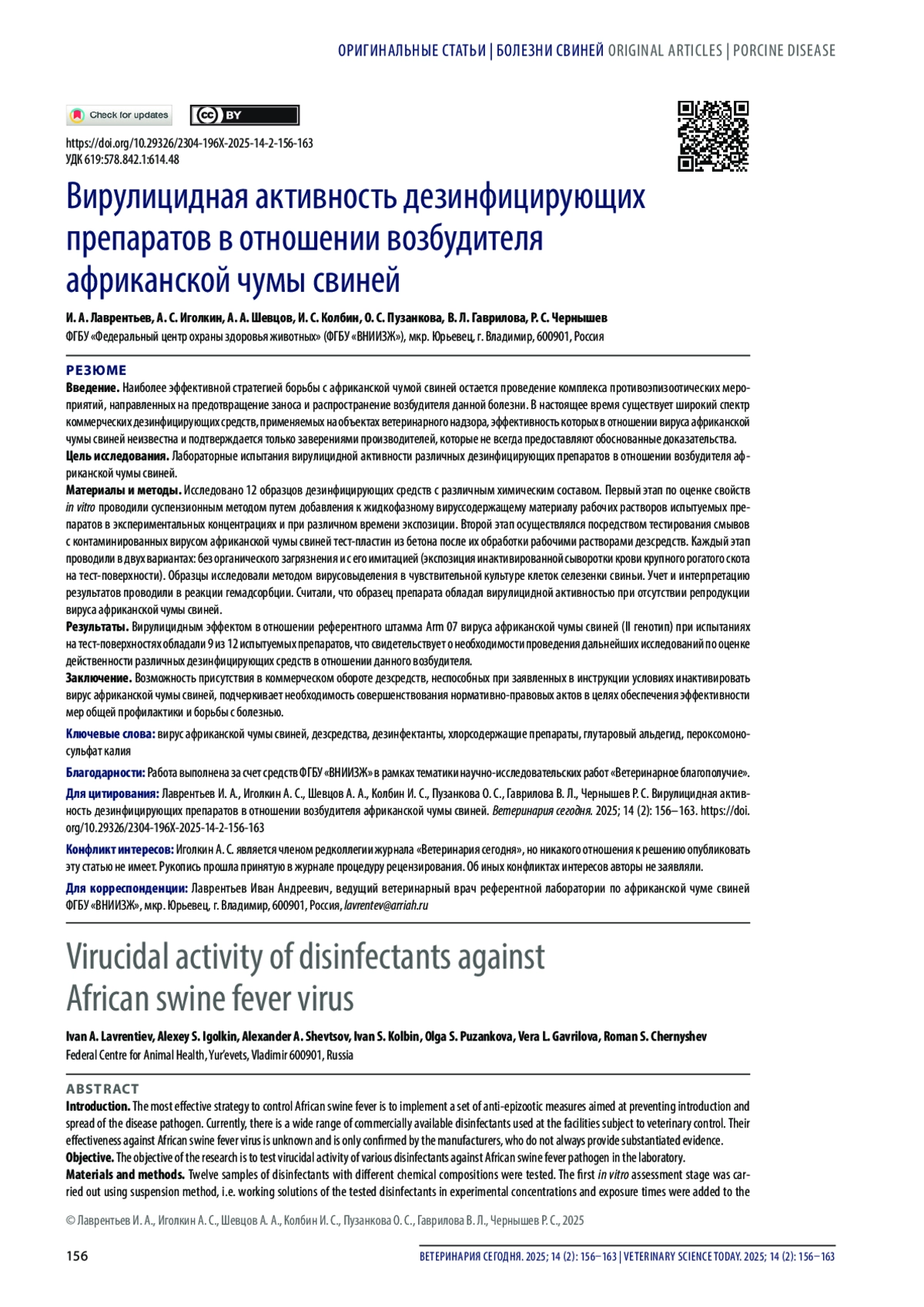 ЛАВРЕНТЬЕВ И. А., ИГОЛКИН А. С., ШЕВЦОВ А. А., КОЛБИН И. С., ПУЗАНКОВА О. С., ГАВРИЛОВА В. Л., ЧЕРНЫШЕВ Р. С. ВИРУЛИЦИДНАЯ АКТИВНОСТЬ ДЕЗИНФИЦИРУЮЩИХ ПРЕПАРАТОВ В ОТНОШЕНИИ ВОЗБУДИТЕЛЯ АФРИКАНСКОЙ ЧУМЫ СВИНЕЙ // ВЕТЕРИНАРИЯ СЕГОДНЯ. 2025. № 2, ТОМ 14