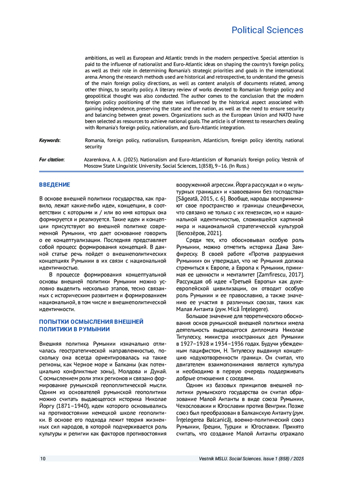 Синтез национализма, европеизма и атлантизма становится отличительной чертой современных восточноевропейских государств. Особое место в этом контексте занимает Румыния. Целью данной статьи является рассмотрение особенностей внешнеполитического курса Румынии с учетом его исторических особенностей и современного позиционирования. Изучение концептуальных и идеологических основ позволяет определить, как государство выстраивает внешнюю политику, а также предугадать некоторые шаги по реализации своих целей и интересов. Анализируется национальная составляющая, геополитические амбиции, а также европейское и атлантическое направления в современной перспективе. Особое внимание уделяется влиянию националистических и евроатлантических идей на формирование внешнеполитического курса страны, а также их роли в определении стратегических приоритетов и целей Румынии на международной арене. Среди использованных методов исследования особо значимы исторический и ретроспективный. Они служат для понимания генезиса основных внешнеполитических направлений. Востребован также контент-анализ документов, связанных в том числе и с политикой безопасности. Был также проведен обзор трудов, посвященных румынской внешнеполитической и геополитической мысли. Автор приходит к выводу, что на современное внешнеполитическое позиционирование государства оказал влияние исторический аспект, связанный с обретением независимости, сохранением государства и нации, а также необходимостью обеспечения безопасности и балансированием между великими державами.