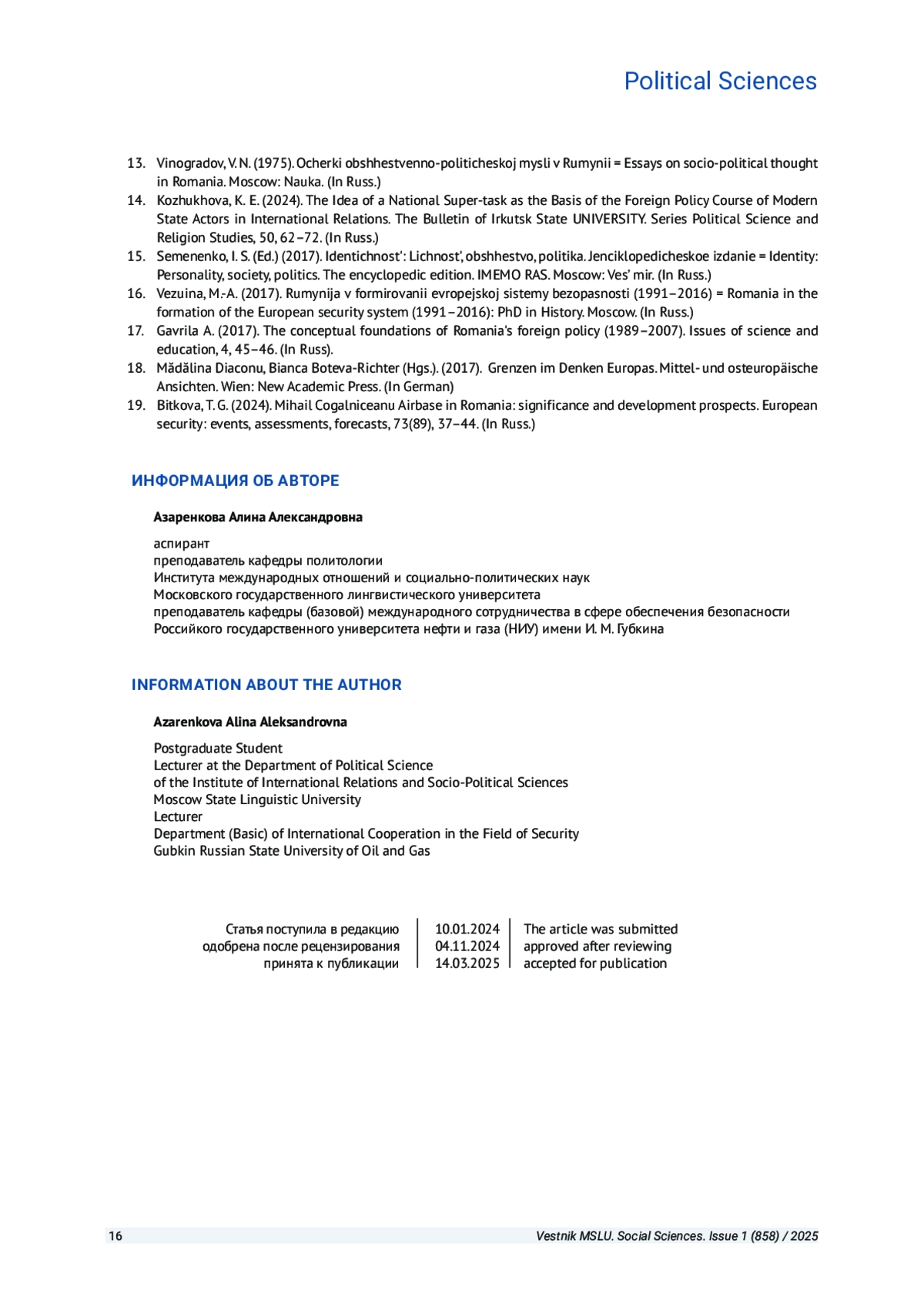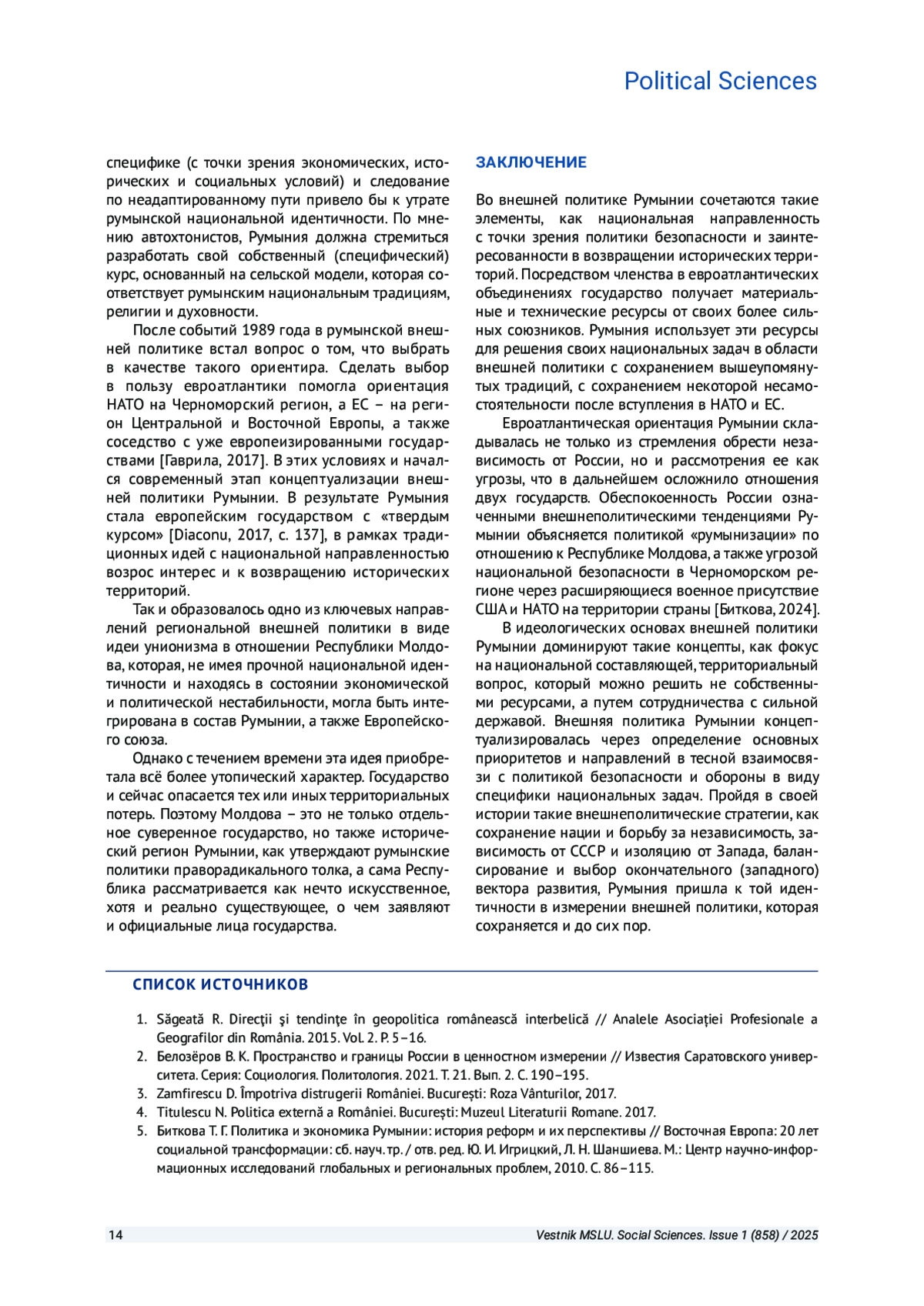 16. Везуина М.-А. Румыния в формировании европейской системы безопасности (1991-2016): дис. … канд. ист. наук. М., 2017. EDN: XPYAPZ