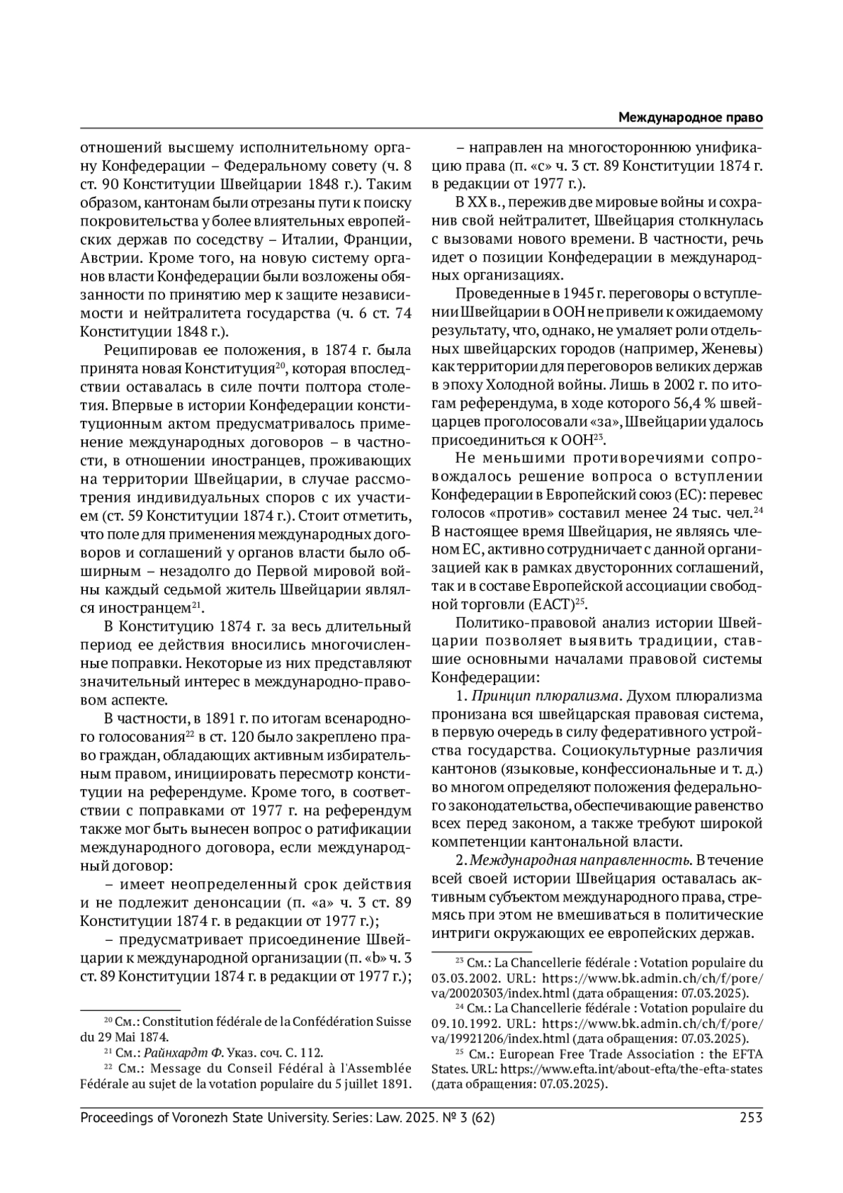Раскрываются международно-правовые аспекты формирования Швейцарской Конфедерации. Выделяются два этапа развития швейцарской государственности, выявляются ключевые преобразования, вызванные историческими событиями. Исследуются особенности правового регулирования международно-правового статуса Конфедерации. Обосновывается вывод о правовых традициях Швейцарии в международно-правовом аспекте: плюрализме, нейтралитете, демократизме и международном сотрудничестве.