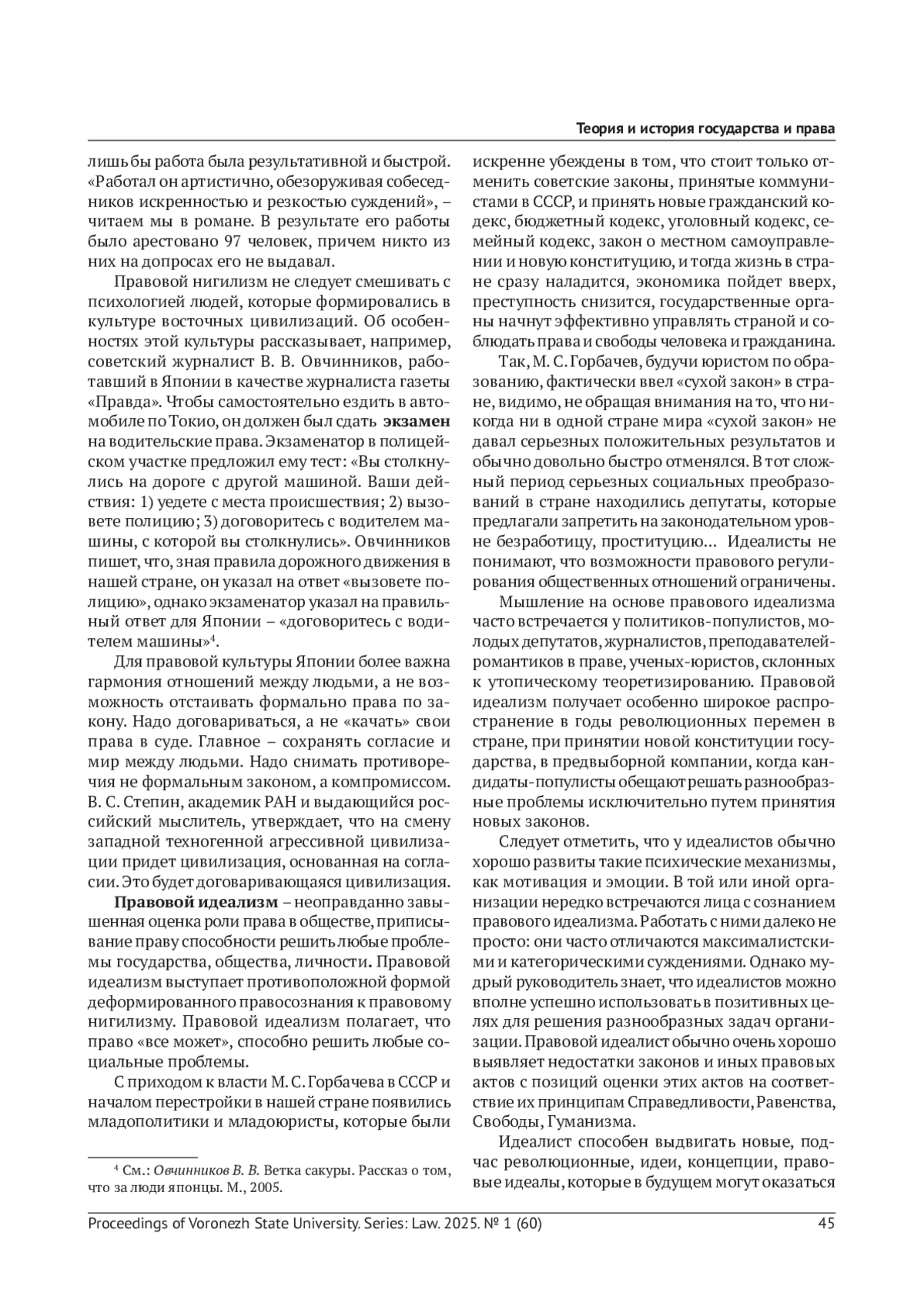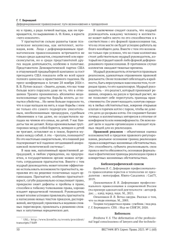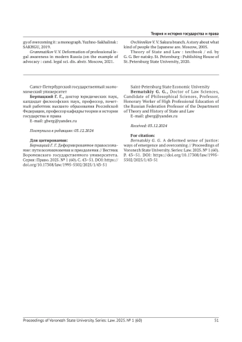 В статье рассматривается деформированное правосознание как искаженное сознание. Деформация правосознания возникает вследствие осознания правовой реальности в крайностях - доведения правовых явлений до максимума или, наоборот, сведения их к нулю. Выделяется восемь форм деформированного правосознания, которые сосуществуют парами, как противоположные крайности: 1) правовой нигилизм и правовой идеализм; 2) правовой педантизм и правовой дилетантизм; 3) правовой конформизм и правовой нонконформизм; 4) правовой инфантилизм и правовой прагматизм. В статье указаны обстоятельства, при которых деформированное правосознание может играть позитивную роль.