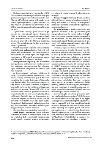 РЕЗУЛЬТАТЫ ИССЛЕДОВАНИЯ. Исследование показало, что система мониторинга ЕС использует многоуровневый подход: от усиленного политического диалога до формальной процедуры отмены преференций. Случай Камбоджи продемонстрировал как сильные стороны, так и ограничения системы мониторинга. Несмотря на многолетние усилия Европейской комиссии, ситуация с правами человека в стране не улучшилась, что привело к частичной отмене преференций в рамках программы «Все, кроме оружия» (далее – EBA), затронувшей около 20% экспорта Камбоджи в ЕС. Сильные стороны системы: поэтапный подход дает странам время на исправление нарушений; оценка на основе данных из широкого круга источников повышает объективность; экономические стимулы способствуют соблюдению прав человека. Однако выявлены и ключевые недостатки: неполная прозрачность, централизованное принятие решений, непропорциональное воздействие на уязвимые группы и ограниченное влияние при наличии у стран-бенефициаров доступа к альтернативным рынкам.