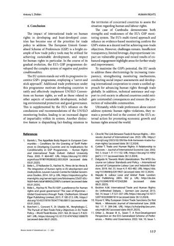 ОБСУЖДЕНИЕ И ВЫВОДЫ. Проведенный анализ позволяет утверждать, что, хотя система мониторинга ВСП ЕС создает основу для продвижения прав человека через торговую политику, для большей эффективности необходимы существенные улучшения. Рекомендации включают: установление четких ожиданий по проведению реформ, направленных на улучшение ситуации с правами человека, для стран с учетом их экономической и социальной ситуации, повышение прозрачности через проведение публичных слушаний и раскрытие «списков проблем»; проведение оценок социальных последствий до отмены преференций; координацию с другими развитыми странами для выработки единого подхода. Программа ВСП+ выделяется использованием подхода кнута и пряника, однако ЕС необходимо балансировать между чрезмерным давлением и минимизацией негативных последствий для уязвимых групп в странахбенефициарах.