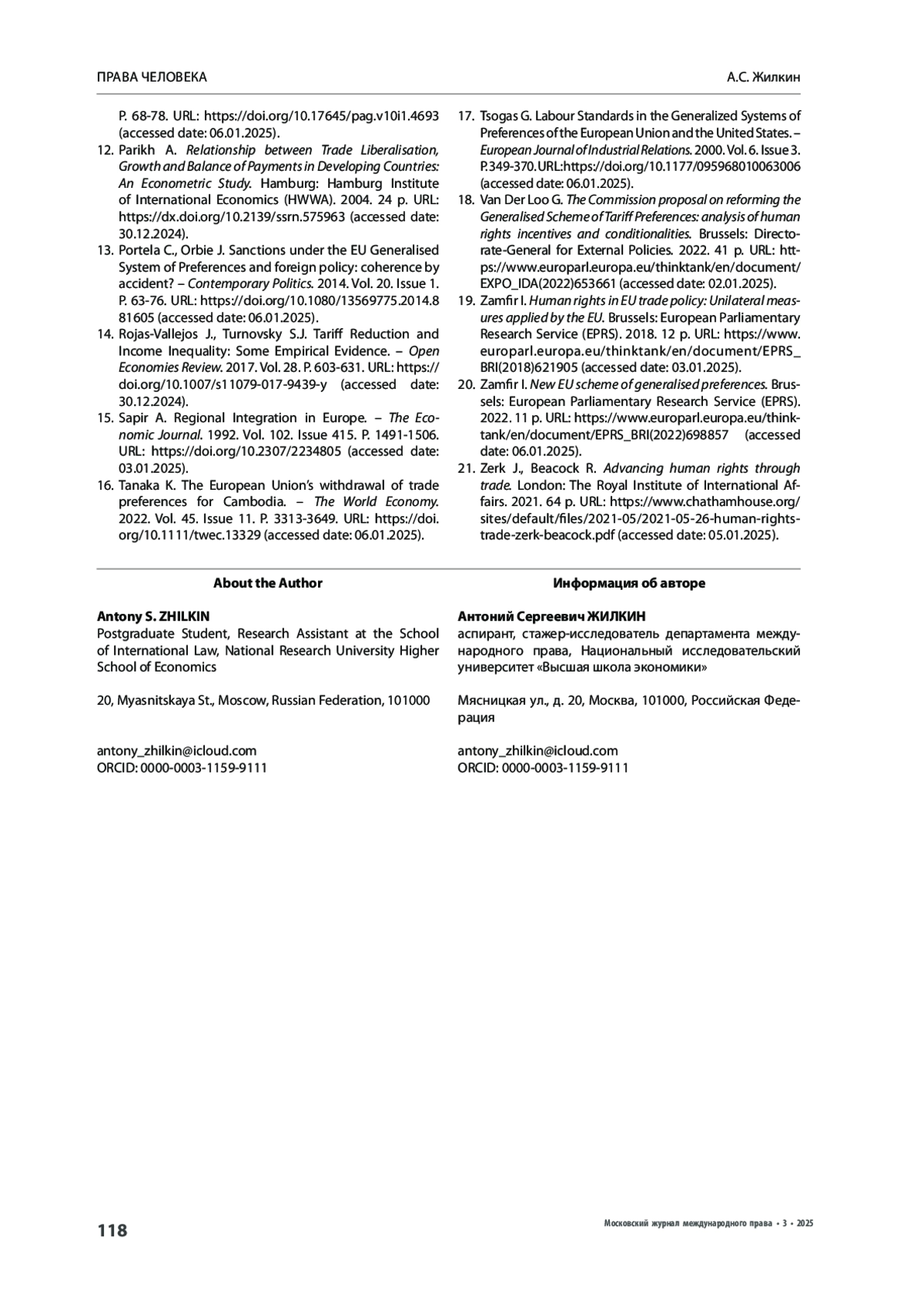 ВВЕДЕНИЕ. Статья исследует мониторинг соблюдения прав человека в рамках Всеобщей системы преференций (далее – ВСП) Европейского союза (далее – ЕС). Цель работы – проанализировать, как ЕС использует торговые преференции для продвижения прав человека в развивающихся странах, уделяя особое внимание эффективности механизмов мониторинга и процедур отмены преференций. Задачи исследования включают: изучение этапов развития программ ВСП ЕС; анализ нынешней системы мониторинга; оценку недавнего случая частичного отзыва преференций у Камбоджи; а также выявление сильных и слабых сторон системы с предложениями по ее улучшению.