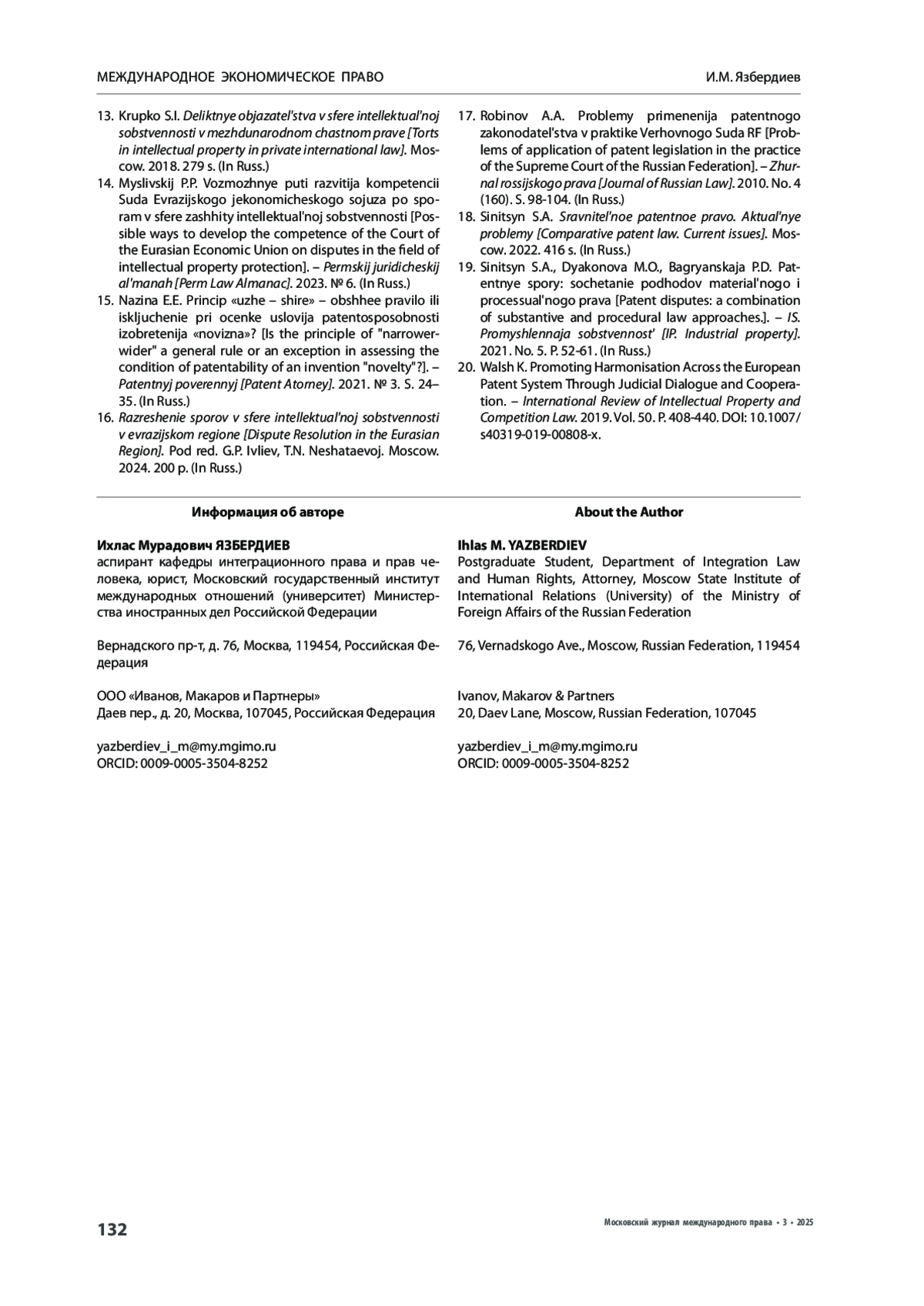 9. Касьянов Р.А., Язбердиев И.М. 2024. К пятидесятилетию Европейской патентной конвенции (1973- 2023 гг.). - Московский журнал международного права. № 1. C. 44-56. https://doi.org/10.24833/0869-0049-2024-144-56.