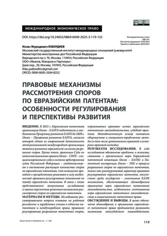 ВВЕДЕНИЕ. В 2023 г. Евразийская патентная организация (далее – ЕАПО) подготовила и опубликовала Программу развития ЕАПО до 2028 г. (далее – Программа развития ЕАПО), согласно которой одним из направлений деятельности этой региональной международной организации является развитие евразийской системы разрешения споров. Кроме этого, практика Суда по интеллектуальным правам (далее – СИП) – специализированного суда в системе арбитражных судов Российской Федерации – свидетельствует о постепенно растущем количестве споров по евразийским патентам, что неминуемо приводит к прецедентным решениям в силу особенностей правового регулирования отношений по поводу евразийских патентов. В связи с этим представляется актуальным исследование и оценка перспектив развития механизмов рассмотрения споров по евразийским патентам.