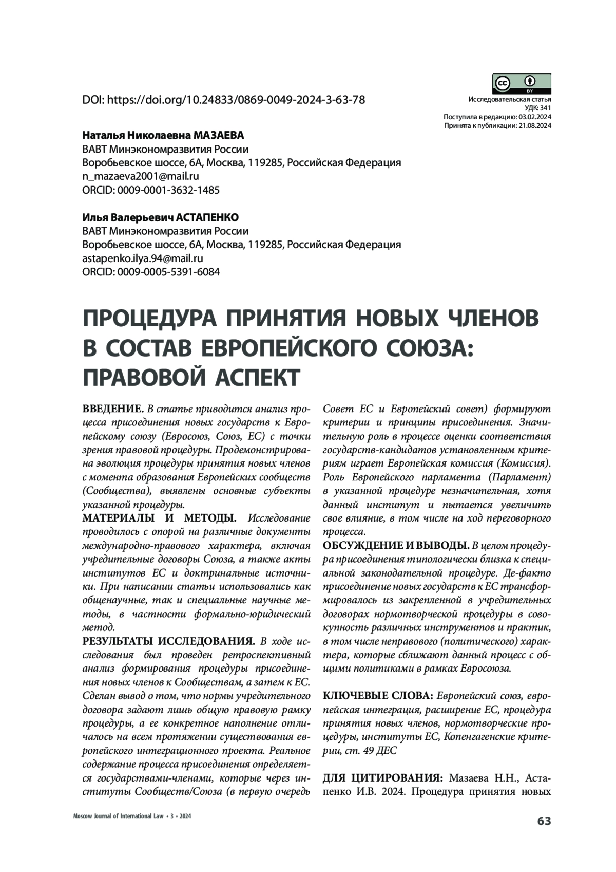 РЕЗУЛЬТАТЫ ИССЛЕДОВАНИЯ. В ходе исследования был проведен ретроспективный анализ формирования процедуры присоединения новых членов к Сообществам, а затем к ЕС. Сделан вывод о том, что нормы учредительного договора задают лишь общую правовую рамку процедуры, а ее конкретное наполнение отличалось на всем протяжении существования европейского интеграционного проекта. Реальное содержание процесса присоединения определяется государствами-членами, которые через институты Сообществ/Союза (в первую очередь Совет ЕС и Европейский совет) формируют критерии и принципы присоединения. Значительную роль в процессе оценки соответствия государств-кандидатов установленным критериям играет Европейская комиссия (Комиссия). Роль Европейского парламента (Парламент) в указанной процедуре незначительная, хотя данный институт и пытается увеличить свое влияние, в том числе на ход переговорного процесса.