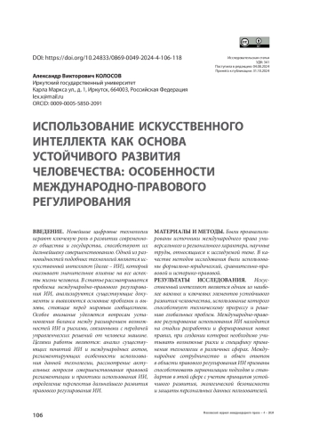РЕЗУЛЬТАТЫ ИССЛЕДОВАНИЯ. Искусственный интеллект является одним из наиболее важных и ключевых элементов устойчивого развития человечества, использование которого способствует техническому прогрессу и решению глобальных проблем. Международно-правовое регулирование использования ИИ находится на стадии разработки и формирования новых правил, при создании которых необходимо учитывать возможные риски и специфику применения технологии в различных сферах. Международное сотрудничество и обмен опытом в области правового регулирования ИИ призваны способствовать гармонизации подходов и стандартов в этой сфере с учетом принципов устойчивого развития, экологической безопасности и защиты персональных данных пользователей.