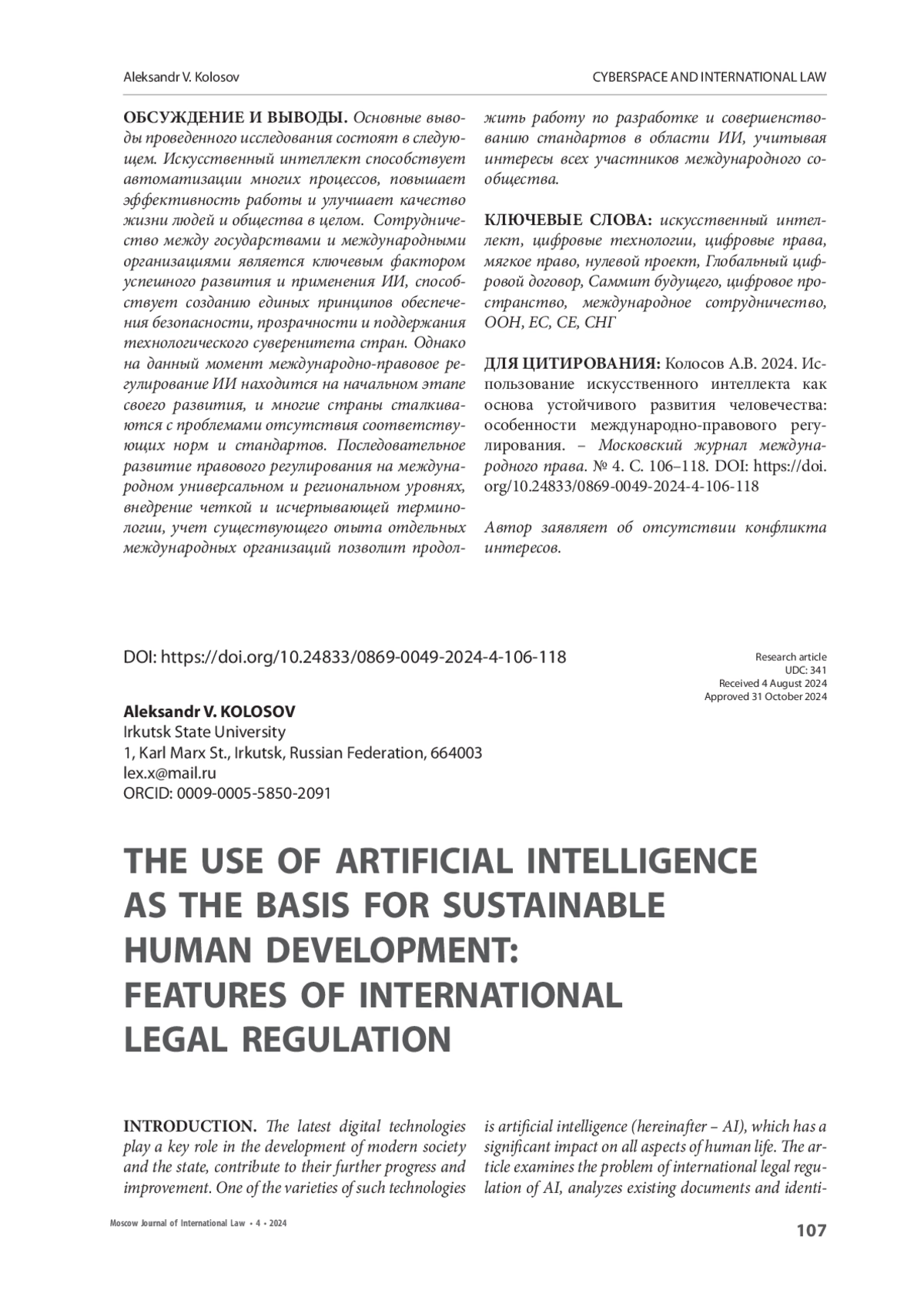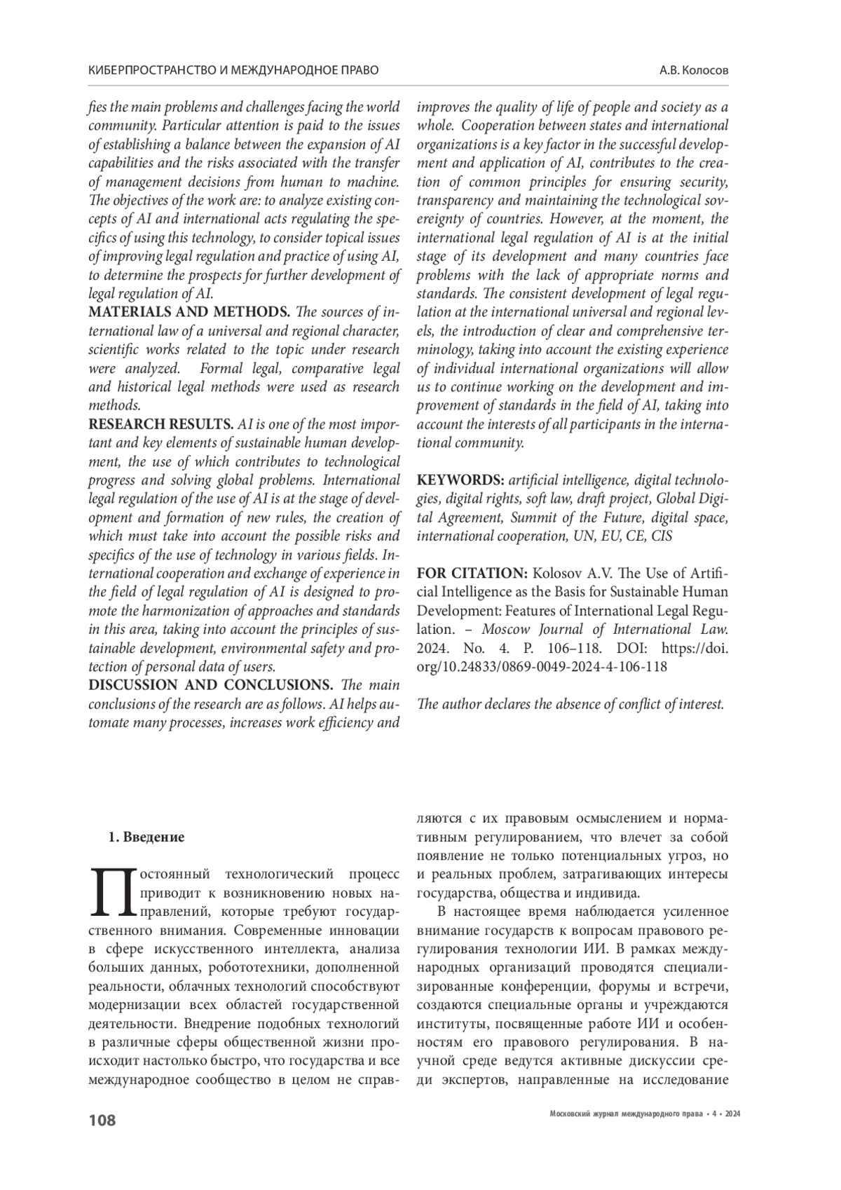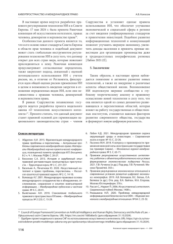 ОБСУЖДЕНИЕ И ВЫВОДЫ. Основные выводы проведенного исследования состоят в следующем. Искусственный интеллект способствует автоматизации многих процессов, повышает эффективность работы и улучшает качество жизни людей и общества в целом. Сотрудничество между государствами и международными организациями является ключевым фактором успешного развития и применения ИИ, способствует созданию единых принципов обеспечения безопасности, прозрачности и поддержания технологического суверенитета стран. Однако на данный момент международно-правовое регулирование ИИ находится на начальном этапе своего развития, и многие страны сталкиваются с проблемами отсутствия соответствующих норм и стандартов. Последовательное развитие правового регулирования на международном универсальном и региональном уровнях, внедрение четкой и исчерпывающей терминологии, учет существующего опыта отдельных международных организаций позволит продолжить работу по разработке и совершенствованию стандартов в области ИИ, учитывая интересы всех участников международного сообщества.