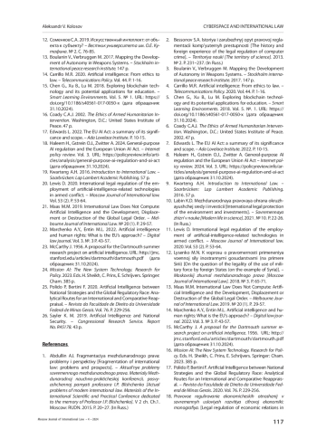 20. Lewis D. 2020. International legal regulation of the employment of artificial-intelligence-related technologies in armed conflict. - Moscow Journal of International law. Vol. 53 (2). P. 53-64.