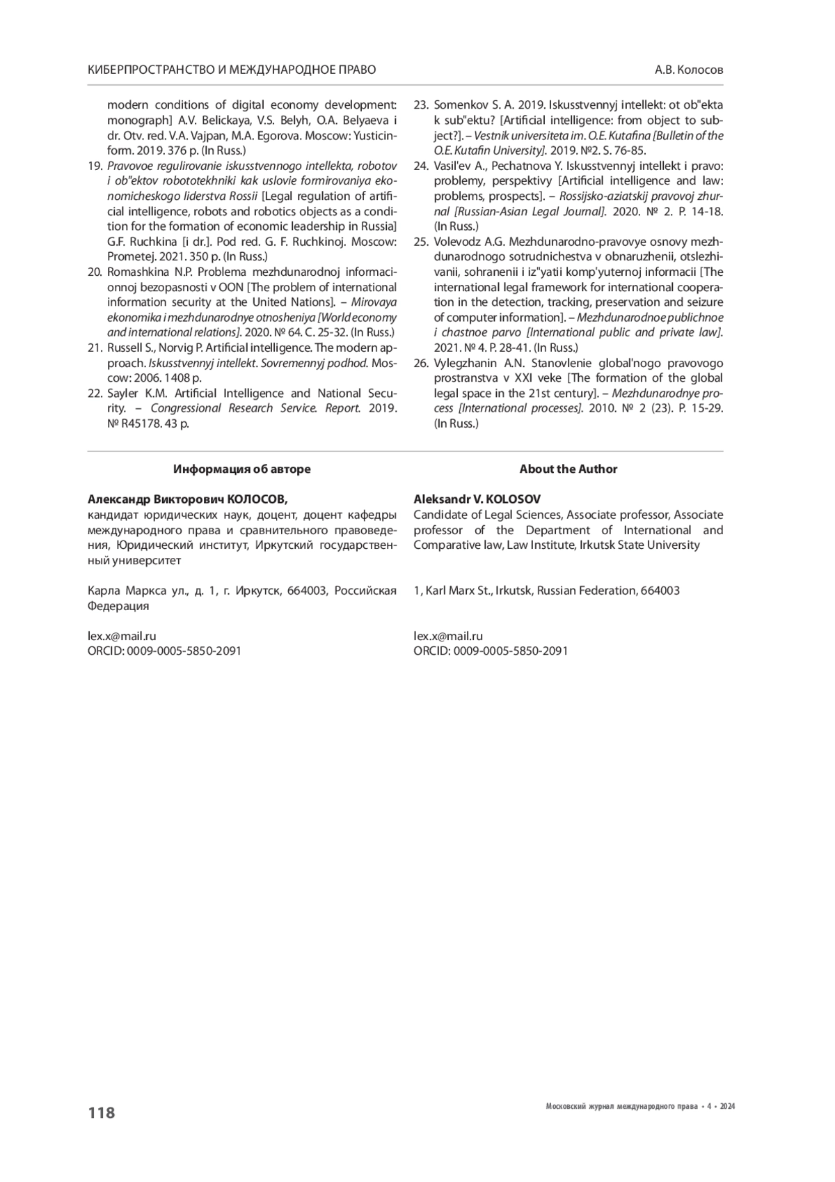 12. Соменков С.А. 2019. Искусственны интеллект: от объекта к субъекту? - Вестник университета им. О.Е. Кутафина. № 2. С. 76-85.