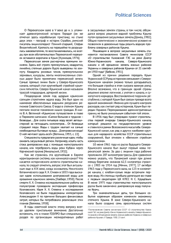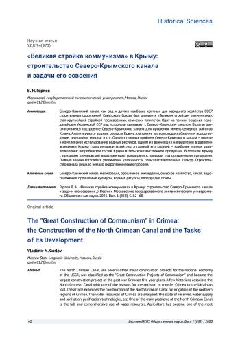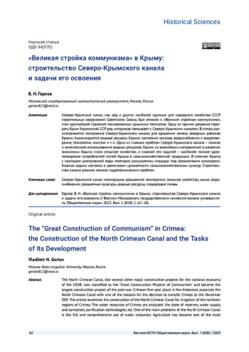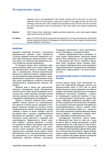 Северо-Крымский канал, как ряд и других наиболее крупных для народного хозяйства СССР строительных сооружений Советского Союза, был отнесен к «Великим стройкам коммунизма», стал крупнейшей стройкой послевоенных крымских пятилеток. Одну из причин решения передать Крым Украинской ССР ряд историков связывают с Северо-Крымским каналом. В статье рассматривается построение Северо-Крымского канала для орошения земель северных районов Крыма. Анализируются водные ресурсы Крыма: состояние запасов, водоснабжение и водоотведение, технологии очистки и т. п. Одна из главных проблем Северо-Крымского канала - полное и комплексное использование водных ресурсов. Одним из важнейших направлений в развитии экономики Крыма стало сельское хозяйство, а главной его задачей - наиболее полное удовлетворение потребностей гостей Крыма в сельскохозяйственной продукции. В степном Крыму с приходом днепровской воды ежегодно расширялись площади под орошаемыми культурами. Главная задача состояла в увеличении урожайности сельскохозяйственных культур. Строительство канала решило немало гидротехнических проблем.