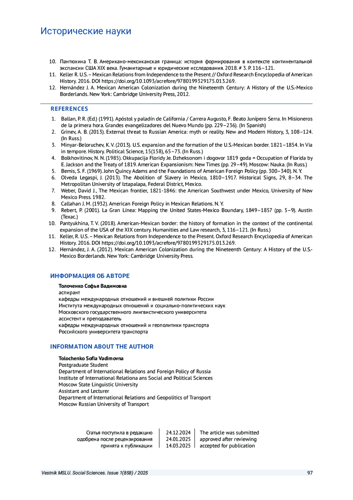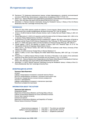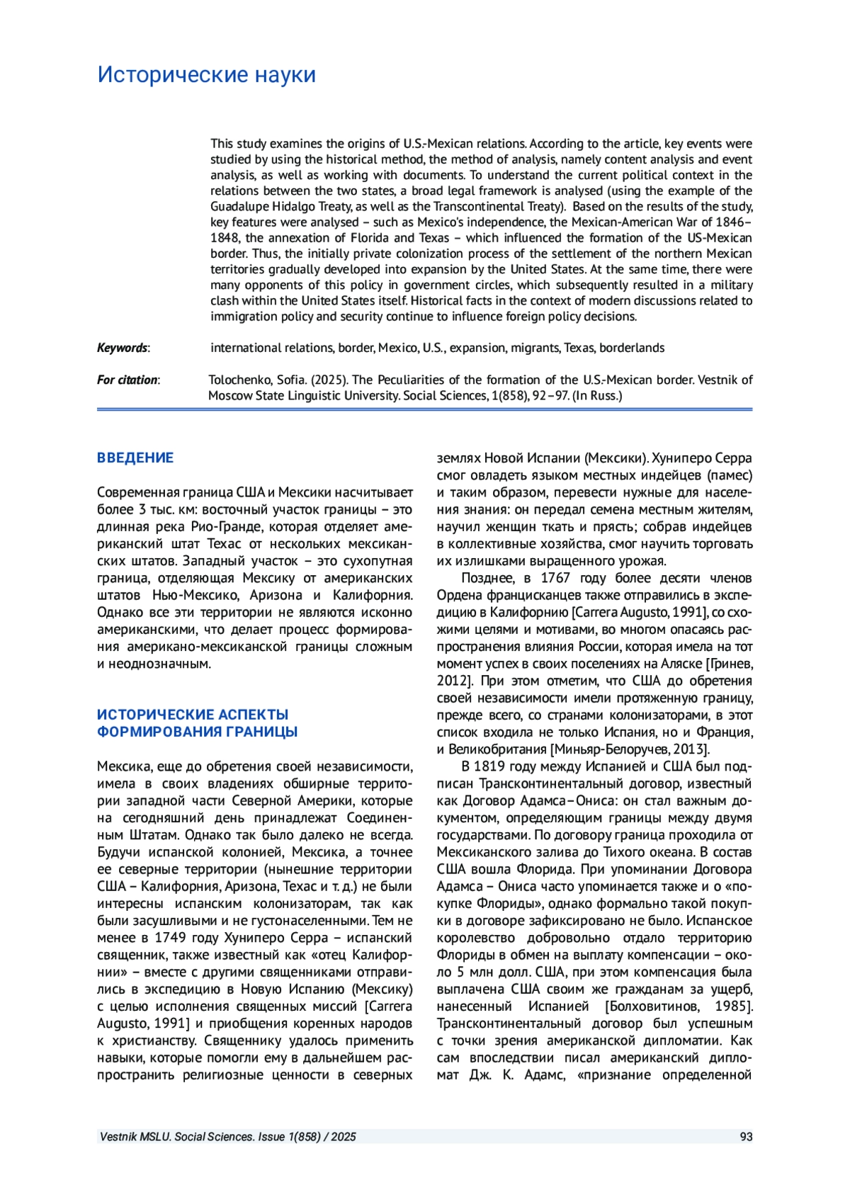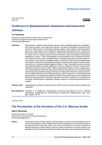 ТОЛОЧЕНКО С. В. ОСОБЕННОСТИ ФОРМИРОВАНИЯ АМЕРИКАНО-МЕКСИКАНСКОЙ ГРАНИЦЫ // ВЕСТНИК МОСКОВСКОГО ГОСУДАРСТВЕННОГО ЛИНГВИСТИЧЕСКОГО УНИВЕРСИТЕТА. ОБЩЕСТВЕННЫЕ НАУКИ. 2025. № 1 (858)