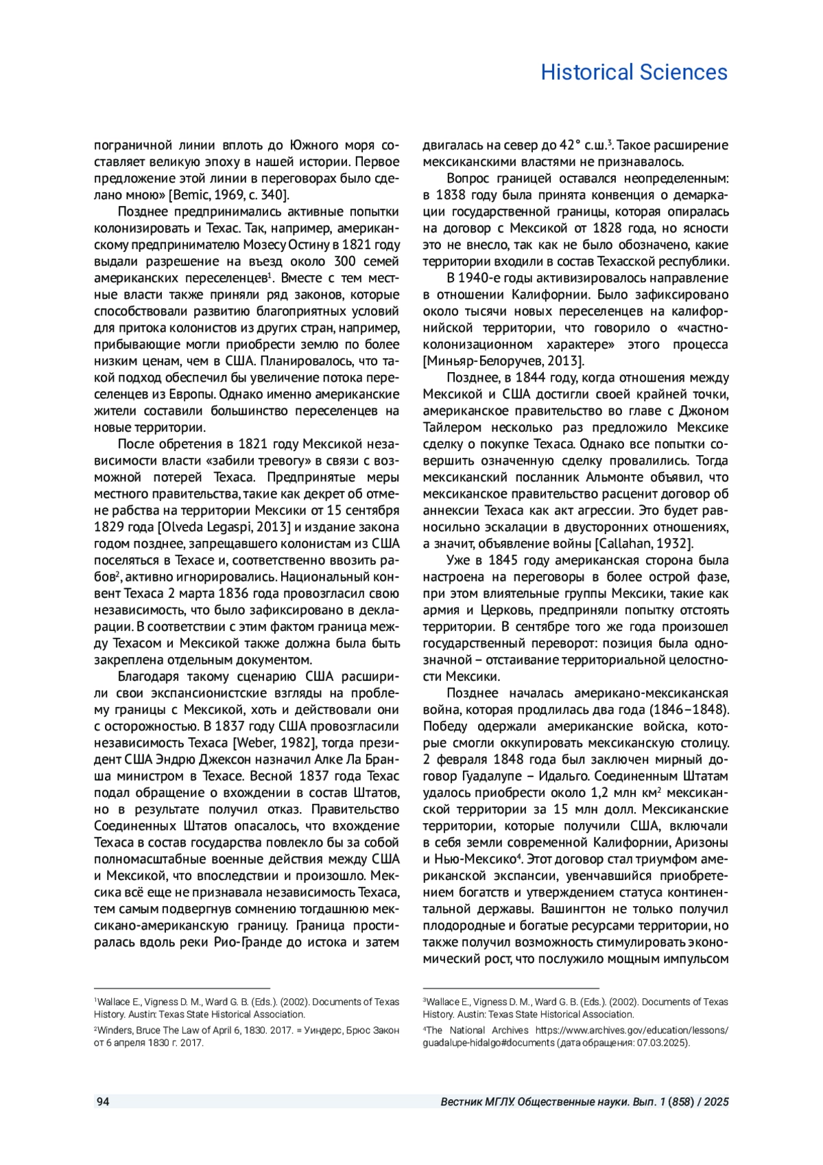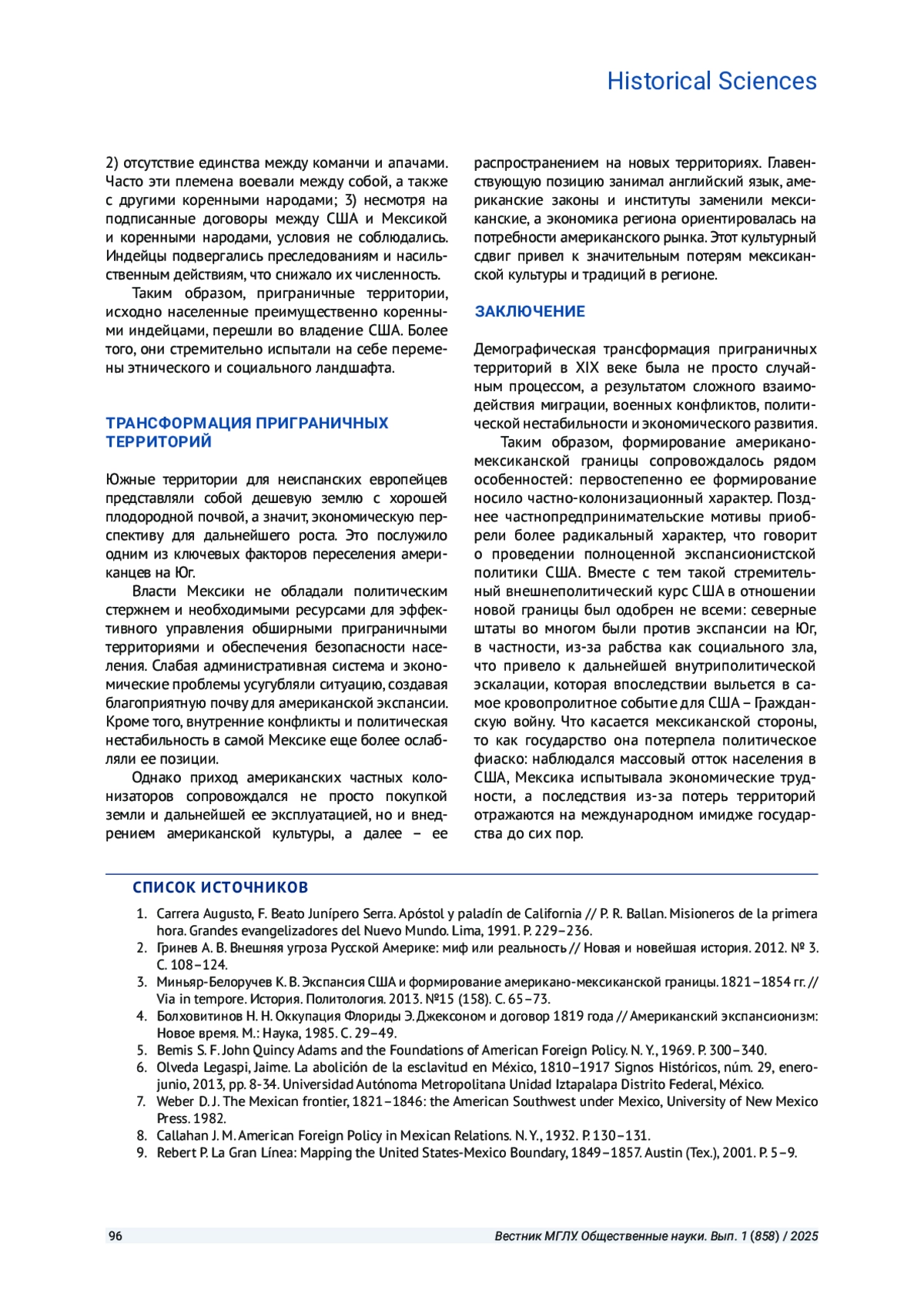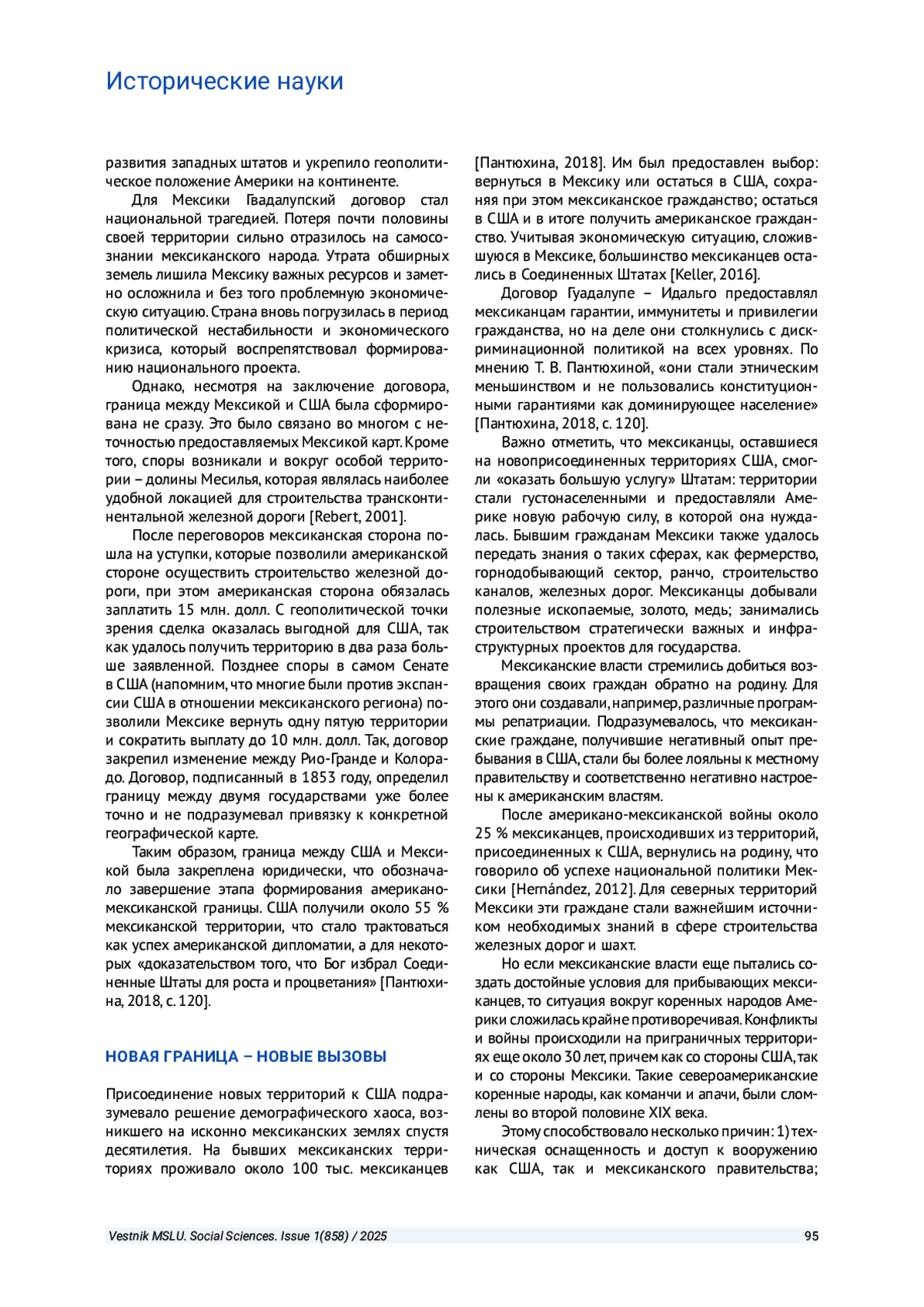 ТОЛОЧЕНКО С. В. ОСОБЕННОСТИ ФОРМИРОВАНИЯ АМЕРИКАНО-МЕКСИКАНСКОЙ ГРАНИЦЫ // ВЕСТНИК МОСКОВСКОГО ГОСУДАРСТВЕННОГО ЛИНГВИСТИЧЕСКОГО УНИВЕРСИТЕТА. ОБЩЕСТВЕННЫЕ НАУКИ. 2025. № 1 (858)