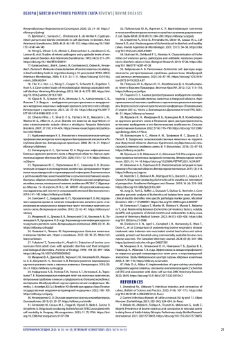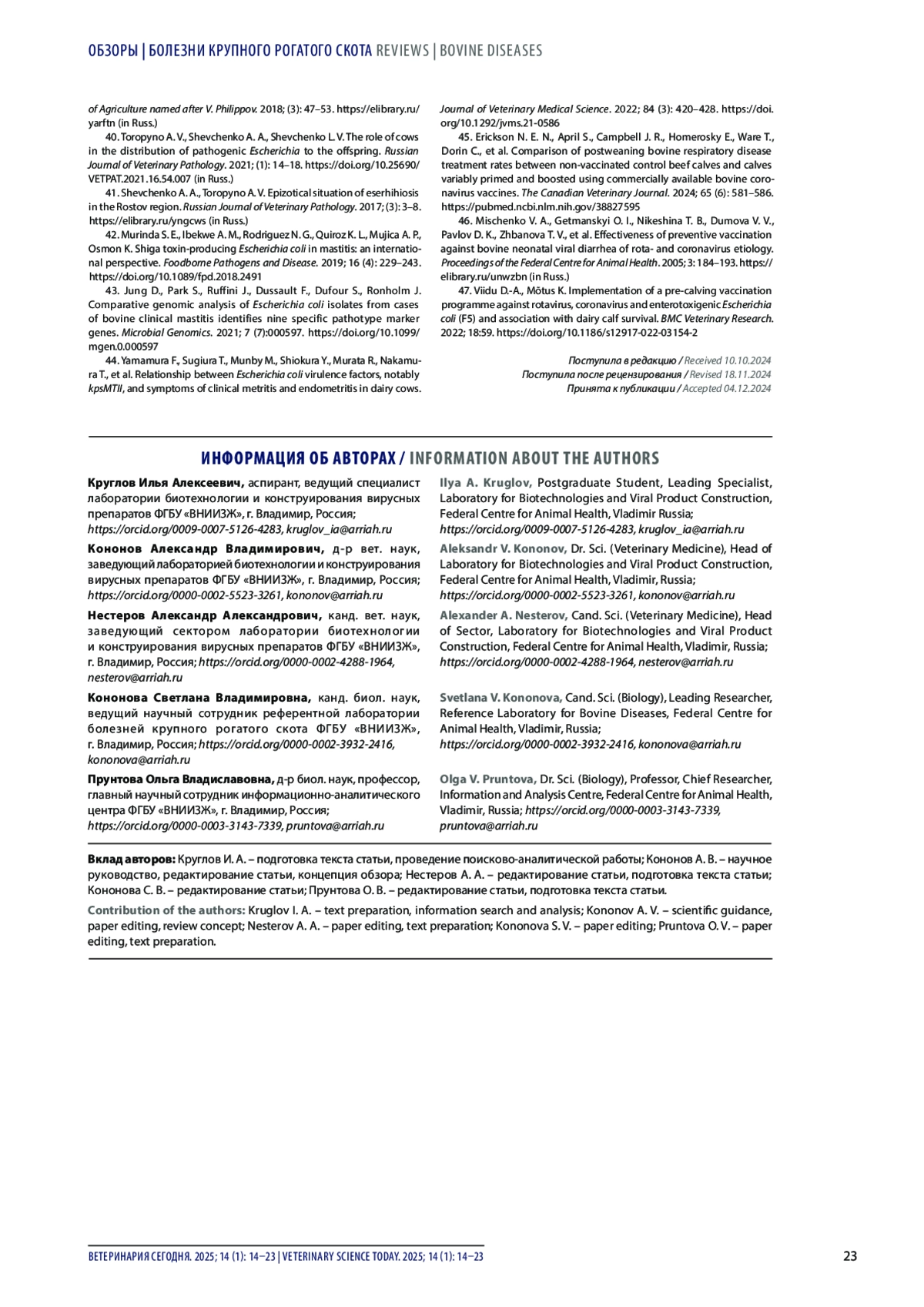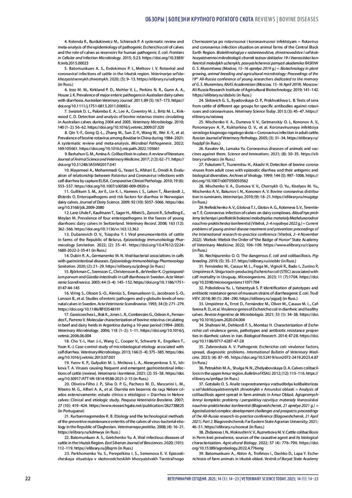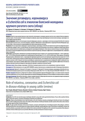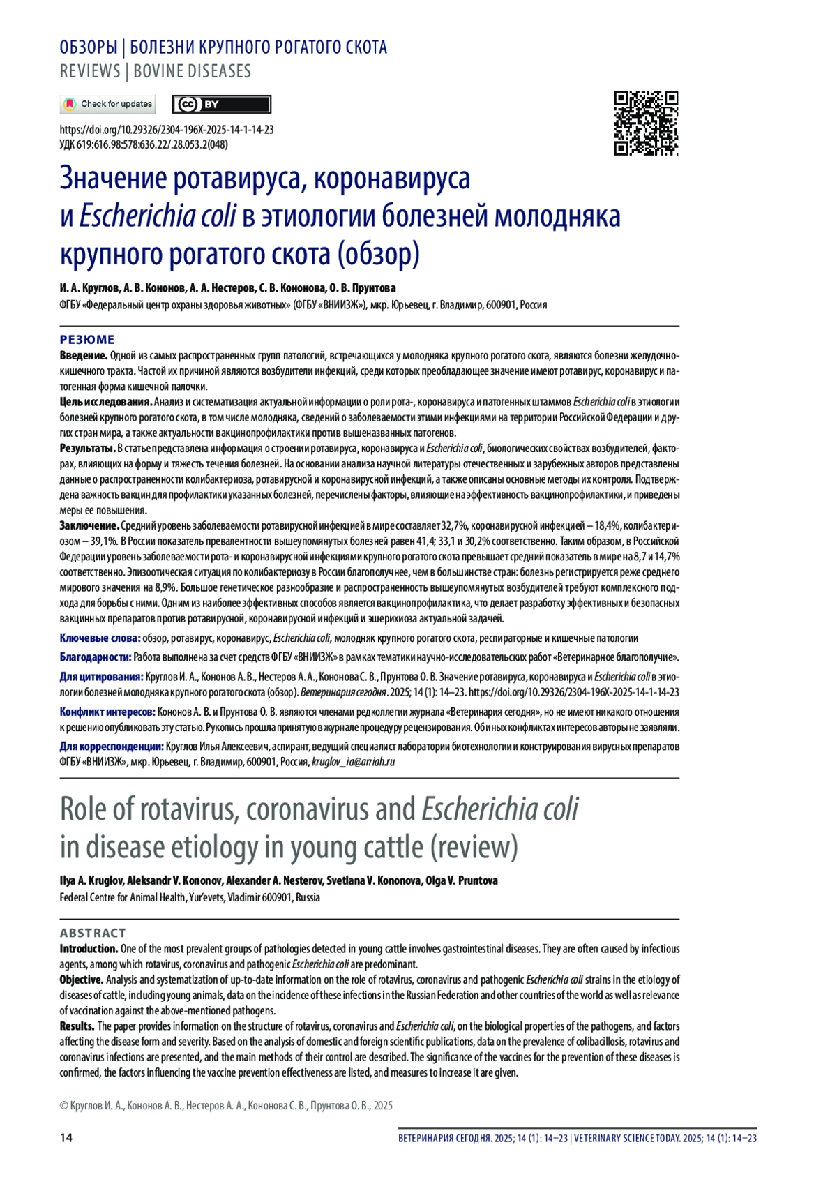 КРУГЛОВ И. А., КОНОНОВ А. В., НЕСТЕРОВ А. А., КОНОНОВА С. В., ПРУНТОВА О. В. ЗНАЧЕНИЕ РОТАВИРУСА, КОРОНАВИРУСА И ESCHERICHIA COLI В ЭТИОЛОГИИ БОЛЕЗНЕЙ МОЛОДНЯКА КРУПНОГО РОГАТОГО СКОТА (ОБЗОР) // ВЕТЕРИНАРИЯ СЕГОДНЯ. 2025. № 1, ТОМ 14
