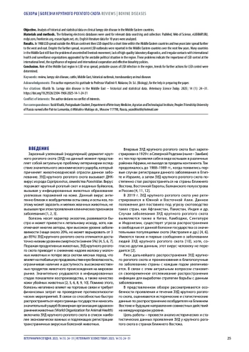 Заключение. Определена роль Ближневосточного региона в распространении возбудителя болезни, названы вероятные причины неблагополучия региона по данному заболеванию, сформулировано направление дальнейших действий в рамках борьбы с заразным узелковым дерматитом крупного рогатого скота.