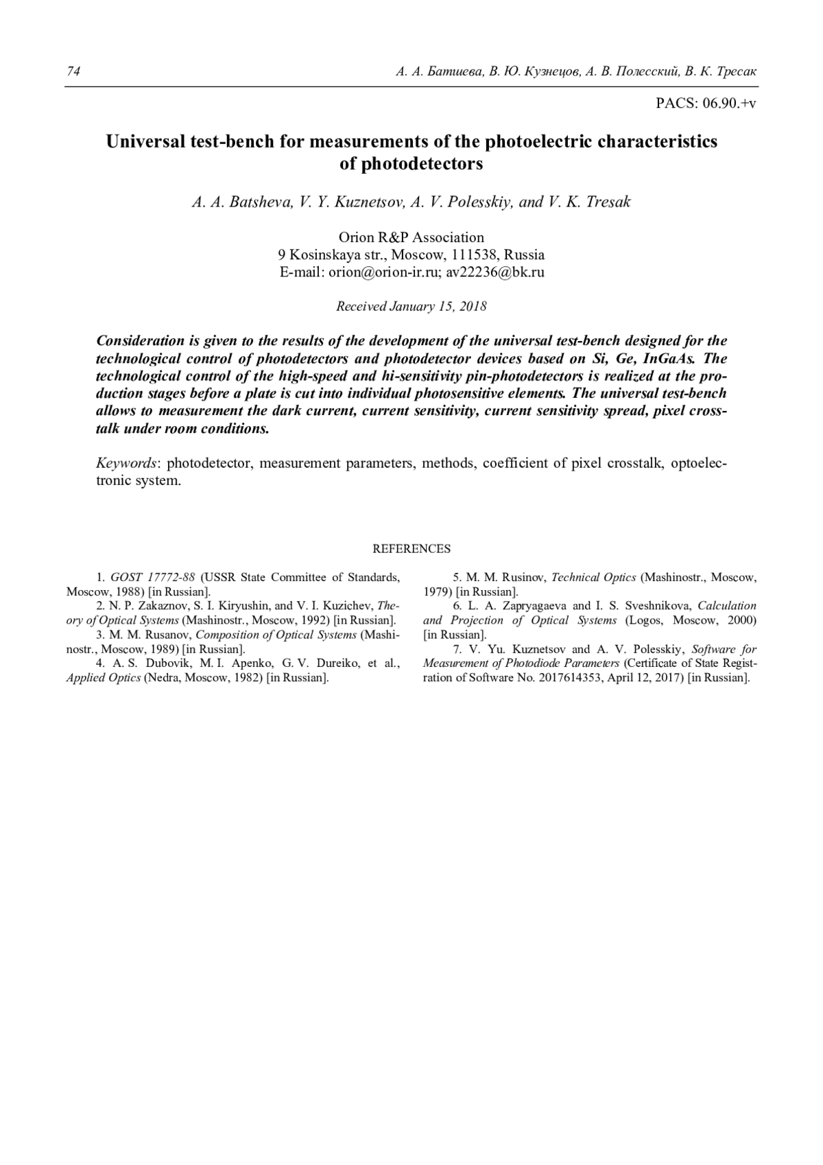 A. A. Batsheva, V. Y. Kuznetsov, A. V. Polesskiy, and V. K. Tresak Universal test-bench for measure-ments of the photoelectric characteristics of photodetectors 68