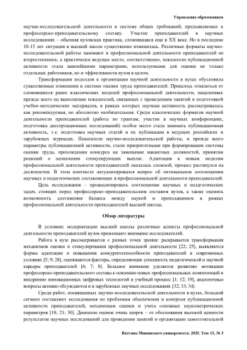 Введение. В последние десятилетия существенно выросла роль научной работы как элемента профессиональной деятельности преподавателей, а показатели публикационной активности стали важнейшими параметрами, используемыми для оценки эффективности не только отдельных работников, но и вузов в целом. Возникла необходимость формирования новых управленческих механизмов, учитывающих изменения в структуре и содержании профессиональной деятельности преподавателей.