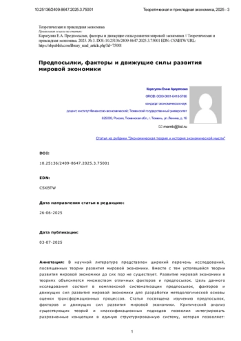 В научной литературе представлен широкий перечень исследований, посвященных теории развития мировой экономики. Вместе с тем устоявшейся теории развития мировой экономики до сих пор не существует. Развитие мировой экономики в теориях объясняется множеством отличных факторов и предпосылок. Цель данного исследования состоит в комплексной систематизации предпосылок, факторов и движущих сил развития мировой экономики для разработки методологической основы оценки трансформационных процессов. Статья посвящена изучению предпосылок, факторов и движущих сил развития мировой экономики. Критический анализ существующих теорий и классификационных подходов позволил интегрировать разрозненные концепции в единую структурированную систему, которая позволяет: выявить ключевые закономерности трансформации мировой экономики через призму экономических, социальных, технологических и политических аспектов; унифицировать критерии оценки динамики развития, включая роль научно-технического прогресса, институциональных и геополитических изменений; сформировать инструментарий прогнозирования структурных изменения в условиях глобальных вызовов. О сновными методами исследования являлись критический и системный анализ теорий развития экономических систем, а также различные классификационные методы. В ходе исследования были отобраны и проанализированы в соответствии классификационными признаками более 100 наиболее цитируемых работ в области теории развития. На основе анализа было выделено 11 предпосылок развития мировой экономики, 15 классификационных критериев факторов развития мировой экономики, а также 4 движущие силы развития, которые будут учтены в дальнейшем при разработке методики оценки трансформационных процессов в мировой экономике. Р езультаты исследования призваны дополнить теоретическую базу мировой экономики и предложить практикоориентированную основу для анализа современных трансформационных тенденций. Полученные результаты будут интересны специалистам в области мировой экономики и международных отношений, научным работникам. Дальнейшие направления исследования связаны с разработкой методологии оценки трансформационных процессов в мировой экономике