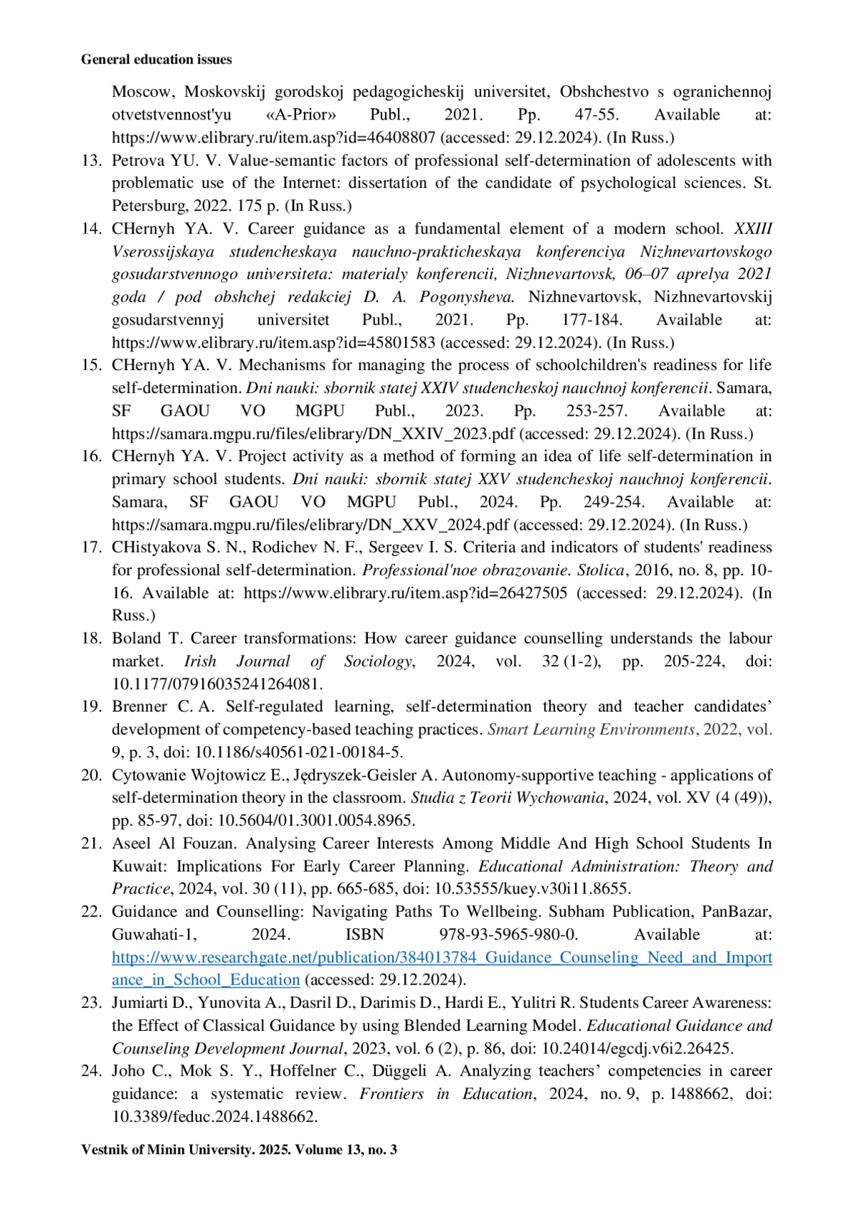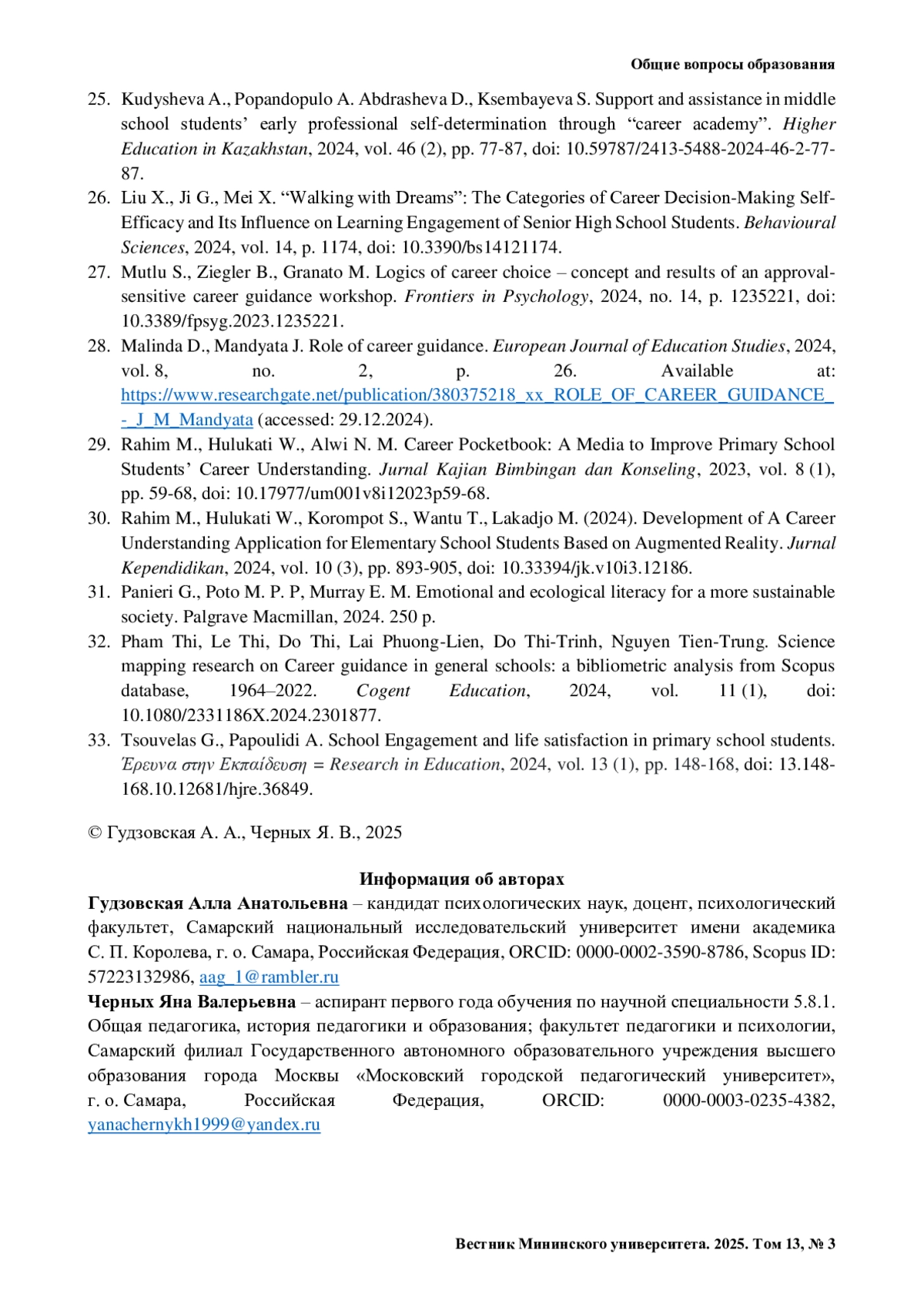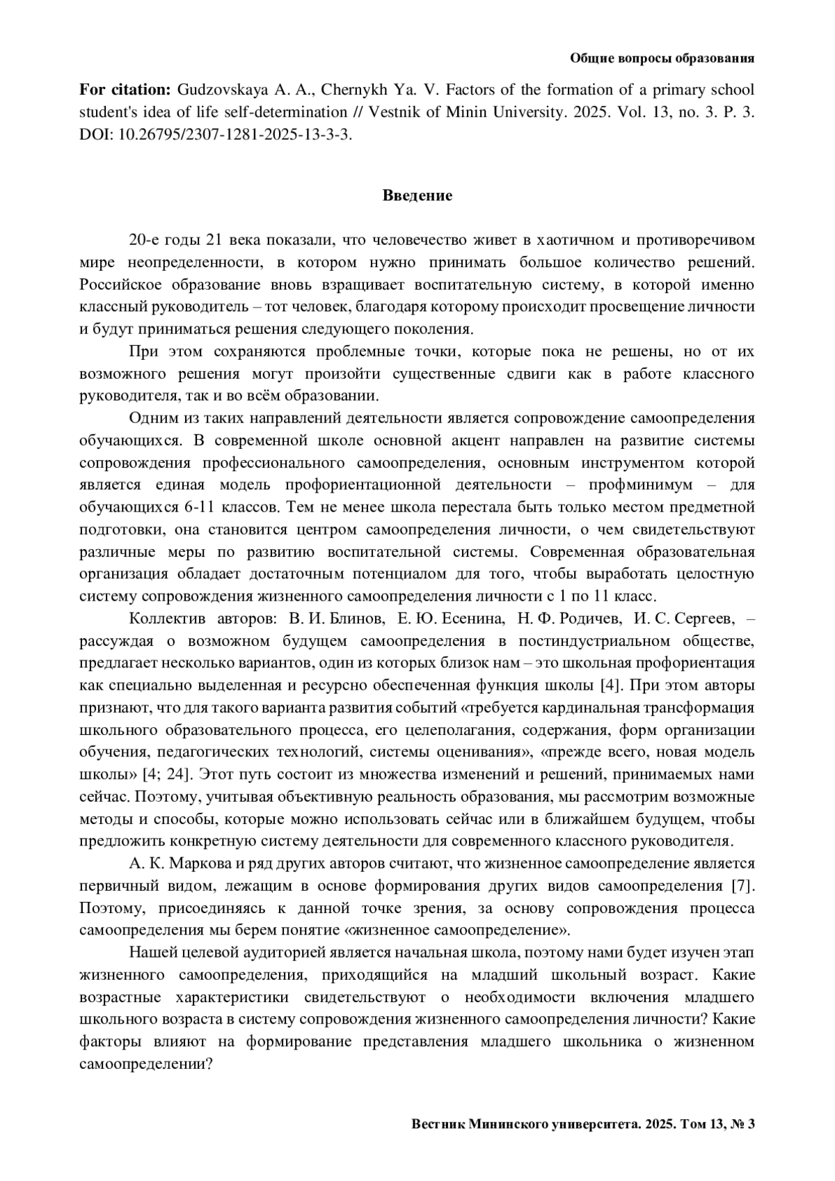 ГУДЗОВСКАЯ А. А., ЧЕРНЫХ Я. В. ФАКТОРЫ ФОРМИРОВАНИЯ ПРЕДСТАВЛЕНИЯ МЛАДШЕГО ШКОЛЬНИКА О ЖИЗНЕННОМ САМООПРЕДЕЛЕНИИ // ВЕСТНИК МИНИНСКОГО УНИВЕРСИТЕТА. 2025. ТОМ 13, № 3