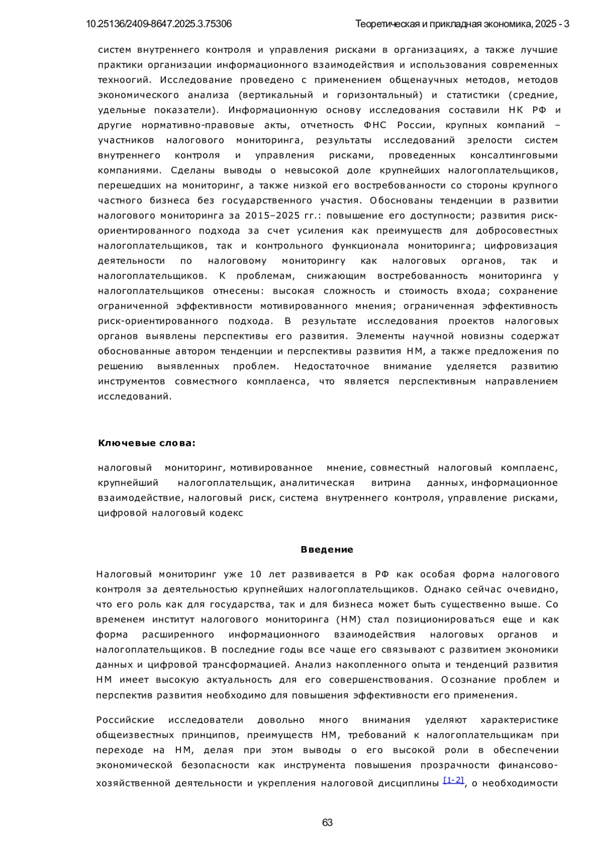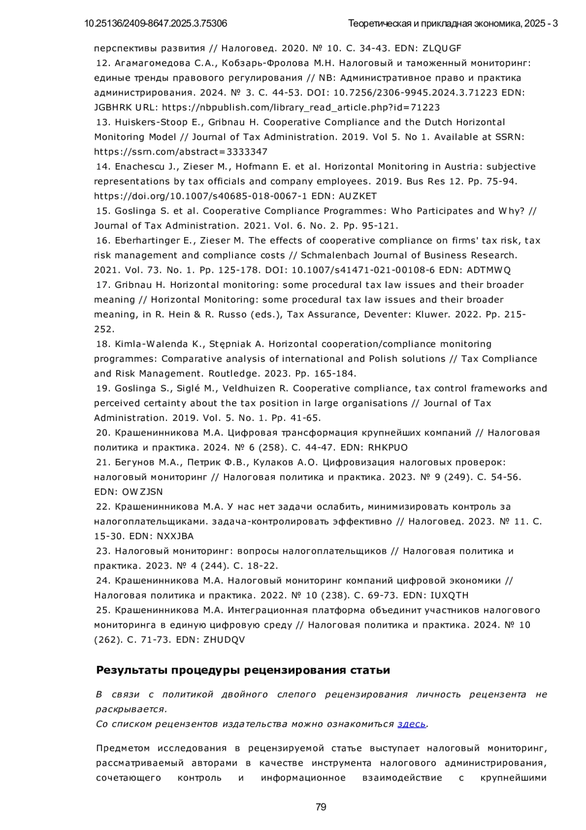 3. Станкевич Г.В. Налоговый мониторинг: отдельные аспекты применения // Экономика. Право. Общество. 2025. Т. 10. № 1 (41). С. 154-160. DOI: 10.21686/2411-118X-2025-1-154-160 EDN: ORRSPB