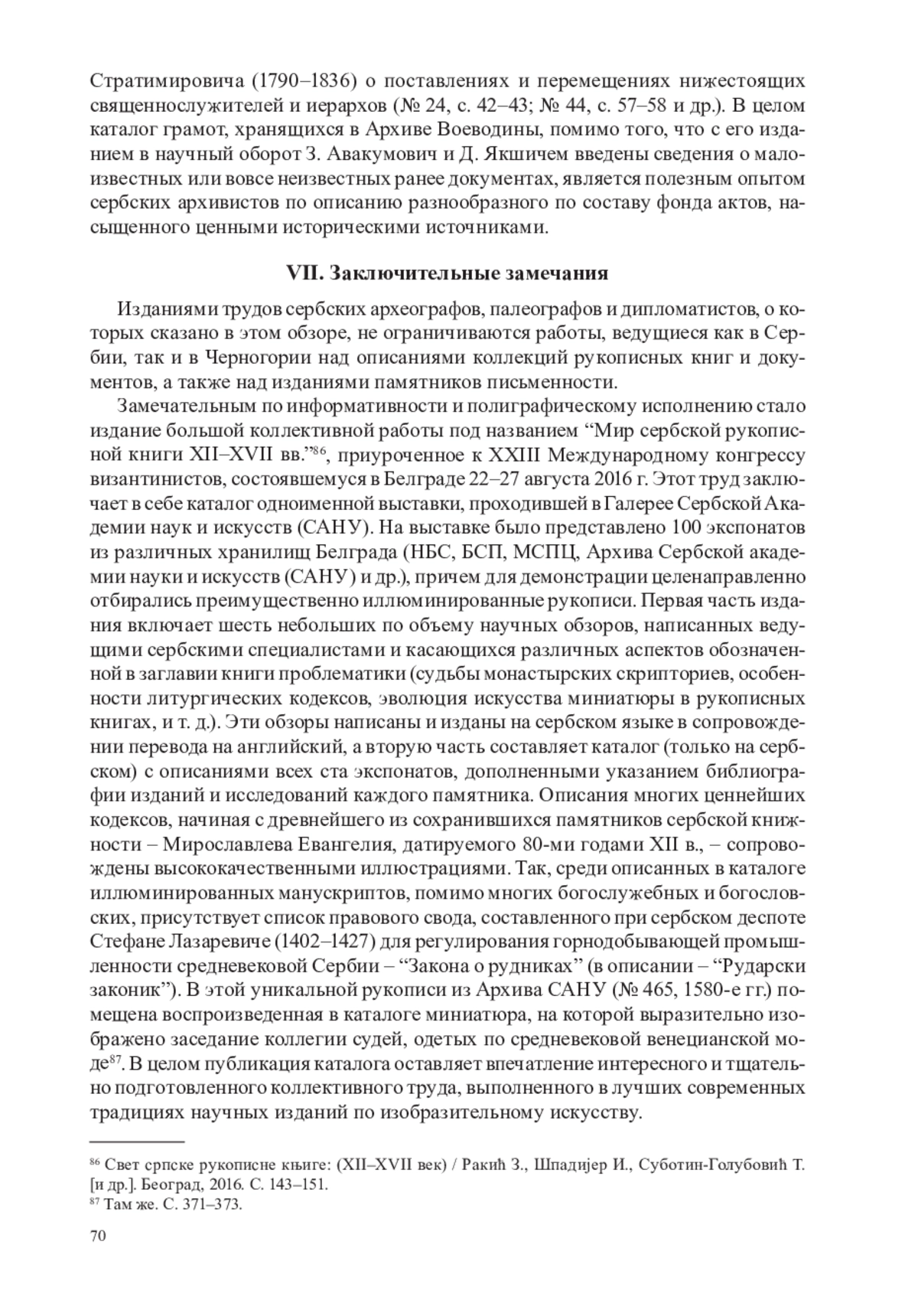 Цель этой статьи – сообщить об основных достижениях и особенностях развития археографической науки в Сербии, отраженных в изданиях описаний рукописных книг, прежде всего кириллических, а также исторических документов, опубликованных на протяжении 2016–2023 гг. Так как работа в этой области, ведущаяся сербскими коллегами, весьма обширна, в рамках одной статьи невозможно охватить все публикации последнего времени и все их аспекты. Поэтому первостепенное внимание здесь будет уделено изданиям каталогов различных собраний рукописей и документов, находящихся как в самой Сербии, так и за ее пределами. В ряду рукописей, представленных в этих описаниях, примечательны письменные памятники истории русско-сербских связей, о чем подробнее будет сказано ниже.
