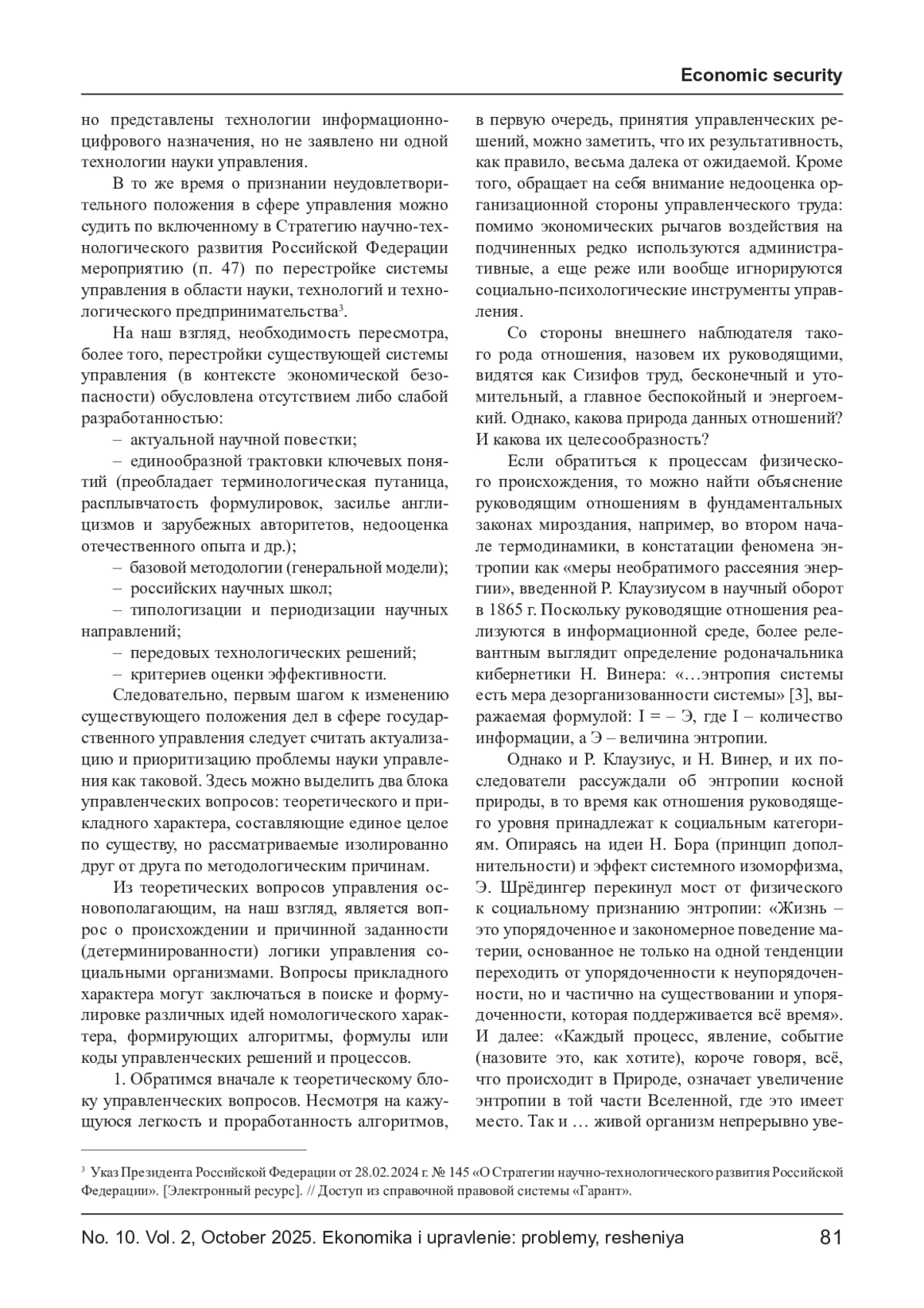 В статье поставлен вопрос об актуализации проблемы науки управления как таковой, в частности, в сфере управления экономической безопасностью. Рассмотрены отдельные положения теории и практики управления. Раскрыты особенности управленческого труда и лежащие в её основании фундаментальные законы мироздания. Обращено внимание на существовании в науке управления семейства детерминант (инвариантов), овладение которыми, по мнению авторов, позволит повысить результативность управленческой деятельности.
