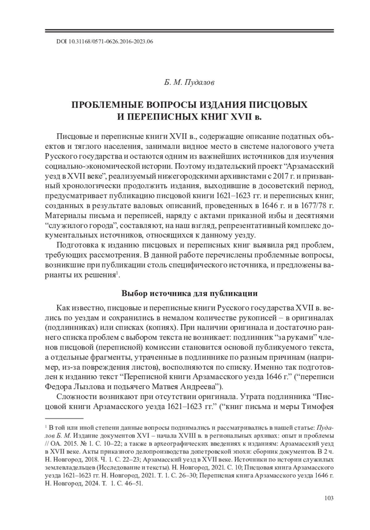 1. Пудалов Б.М. Издание документов XVI - начала XVIII в. в региональных архивах: опыт и проблемы // Отечественные архивы. 2015. № 1. С. 10-22.