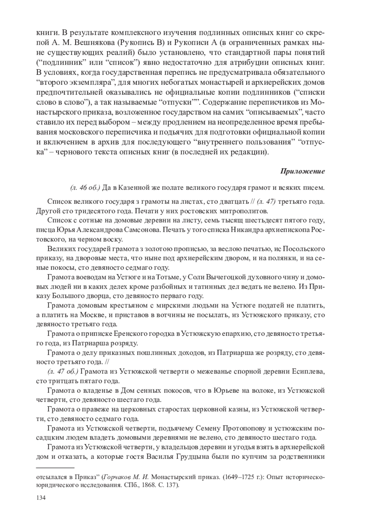 Одной из задач описания церковно-монастырских владений и имуществ начала XVIII в., производившегося по именному указу от 31 января 1701 г., являлась фиксация документально подтвержденных прав Русской православной церкви на земли, угодья и различные промыслы, городские и посадские дворы и т. п.1 Согласно “типовому” наказу переписчикам из Монастырского приказа, текст которого недавно опубликован, они должны были “жалованные грамоты, и вкладные, и иные всякие вотчинные крепости, и зделочные писма по тому же пересмотреть и переписать все имянно”2. Соответственно, в описных книгах, как правило, находят отражение сведения о монастырских и архиерейских документальных собраниях. Следует подчеркнуть, что архивы архиерейских домов, несмотря на публикацию ряда их описей, остаются менее изученными по сравнению с монастырскими3.