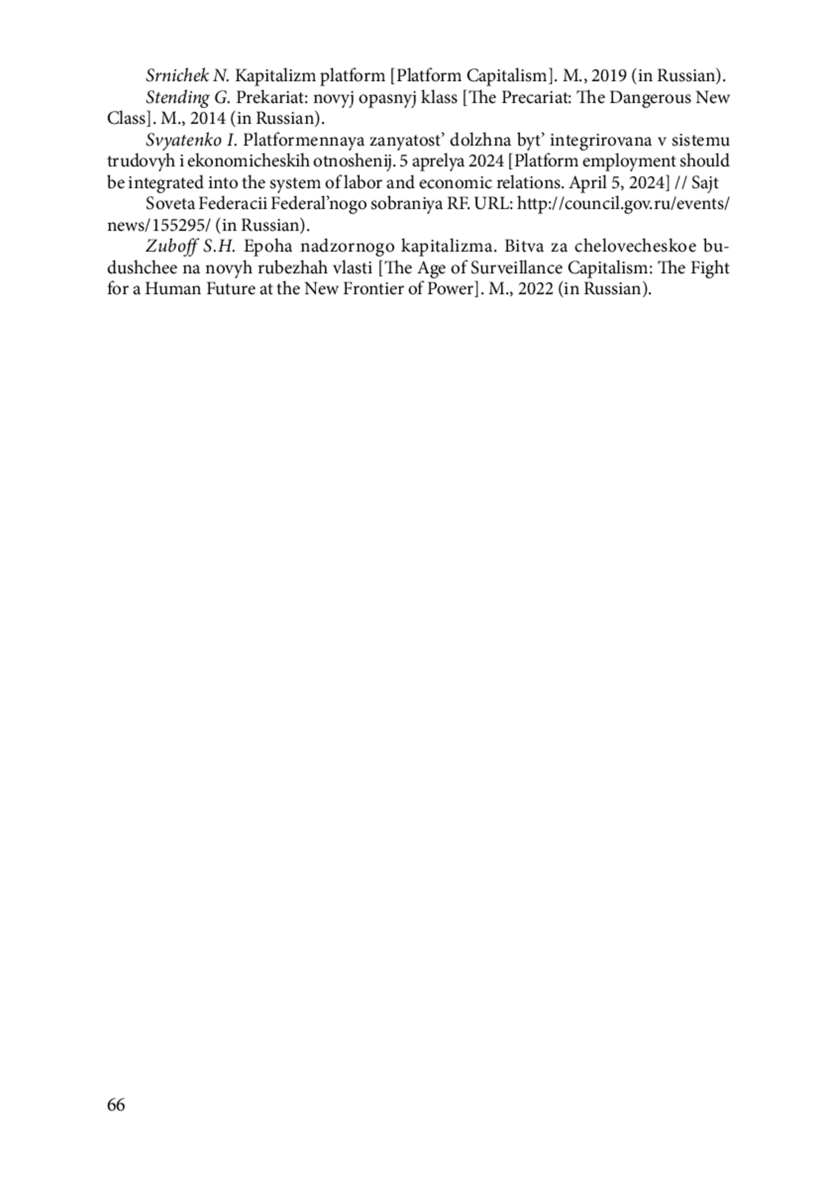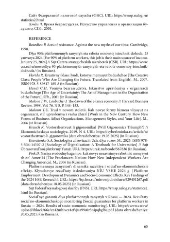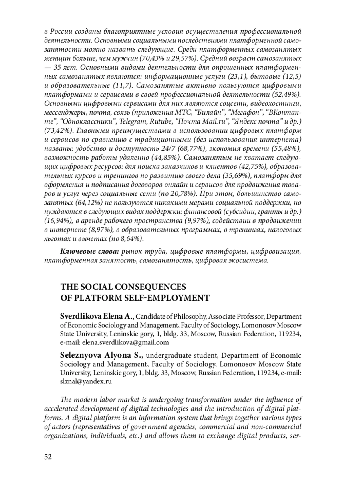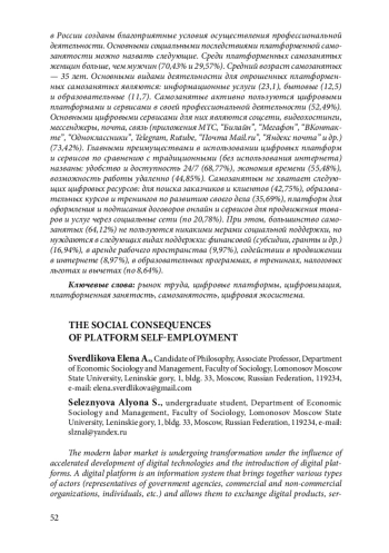 Современный рынок труда трансформируется под воздействием ускоренного развития цифровых технологий и внедрения цифровых платформ. Цифровая платформа представляет собой информационную систему, объединяющую различные типы акторов (представители государственных органов, коммерческих и некоммерческих организаций, физические лица и др.) и позволяющую им обмениваться цифровыми продуктами, услугами и информацией в цифровом пространстве. Платформенная занятость представляет собой гибкую форму организации труда, при которой взаимодействие между акторами осуществляется через такие цифровые платформы. Наиболее распространенными видами платформенной занятости являются онлайн-фриланс, доставка, логистика и образование. Современные самозанятые частично или полностью перенесли часть своих трудовых функций на цифровые платформы. Важно отметить, что не все самозанятые трудятся на цифровых платформах. И в платформенную занятость включены не только самозанятые, но и другие категории работников. Рост платформенной самозанятости влечет за собой многочисленные социальные последствия: как положительные, так и отрицательные. Среди них: снижение уровня социальной защиты, ухудшение условий труда, рост неравенства и отсутствие стабильности труда. Данная статья основана на результатах опроса тех самозанятых, кто осуществляет свою профессиональную деятельность через цифровые платформы и столкнулся с первым опытом анализа и оценки опыта своей профессиональной деятельности на цифровой экосистеме самозанятости. Главный вывод исследования: большинство самозанятых согласны (62,32%) с утверждением, что сегодня в России созданы благоприятные условия осуществления профессиональной деятельности. Основными социальными последствиями платформенной самозанятости можно назвать следующие. Среди платформенных самозанятых женщин больше, чем мужчин (70,43% и 29,57%). Средний возраст самозанятых — 35 лет. Основными видами деятельности для опрошенных платформенных самозанятых являются: информационные услуги (23,1), бытовые (12,5) и образовательные (11,7). Самозанятые активно пользуются цифровыми платформами и сервисами в своей профессиональной деятельности (52,49%). Основными цифровыми сервисами для них являются соцсети, видеохостинги, мессенджеры, почта, связь (приложения МТС, “Билайн”, “Мегафон”, “ВКонтакте”, “Одноклассники”, Telegram, Rutube, “Почта Mail. ru”, “Яндекс почта” и др.) (73,42%). Главными преимуществами в использовании цифровых платформ и сервисов по сравнению с традиционными (без использования интернета) названы: удобство и доступность 24/7 (68,77%), экономия времени (55,48%), возможность работы удаленно (44,85%). Самозанятым не хватает следующих цифровых ресурсов: для поиска заказчиков и клиентов (42,75%), образовательных курсов и тренингов по развитию своего дела (35,69%), платформ для оформления и подписания договоров онлайн и сервисов для продвижения товаров и услуг через социальные сети (по 20,78%). При этом, большинство самозанятых (64,12%) не пользуются никакими мерами социальной поддержки, но нуждаются в следующих видах поддержки: финансовой (субсидии, гранты и др.) (16,94%), в аренде рабочего пространства (9,97%), содействии в продвижении в интернете (8,97%), в образовательных программах, в тренингах, налоговых льготах и вычетах (по 8,64%).