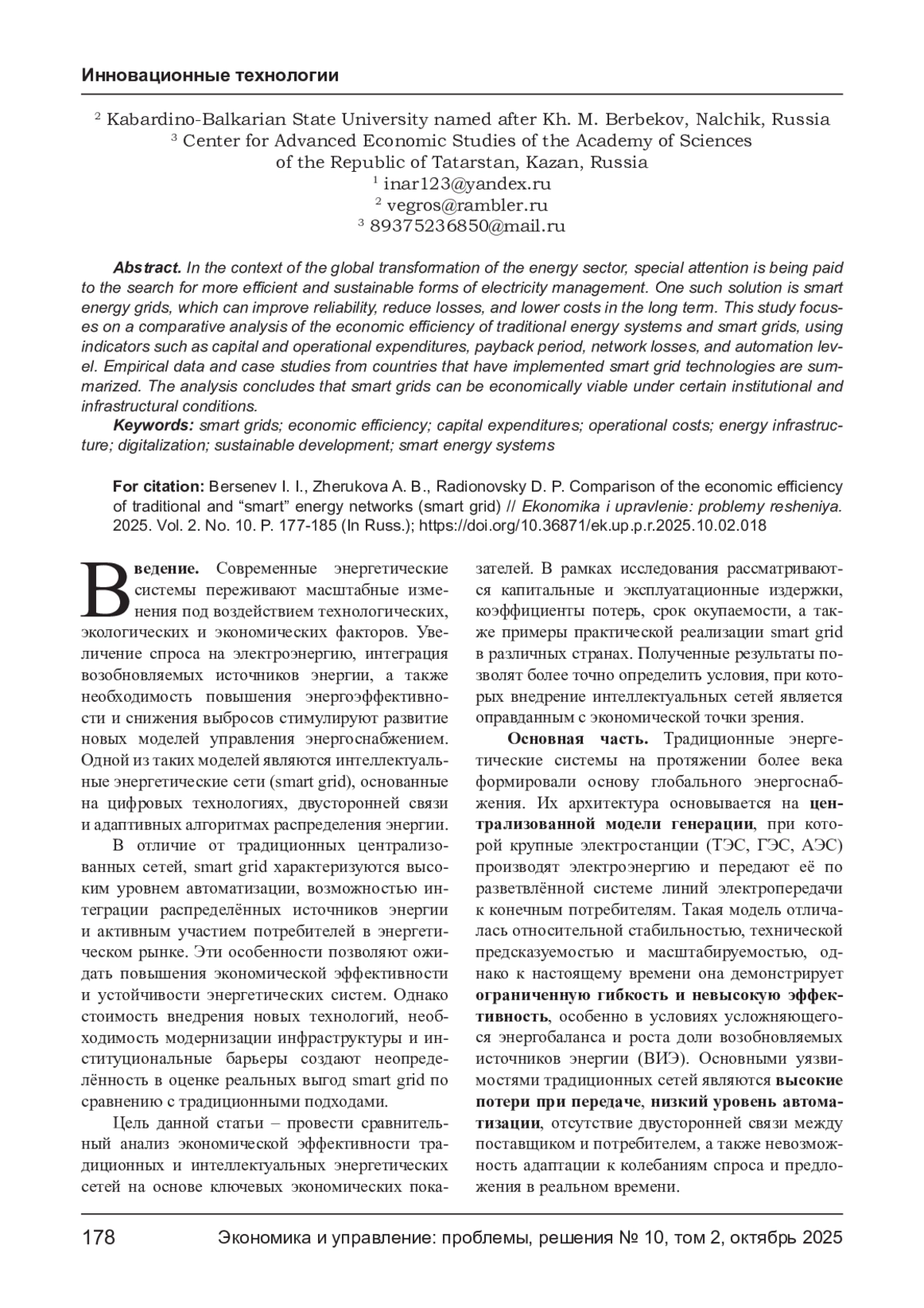 В условиях глобальной трансформации энергетического сектора особое внимание уделяется поиску более эффективных и устойчивых форм управления электроэнергией. Одним из таких решений являются интеллектуальные энергетические сети (smart grid), способные повысить надежность, сократить потери и снизить затраты в долгосрочной перспективе. Настоящее исследование направлено на сравнительный анализ экономической эффективности традиционных энергетических систем и smart grid на основе таких показателей, как капитальные и эксплуатационные затраты, срок окупаемости, потери в сети и уровень автоматизации. Обобщены эмпирические данные и кейсы внедрения интеллектуальных сетей в различных странах. Сделан вывод о потенциальной рентабельности smart grid при определённых институциональных и инфраструктурных условиях.