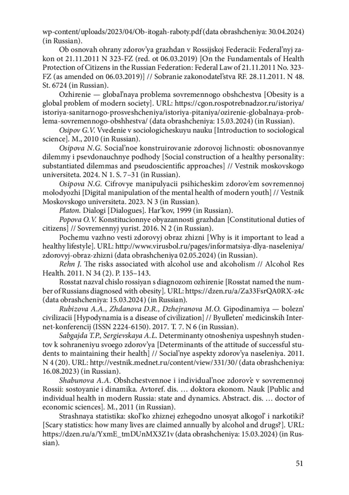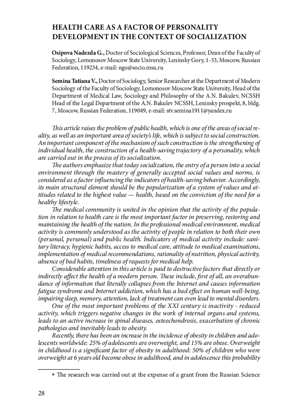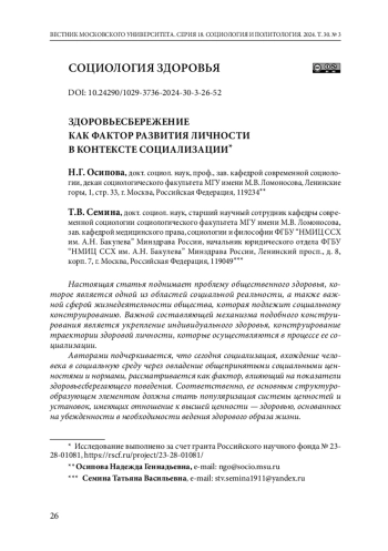 ОСИПОВА Н. Г., СЕМИНА Т. В. ЗДОРОВЬЕСБЕРЕЖЕНИЕ КАК ФАКТОР РАЗВИТИЯ ЛИЧНОСТИ В КОНТЕКСТЕ СОЦИАЛИЗАЦИИ // ВЕСТНИК МОСКОВСКОГО УНИВЕРСИТЕТА. СЕРИЯ 18. СОЦИОЛОГИЯ И ПОЛИТОЛОГИЯ. 2024. ТОМ 30 № 3