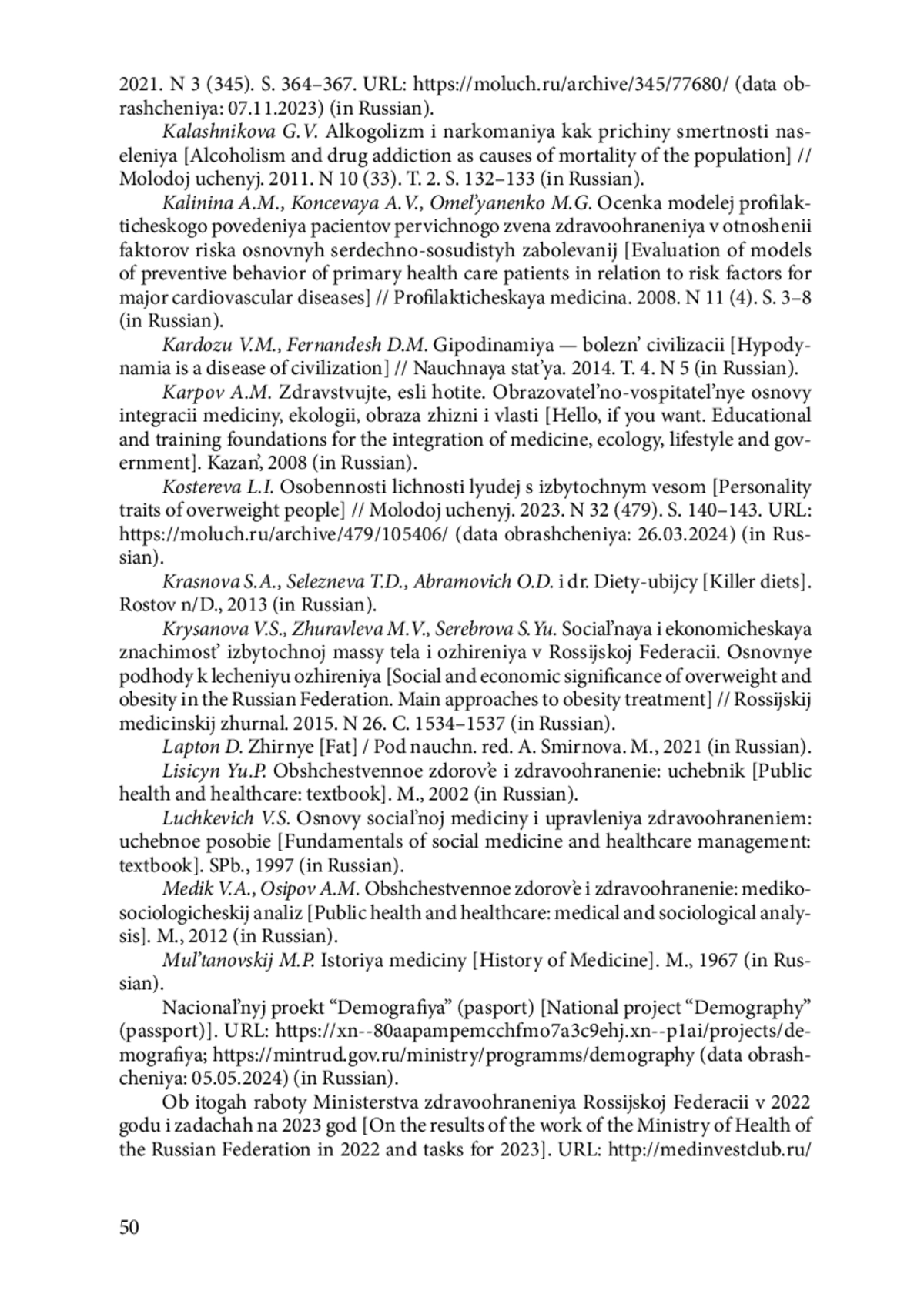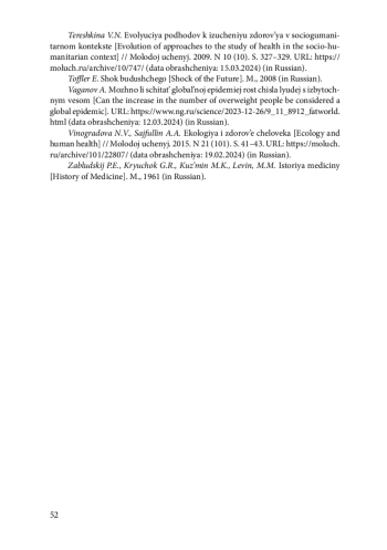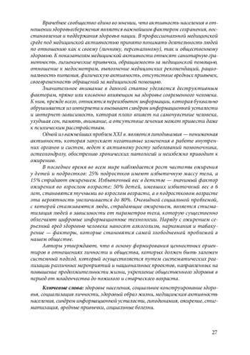 Ключевые фразы: здоровье населения, СОЦИАЛЬНОЕ КОНСТРУИРОВАНИЕ ЗДОРОВЬЯ, социализация личности, здо-ровый образ жизни, медицинская активность населения, синдром информационной уста-лости, гиподинамия, ожирение, стигматизация, ВРЕДНЫЕ ПРИВЫЧКИ, социальные болезни