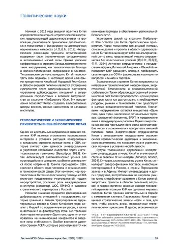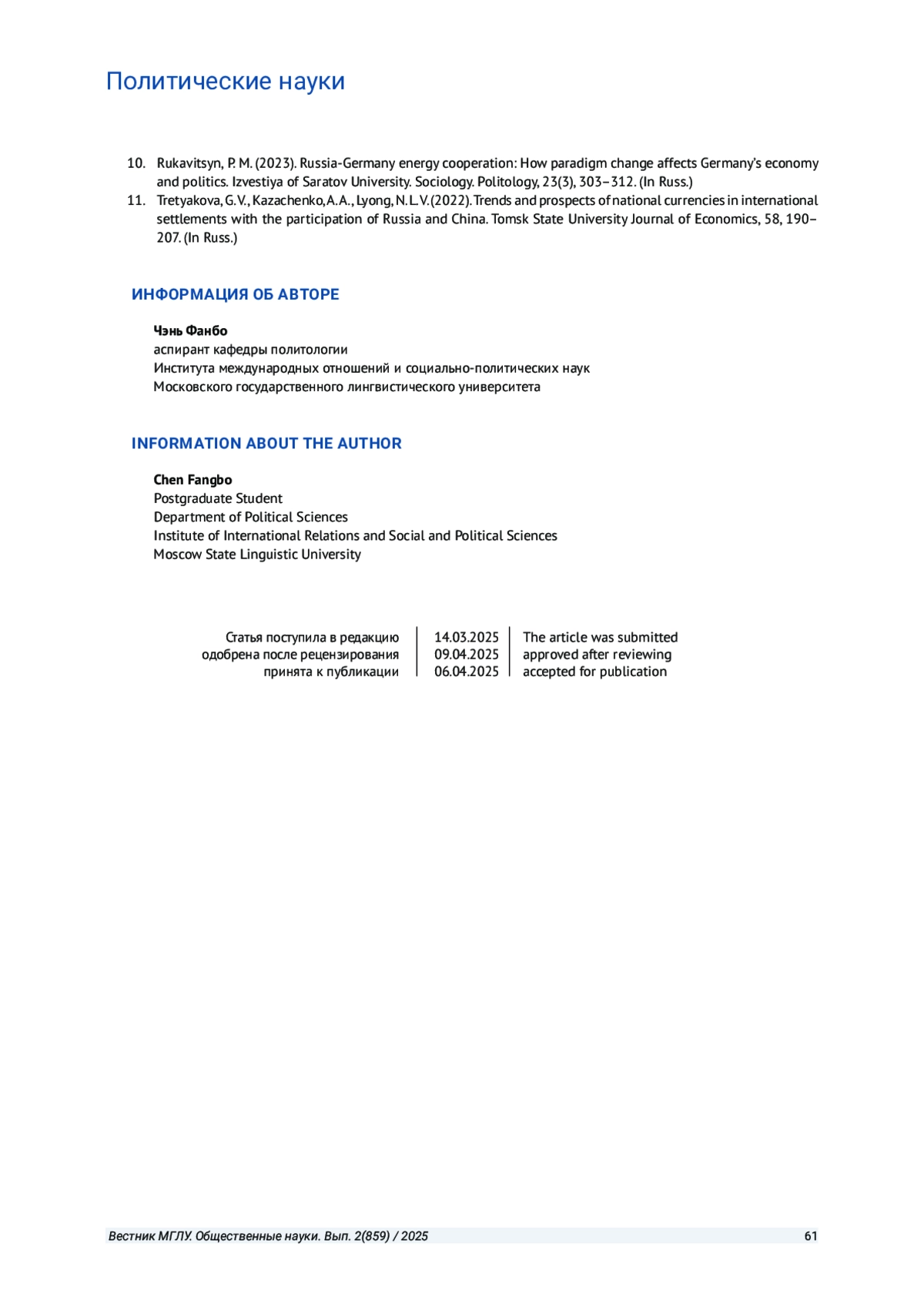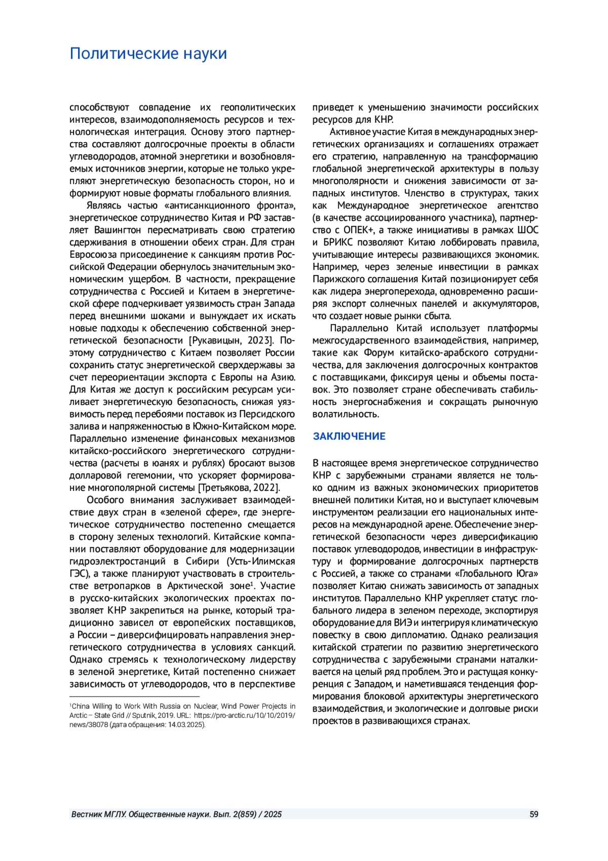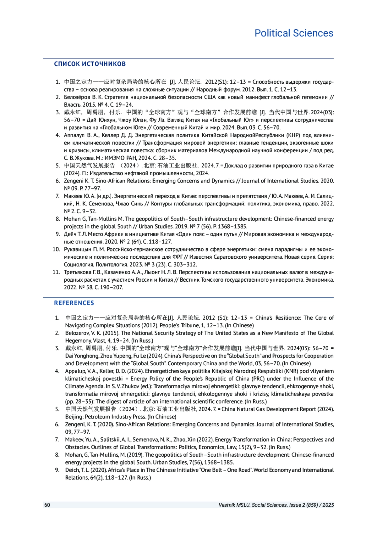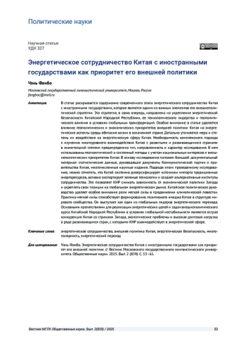 ЧЭНЬ Ф. ЭНЕРГЕТИЧЕСКОЕ СОТРУДНИЧЕСТВО КИТАЯ С ИНОСТРАННЫМИ ГОСУДАРСТВАМИ КАК ПРИОРИТЕТ ЕГО ВНЕШНЕЙ ПОЛИТИКИ // ВЕСТНИК МОСКОВСКОГО ГОСУДАРСТВЕННОГО ЛИНГВИСТИЧЕСКОГО УНИВЕРСИТЕТА. ОБЩЕСТВЕННЫЕ НАУКИ. 2025. № 2 (859)