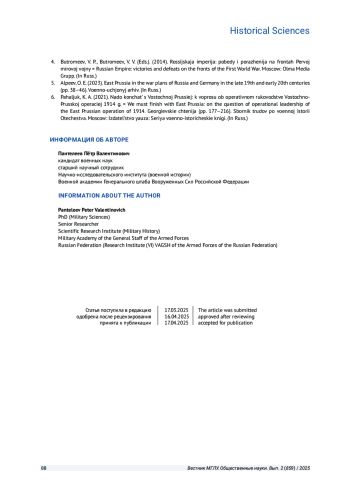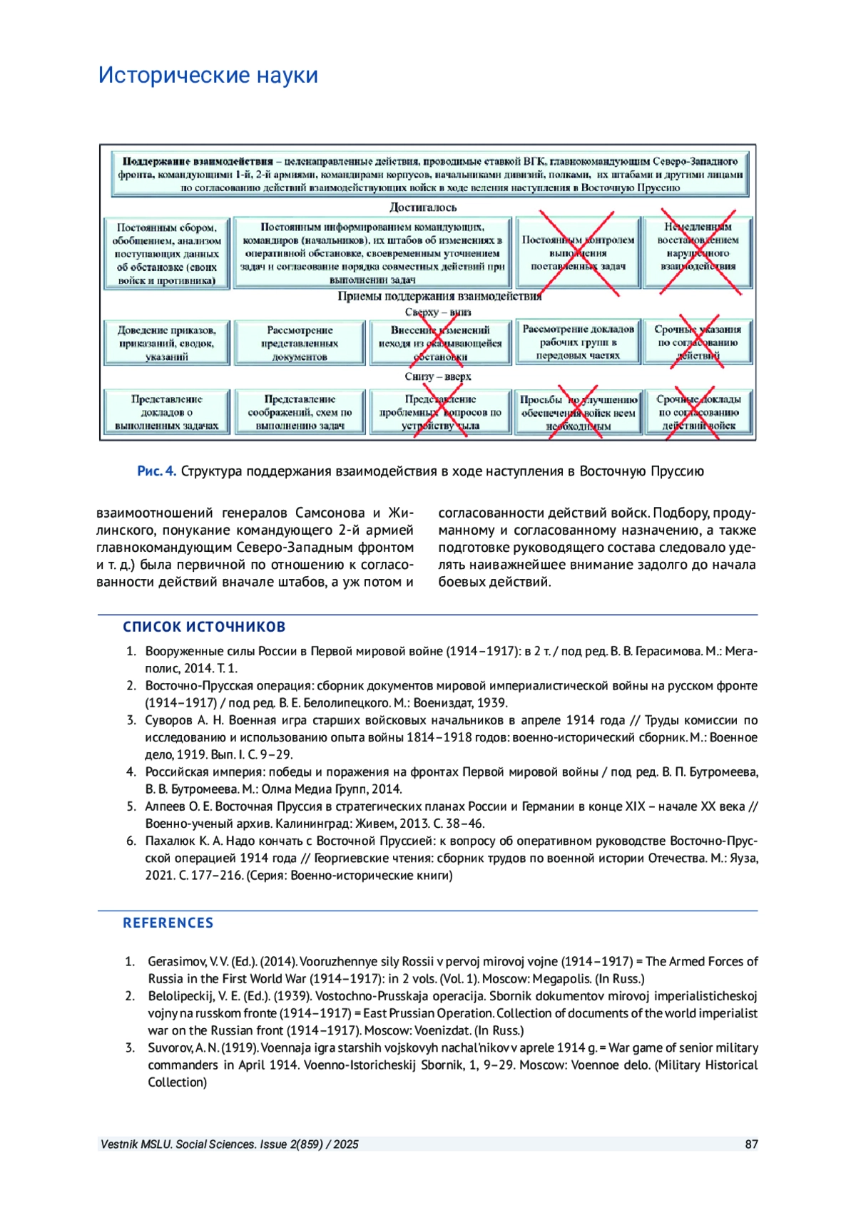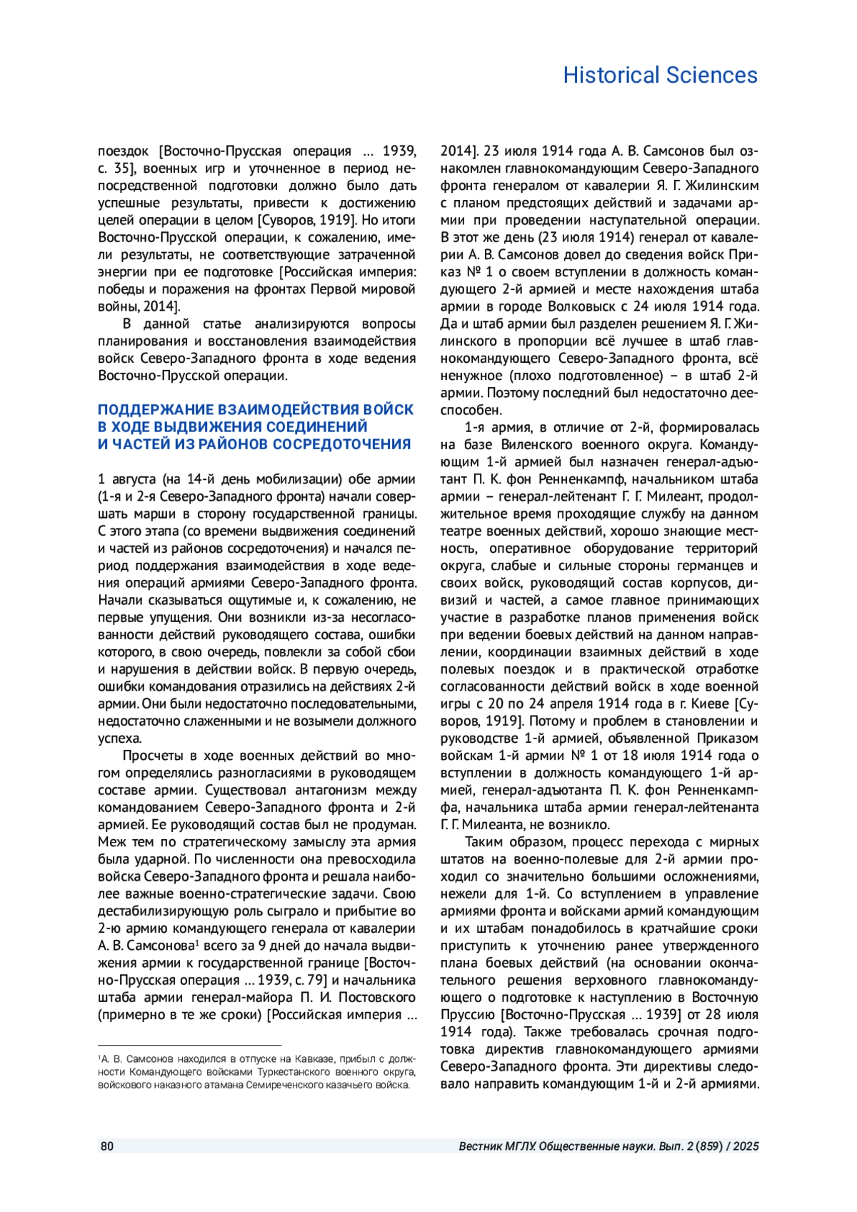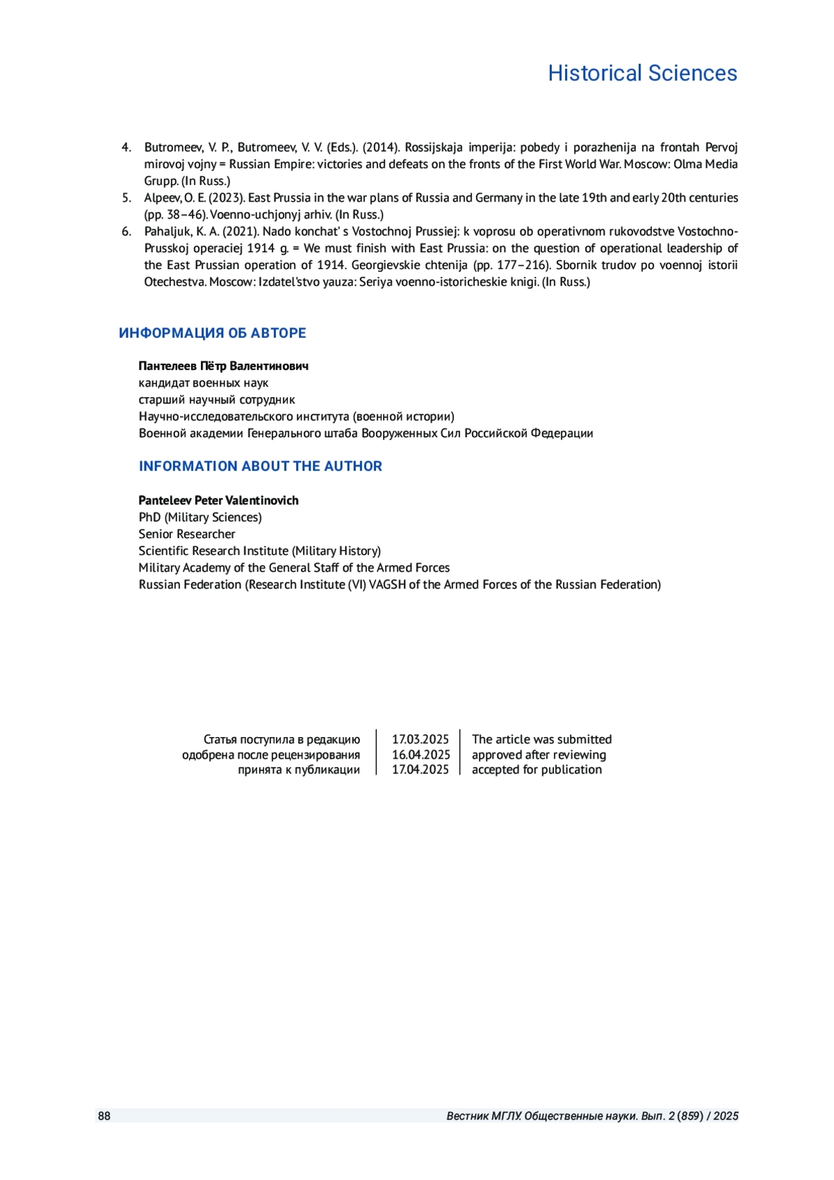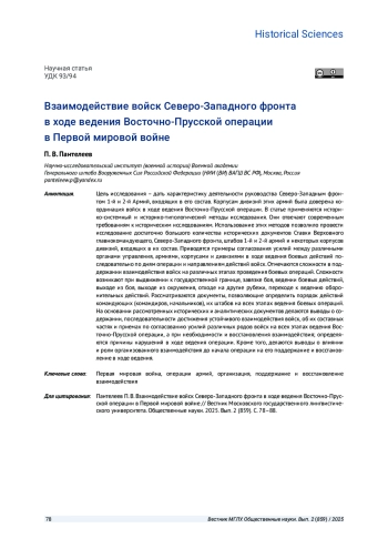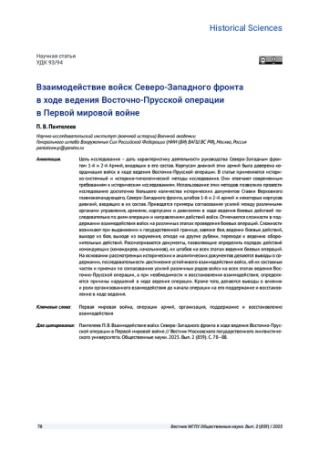 ПАНТЕЛЕЕВ П. В. ВЗАИМОДЕЙСТВИЕ ВОЙСК СЕВЕРО-ЗАПАДНОГО ФРОНТА В ХОДЕ ВЕДЕНИЯ ВОСТОЧНО-ПРУССКОЙ ОПЕРАЦИИ В ПЕРВОЙ МИРОВОЙ ВОЙНЕ // ВЕСТНИК МОСКОВСКОГО ГОСУДАРСТВЕННОГО ЛИНГВИСТИЧЕСКОГО УНИВЕРСИТЕТА. ОБЩЕСТВЕННЫЕ НАУКИ. 2025. № 2 (859)