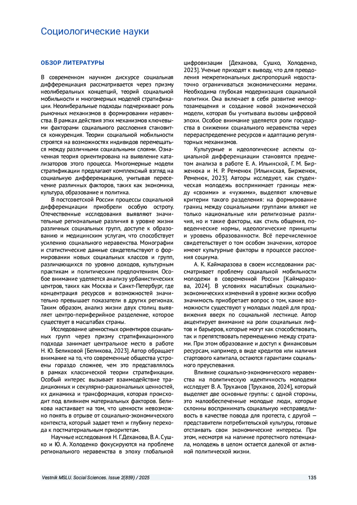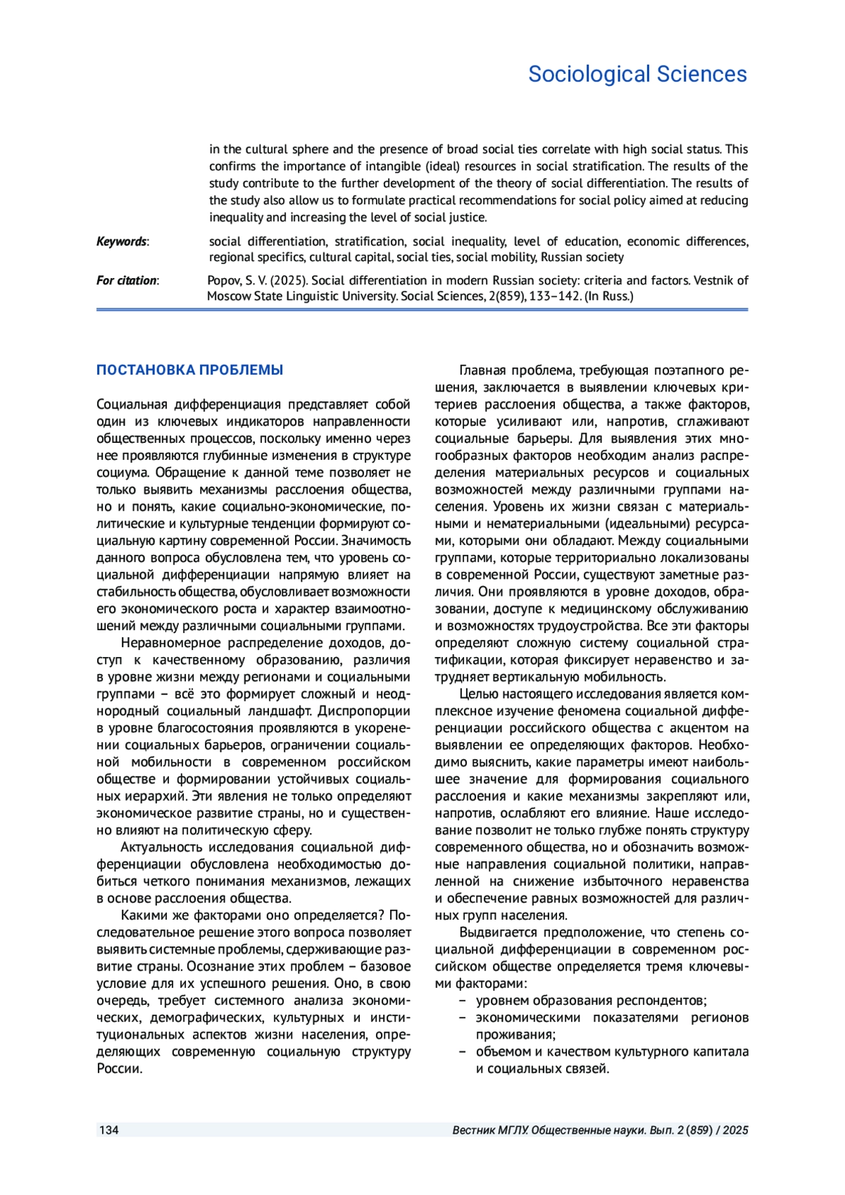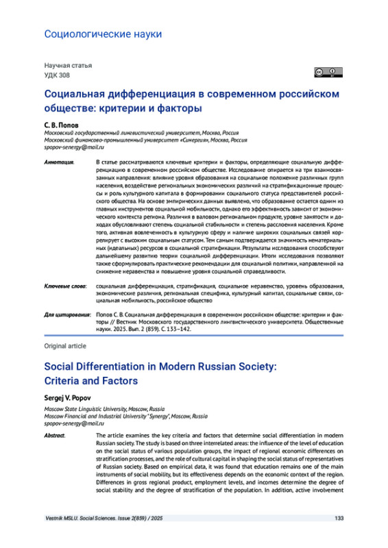ПОПОВ С. В. СОЦИАЛЬНАЯ ДИФФЕРЕНЦИАЦИЯ В СОВРЕМЕННОМ РОССИЙСКОМ ОБЩЕСТВЕ: КРИТЕРИИ И ФАКТОРЫ // ВЕСТНИК МОСКОВСКОГО ГОСУДАРСТВЕННОГО ЛИНГВИСТИЧЕСКОГО УНИВЕРСИТЕТА. ОБЩЕСТВЕННЫЕ НАУКИ. 2025. № 2 (859)